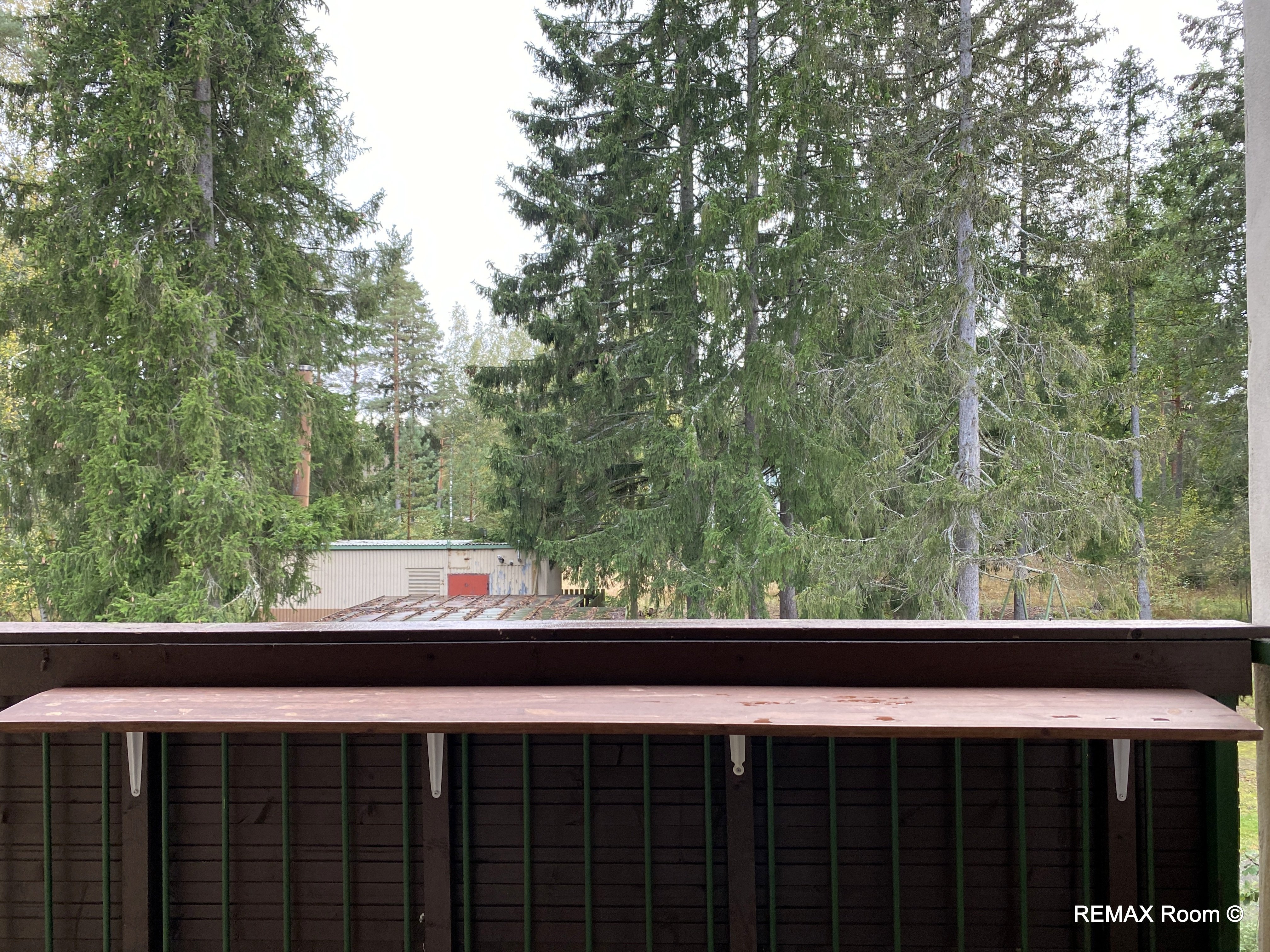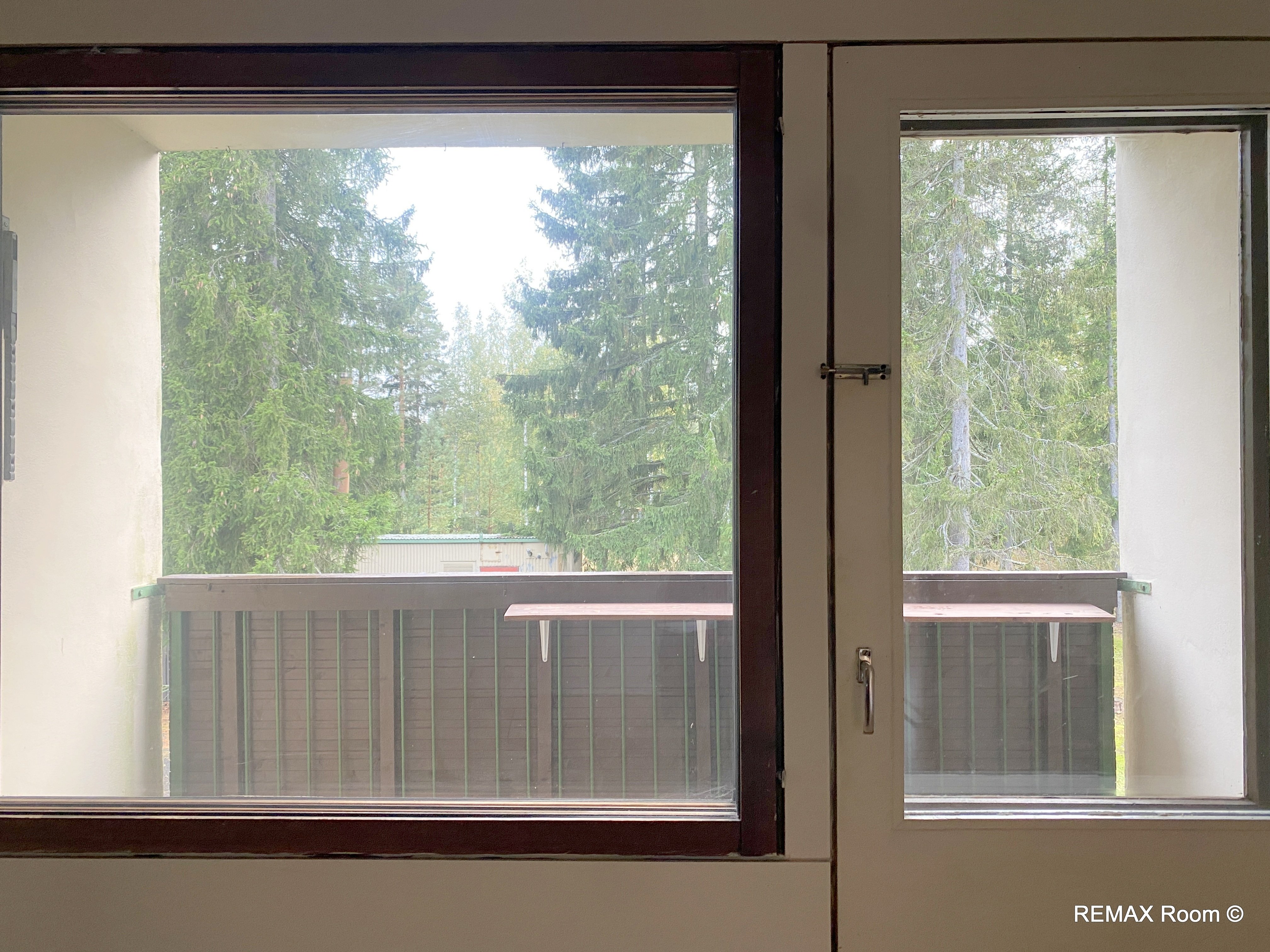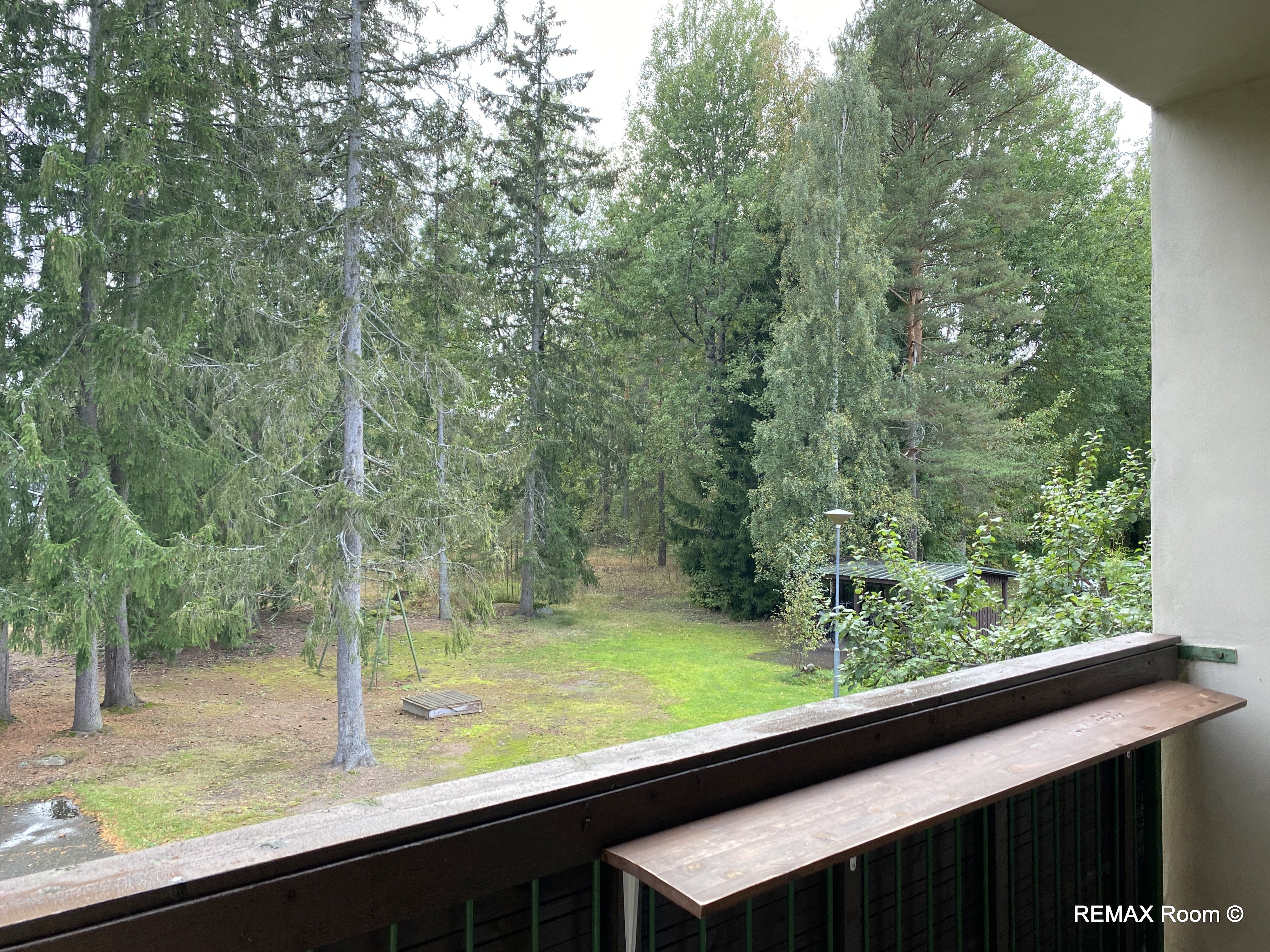 Parvekkeelta ja olohuoneesta takapihalle ja metsikköön. Keittiö ja makuuhuone tielle.