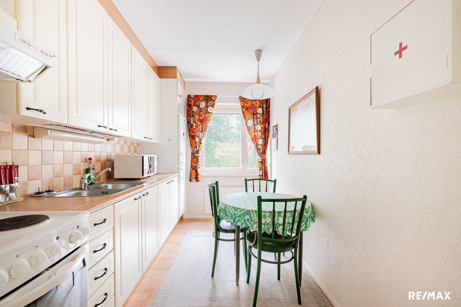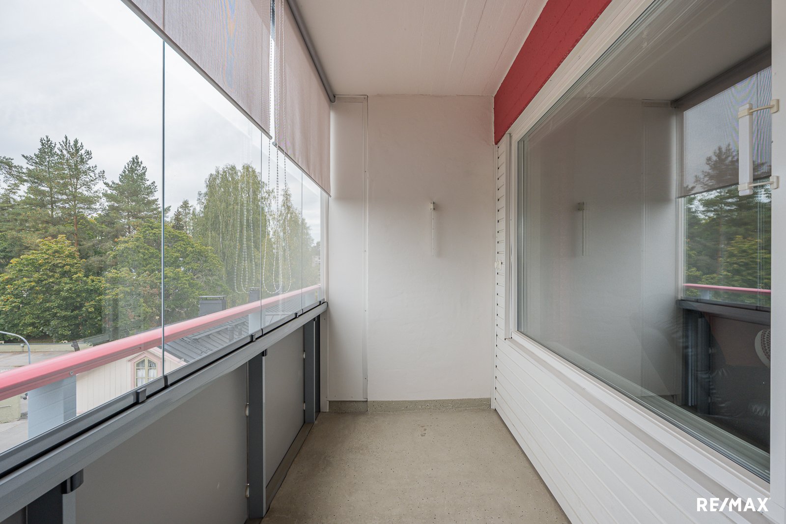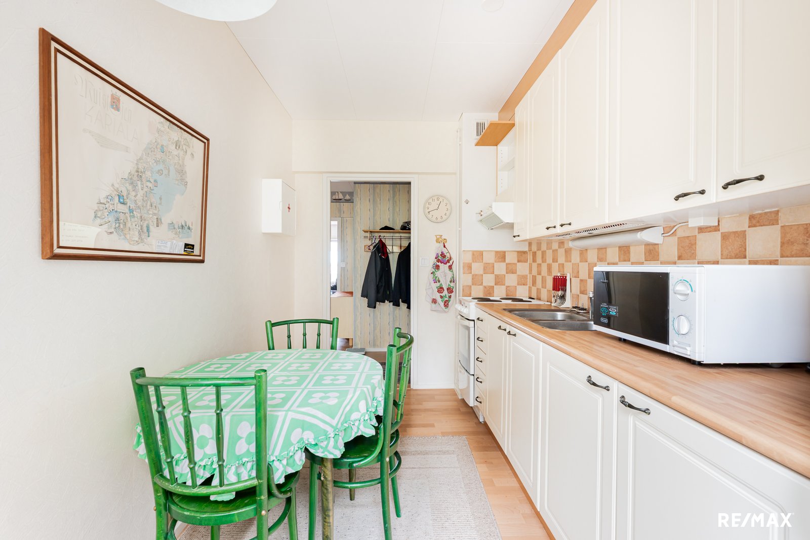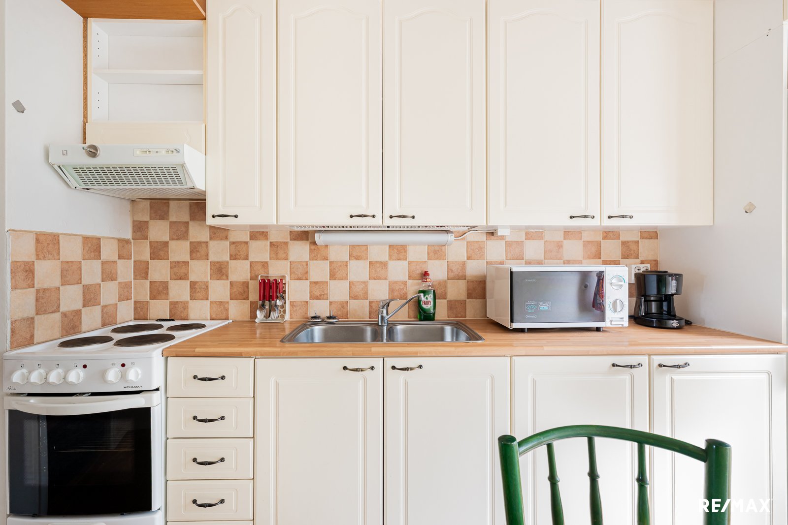 Keittiössä on perusvarustelu. Olohuoneesta on käynti lasitetulle parvekkeelle, josta voi nauttia rauhallisista hetkistä.