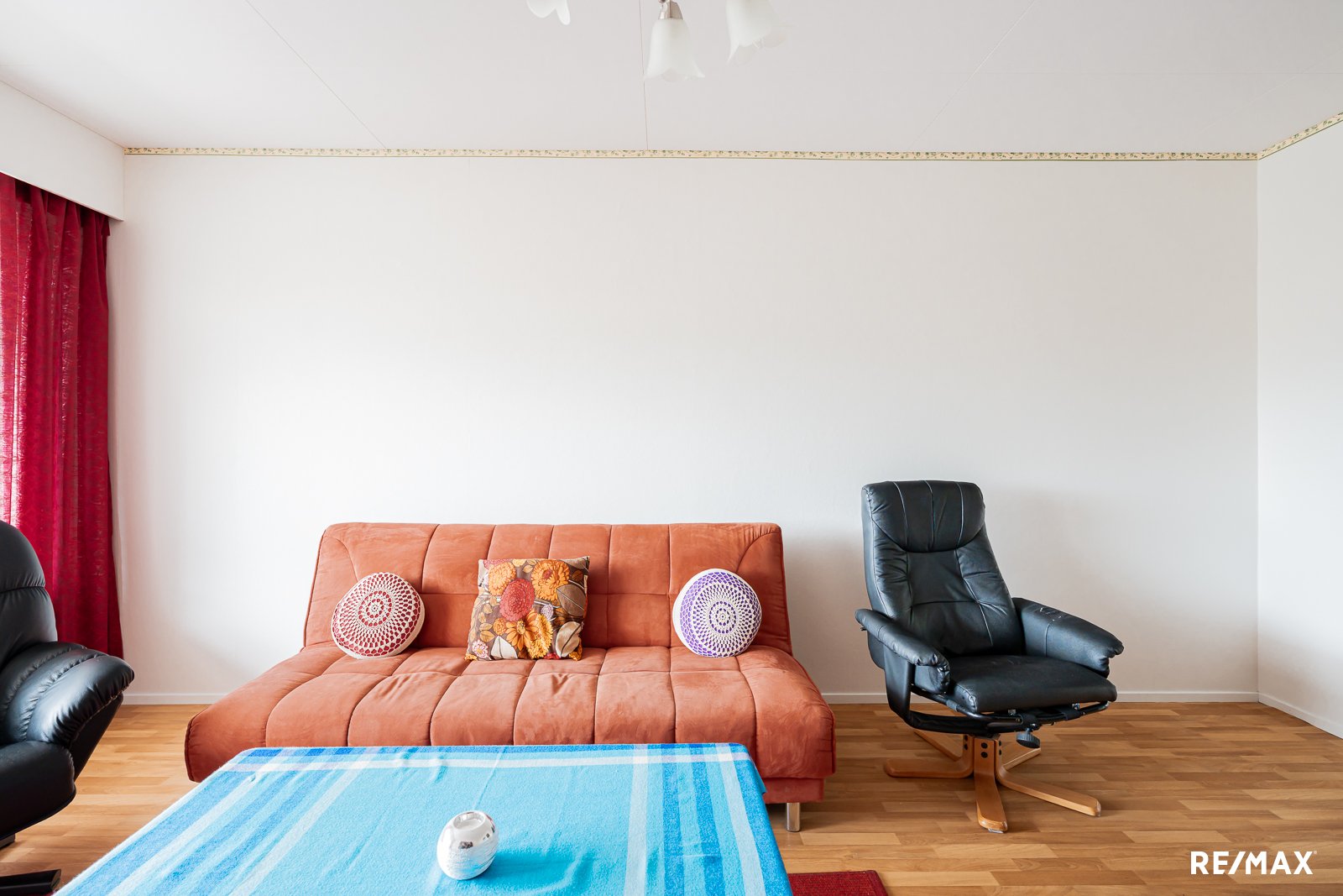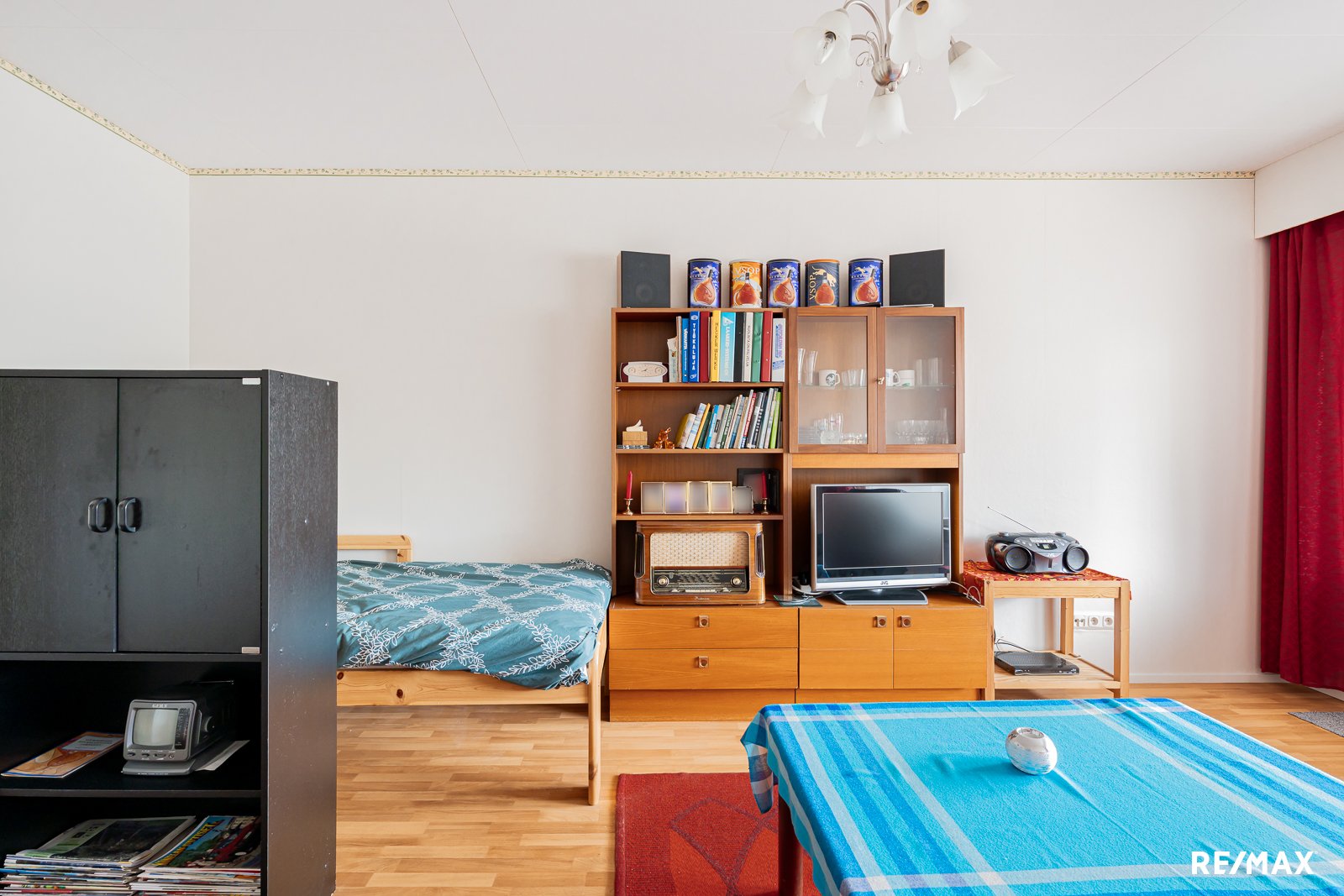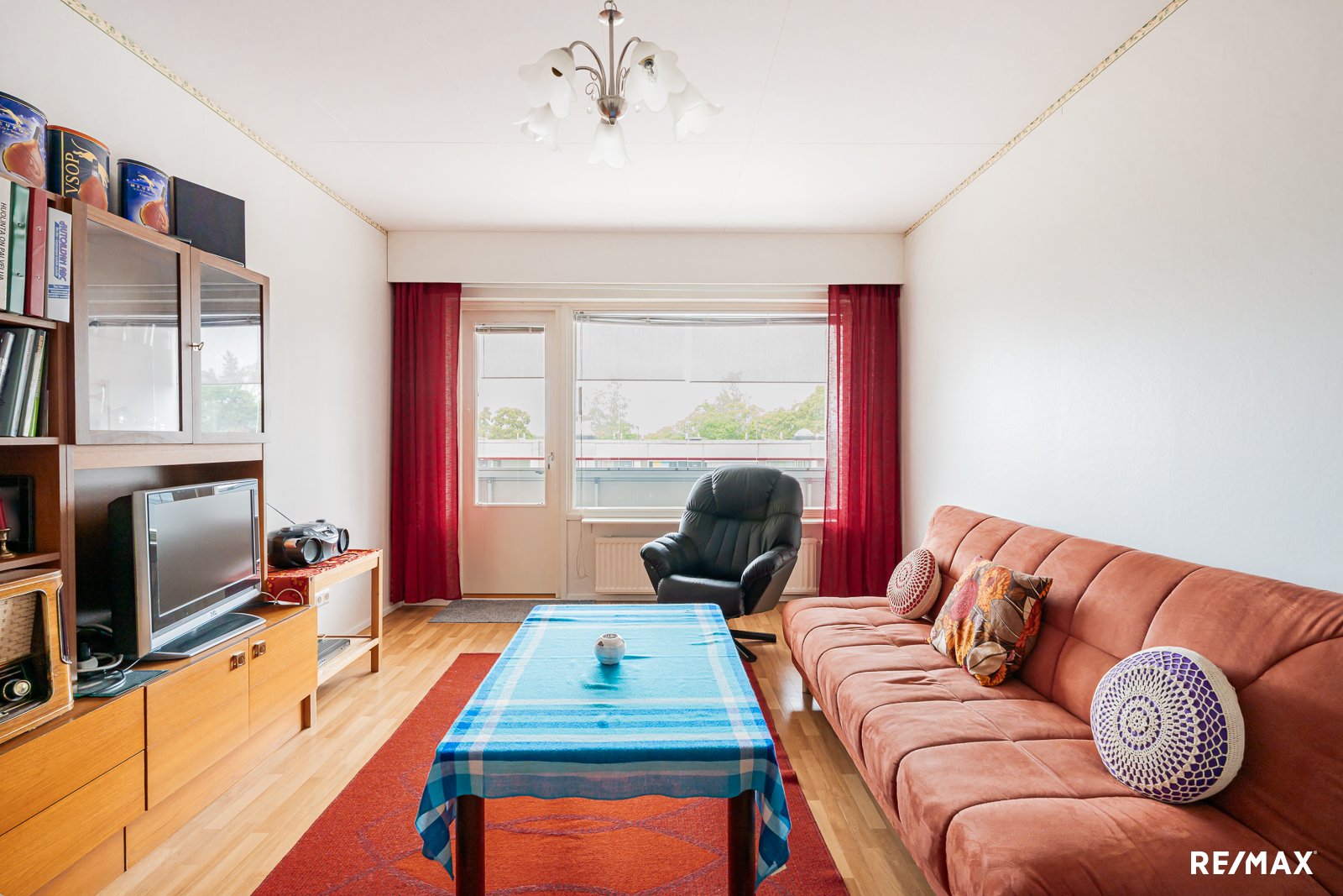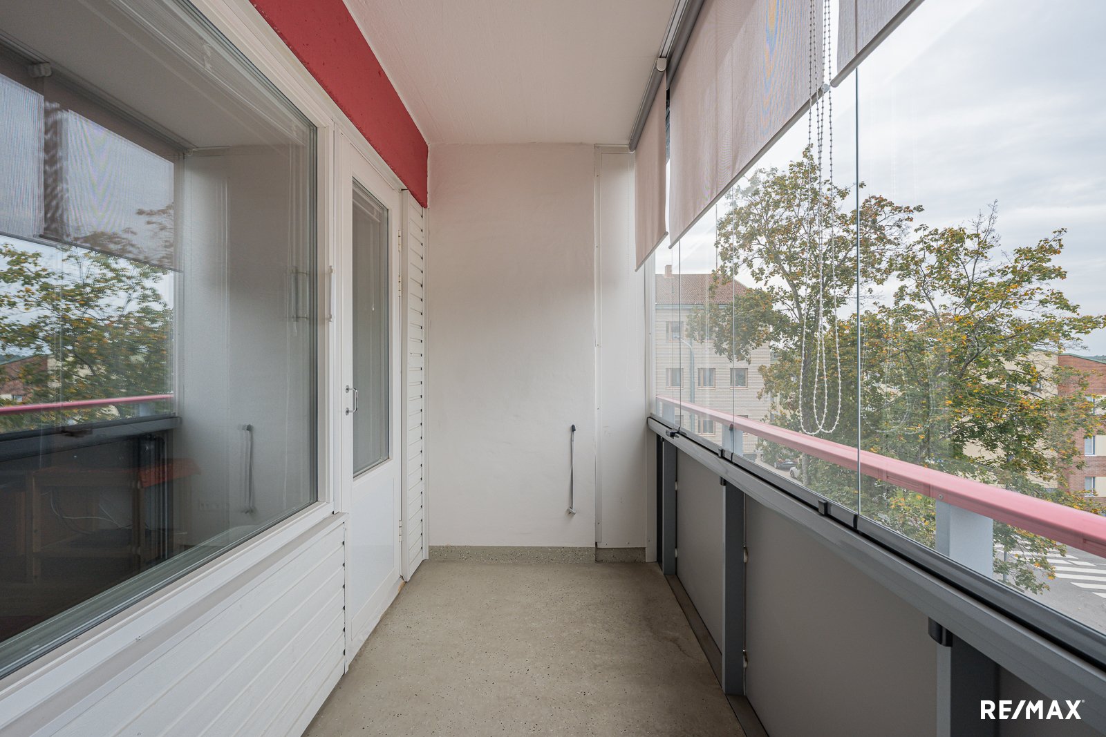 Keittiössä on perusvarustelu. Olohuoneesta on käynti lasitetulle parvekkeelle, josta voi nauttia rauhallisista hetkistä.