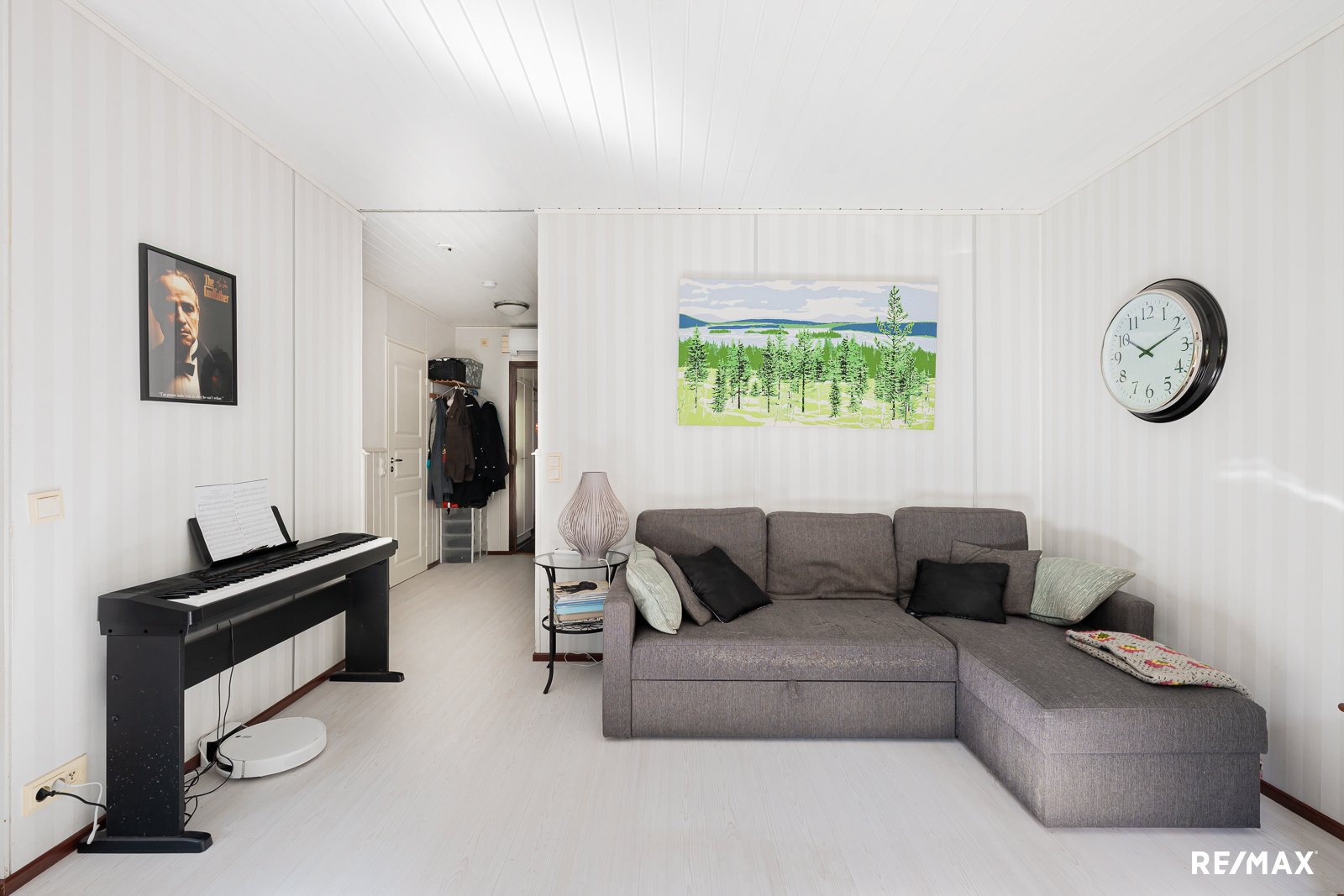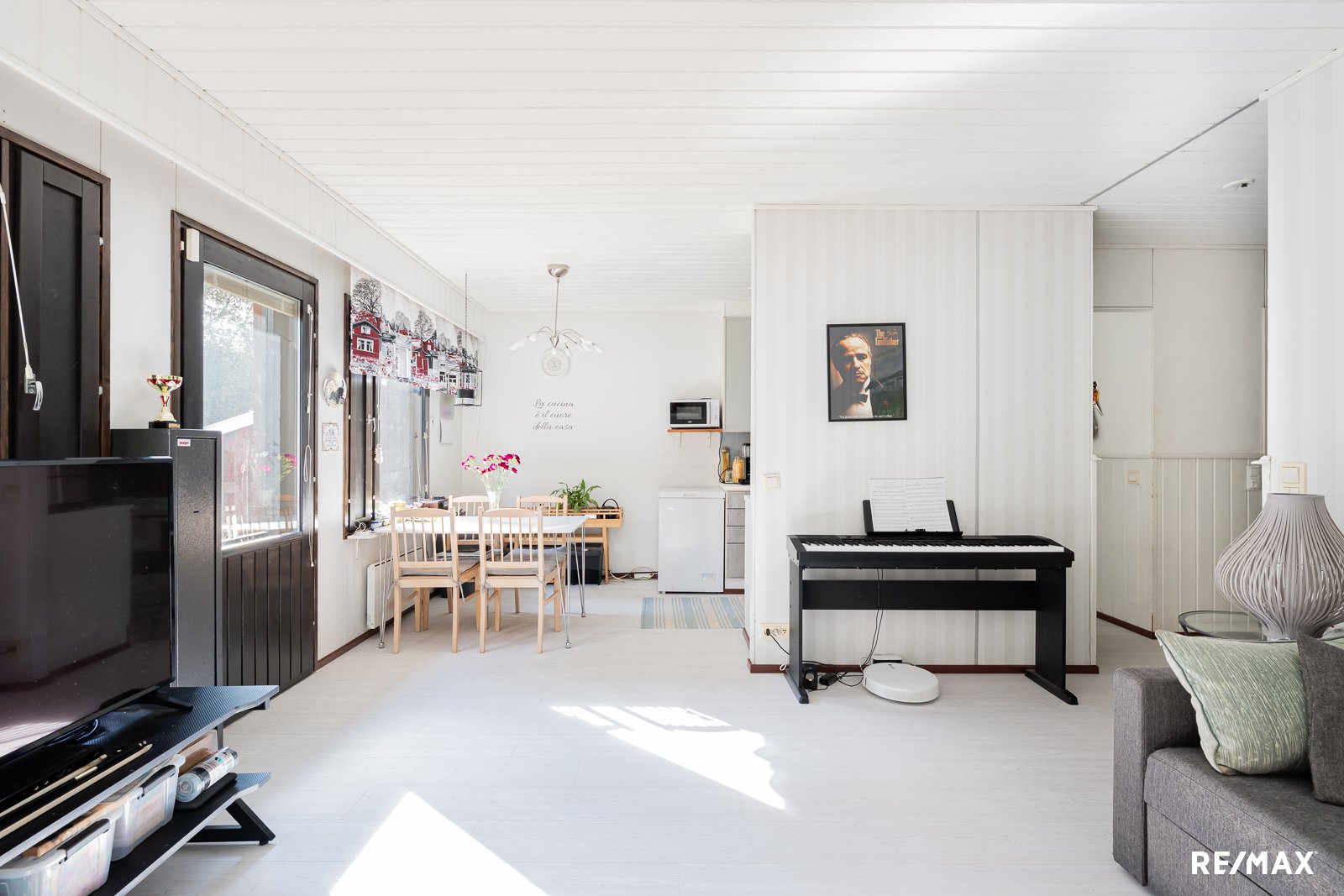 Kodin tilat ovat käytännölliset ja hyvin suunnitellut. Avara olohuone ja keittiö luovat yhdessä toimivan kokonaisuuden, jossa on helppo viihtyä. Keittiössä on kaikki tarpeellinen arjen kokkailuihin, ja sen laminaattilattia ja maalatut seinät tuovat raikkautta tilaan. Makuuhuoneessa on vaatehuone, joka tarjoaa runsaasti säilytystilaa.