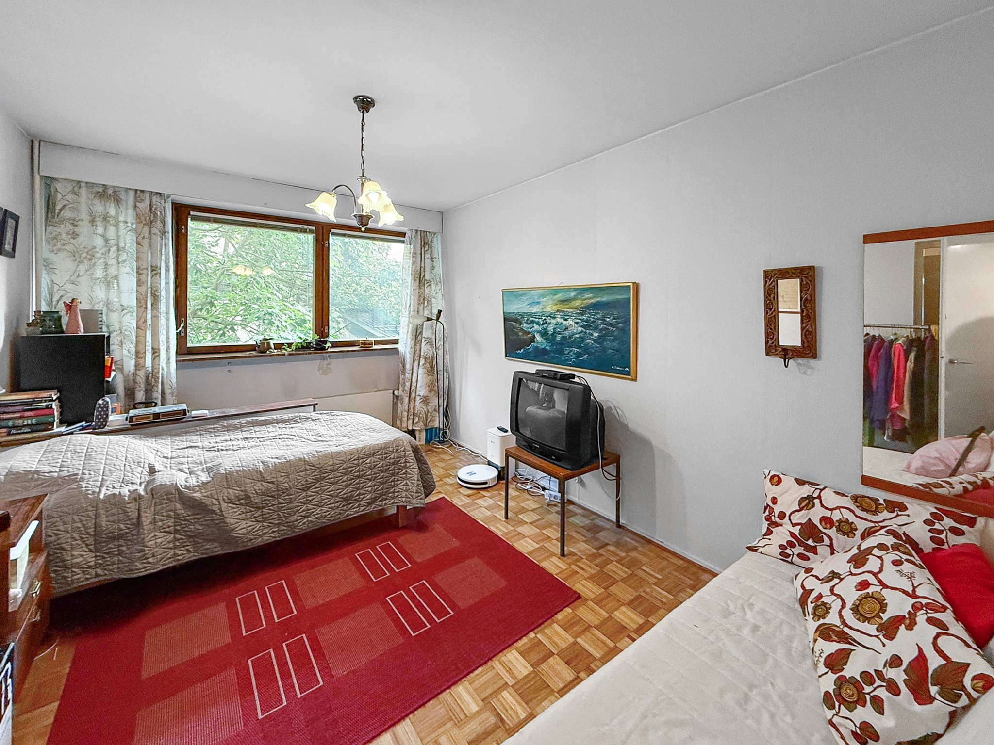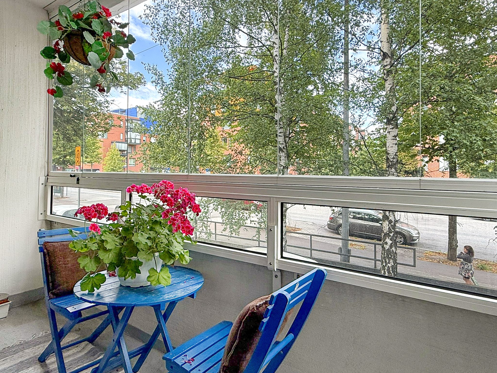 Kahden sisäänkäyntinsä ansiosta huoneiston toinen makuuhuone omalla kylpyhuoneella sopii hyvin esim. kotivastaanotoksi, vuokrattavaksi yksiöksi tai vaikkapa teinin ensiasunnoksi. Huoneiston tilava, lasitettu parveke avautuu kauniisiin kaupunkinäkymiin tuoden kivasti lisätilaa pitkälle syksyyn. Makuuhuoneiden ja keittiön ikkunat avautuvat rauhallisen sisäpihan suuntaan. Huoneisto sijaitsee taloyhtiön ensimmäisessä asuinkerroksessa, yleisten tilojen yläpuolella. Ei siis katutasolla.