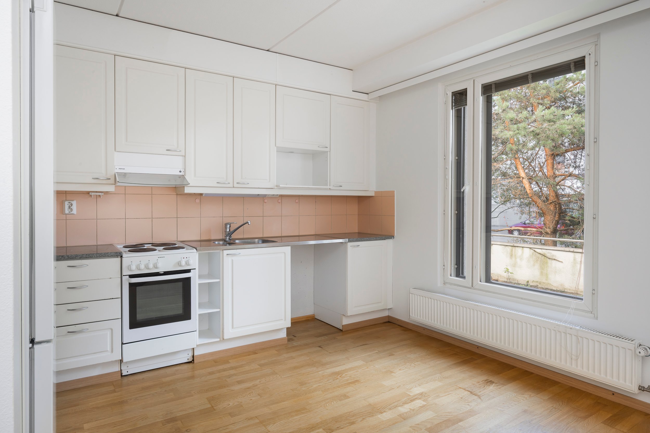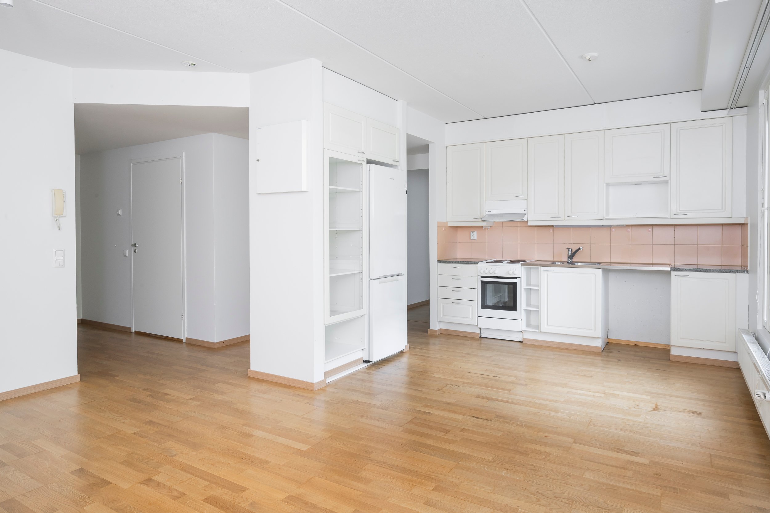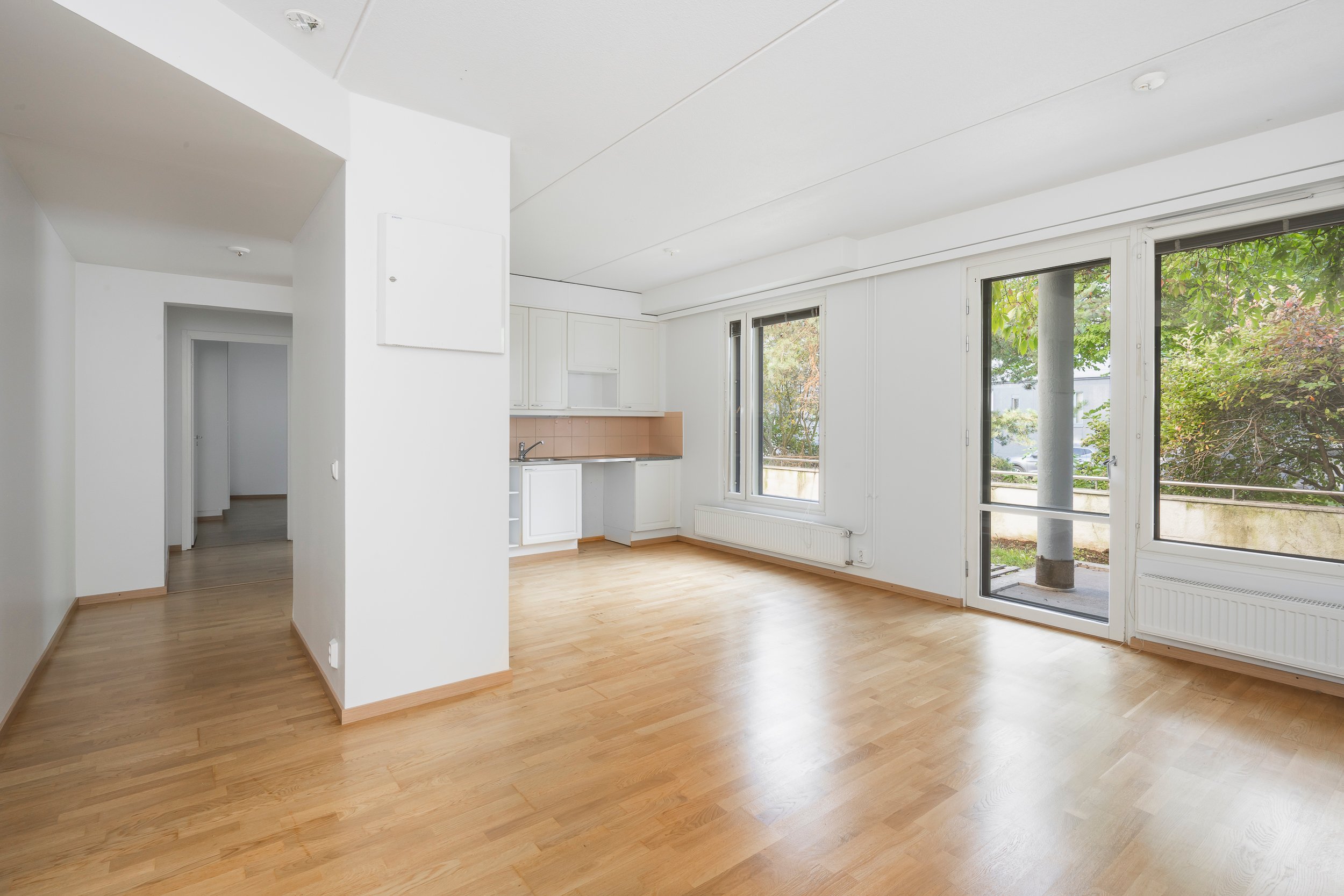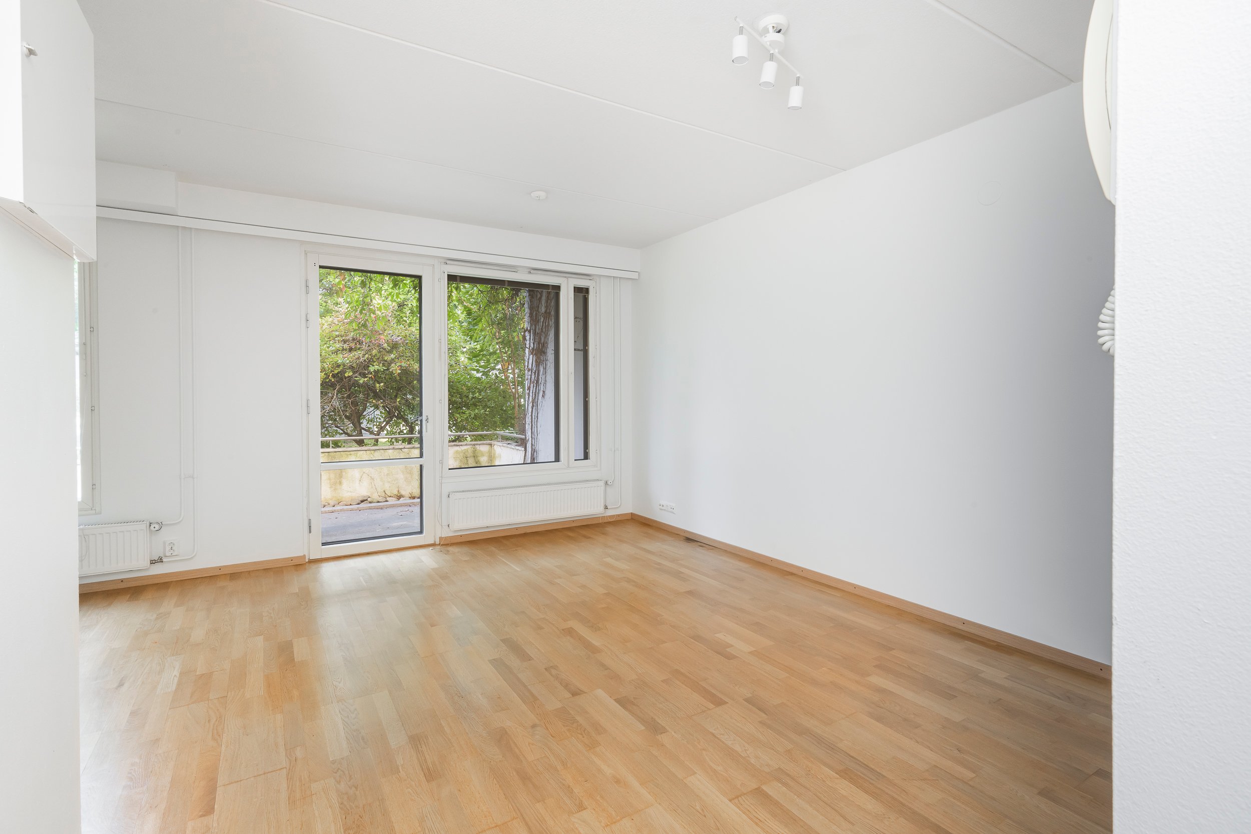 Asunnossa on juuri hiottu parkettilattia ja seinät maalattu, joten pinnat ovat raikkaat ja siistit – tänne pääsee muuttamaan ilman suurempia remonttihuolia.