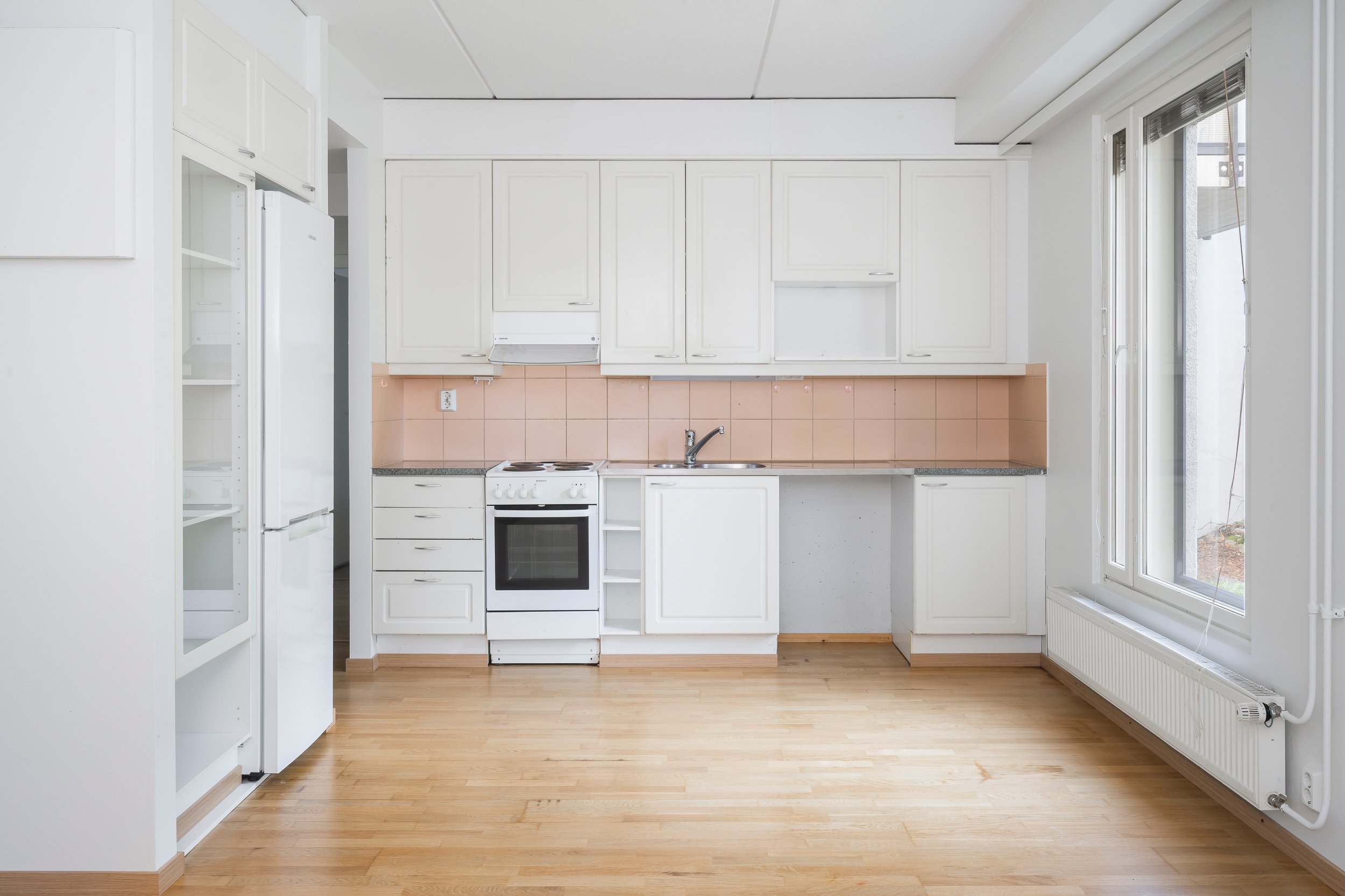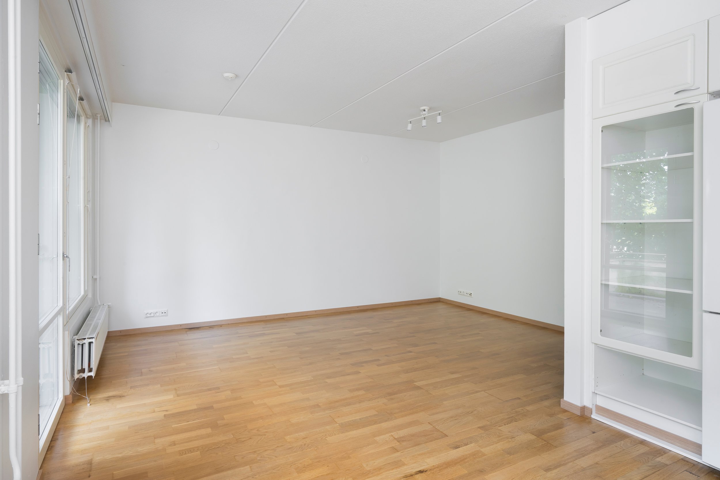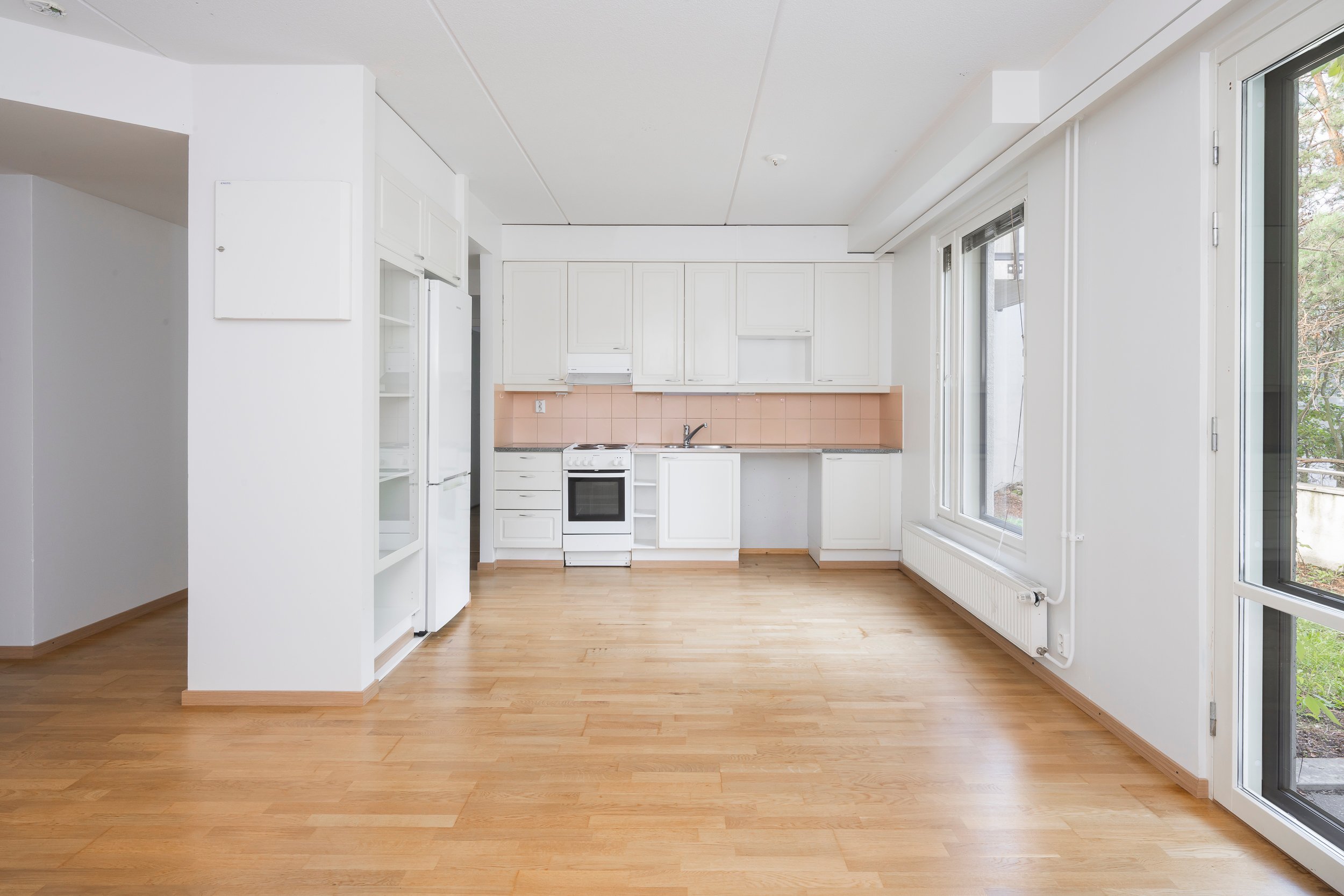 Asunnossa on juuri hiottu parkettilattia ja seinät maalattu, joten pinnat ovat raikkaat ja siistit – tänne pääsee muuttamaan ilman suurempia remonttihuolia.