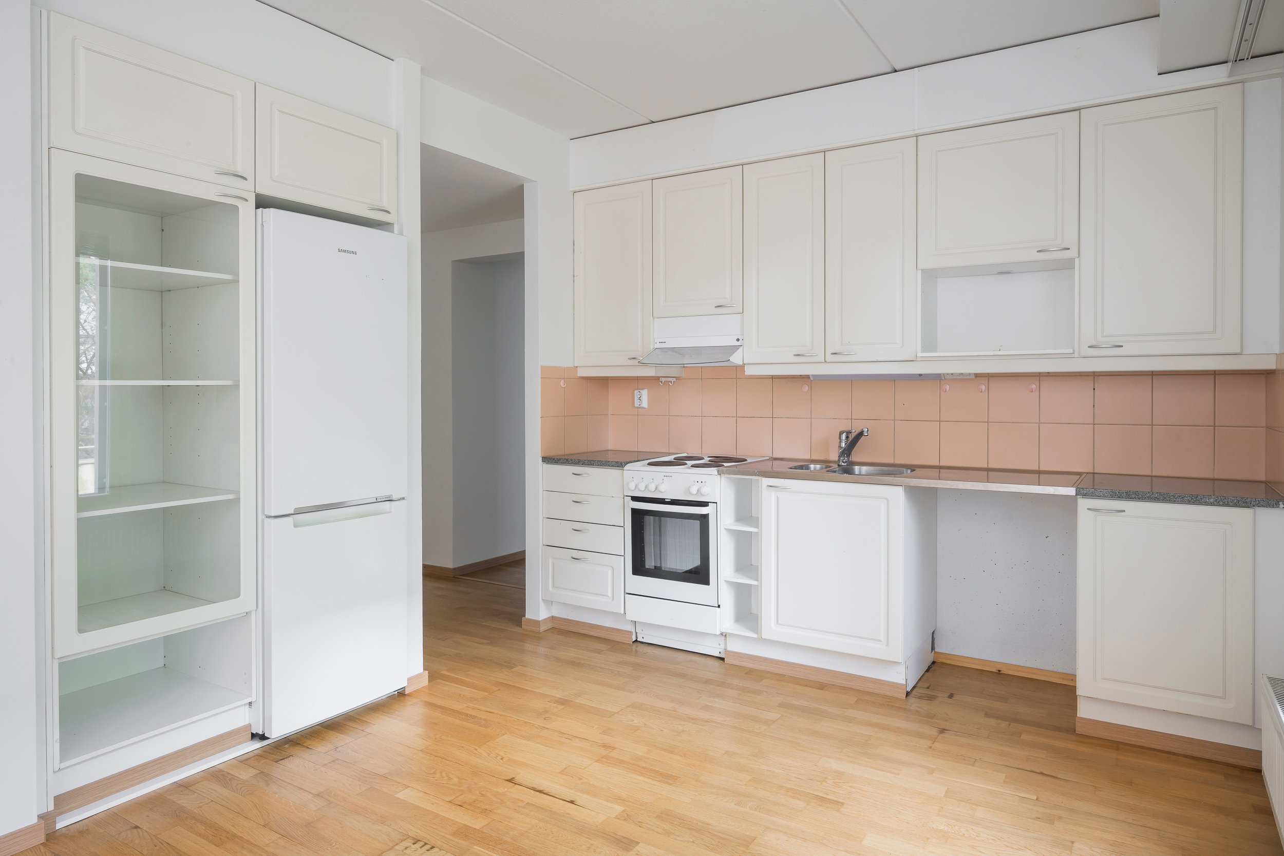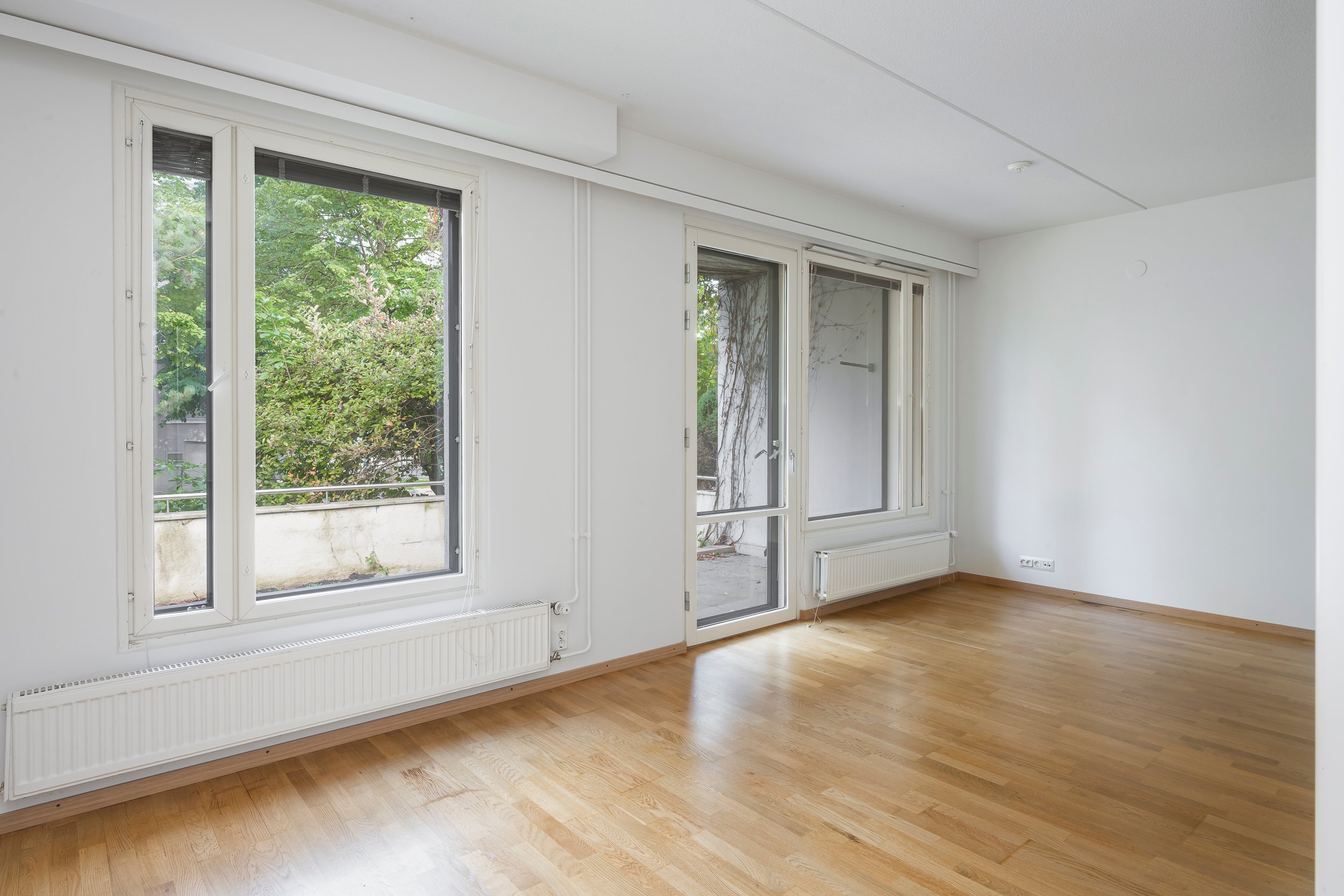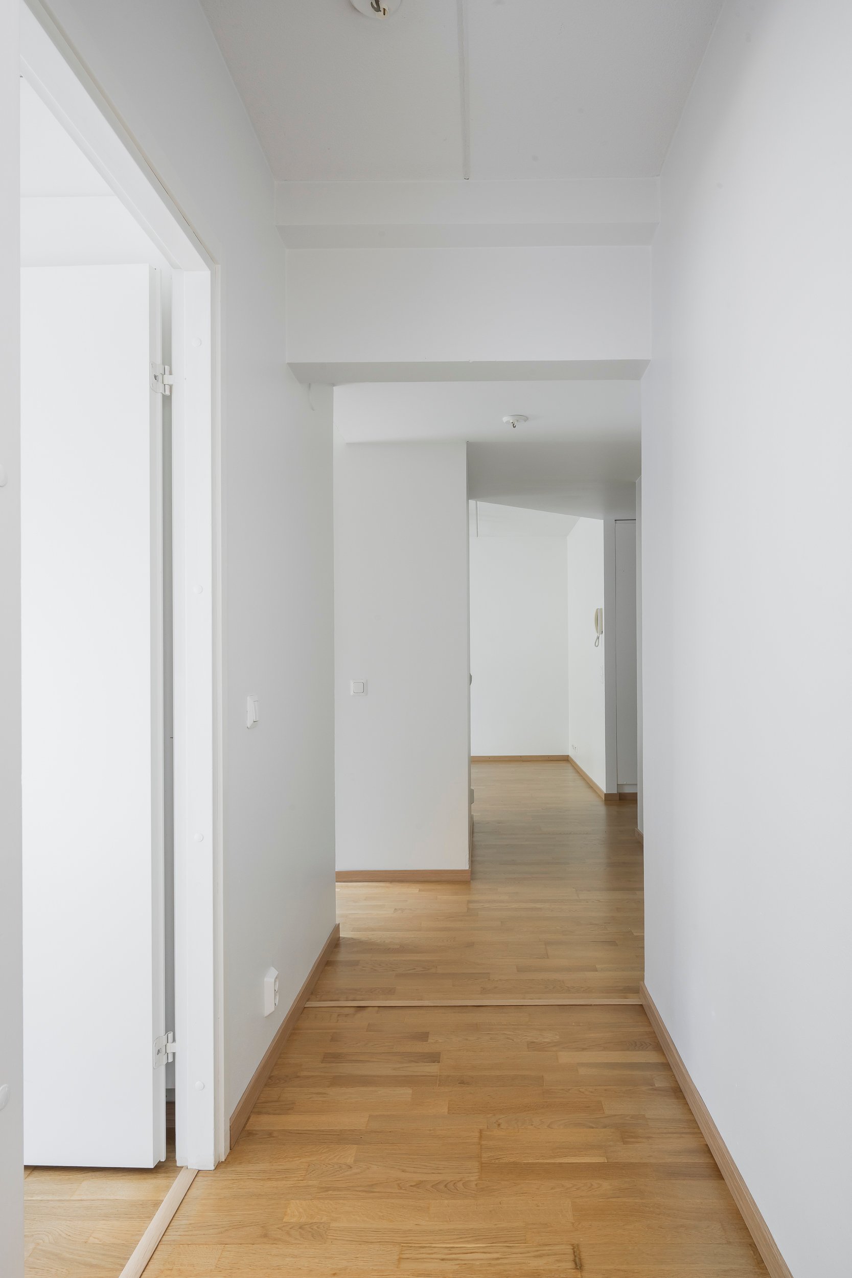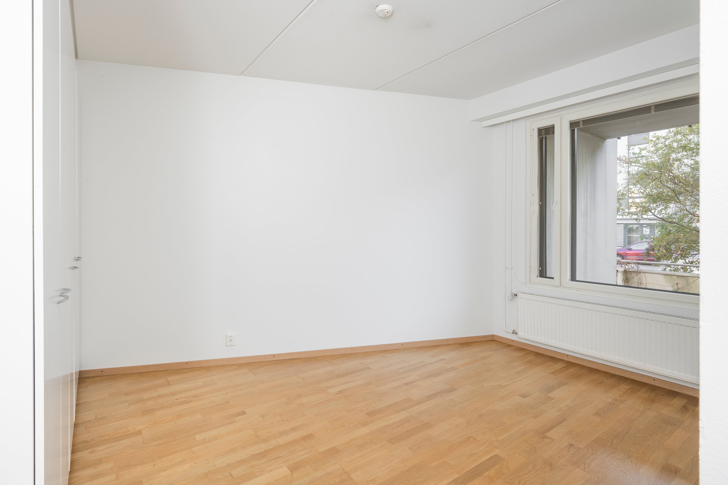 Asunnossa on juuri hiottu parkettilattia ja seinät maalattu, joten pinnat ovat raikkaat ja siistit – tänne pääsee muuttamaan ilman suurempia remonttihuolia.