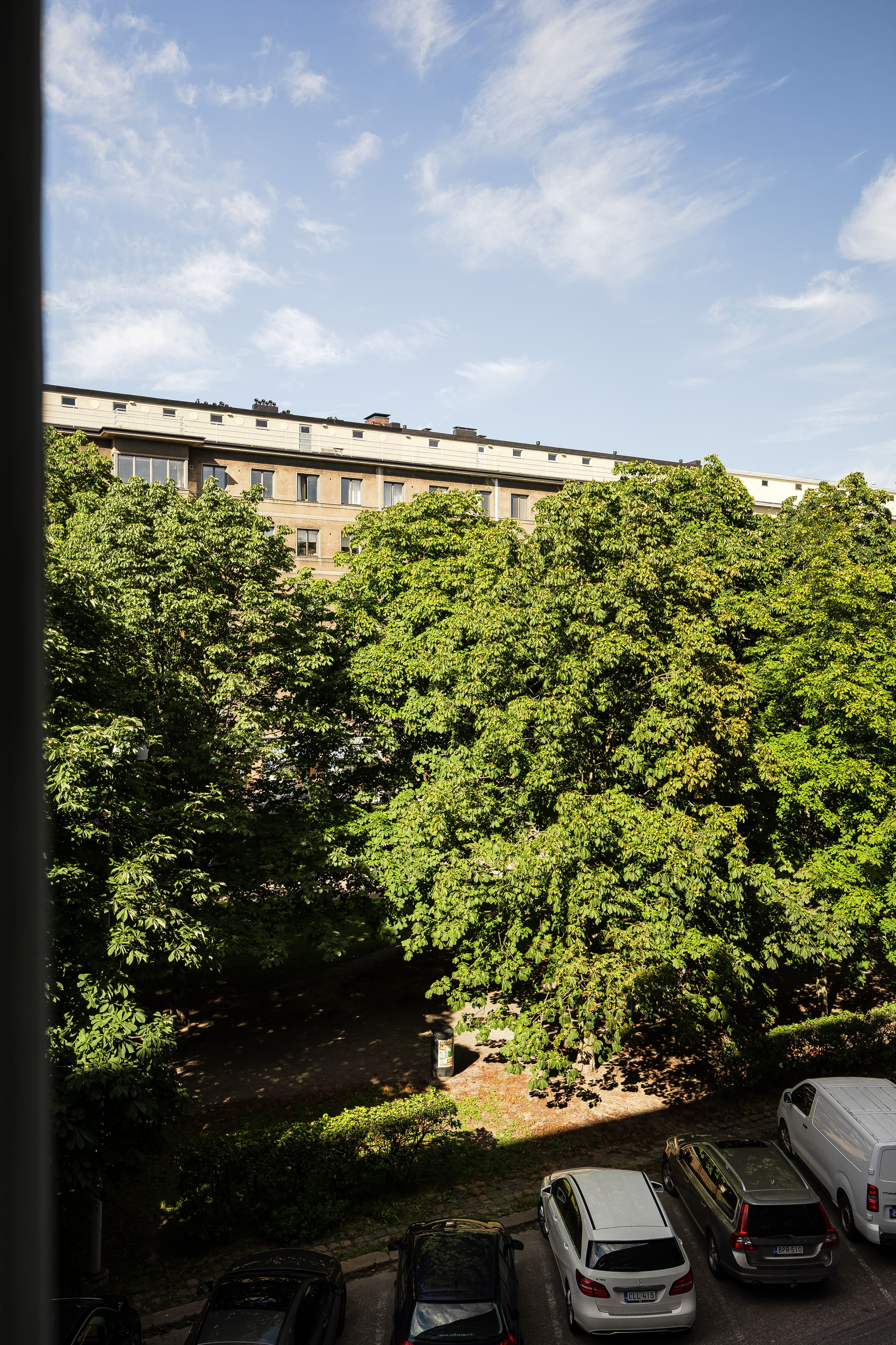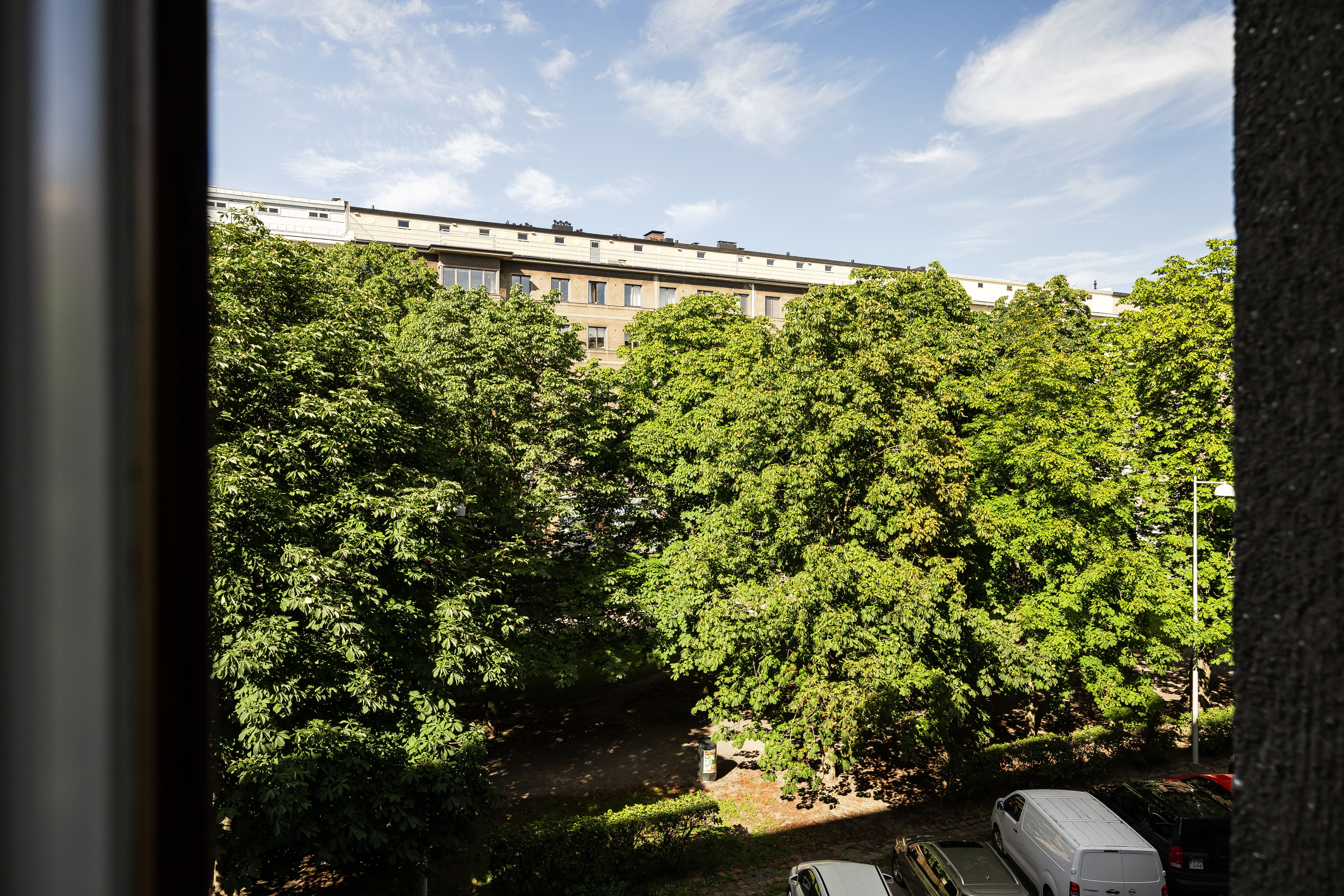 Kolmannessa kerroksessa sijaitsevasta asunnosta on upeat näkymät Hesperian puiston vehreiden kastanjapuiden lehvästöihin.