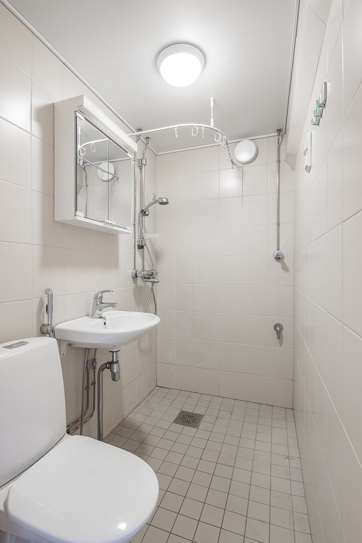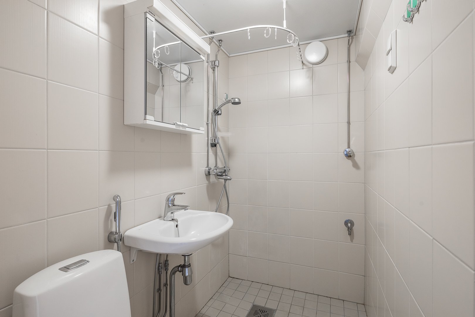 WC-istuin, suihku, pesukoneliitäntä, bidee-suihku, peilikaappi ja pesuallas