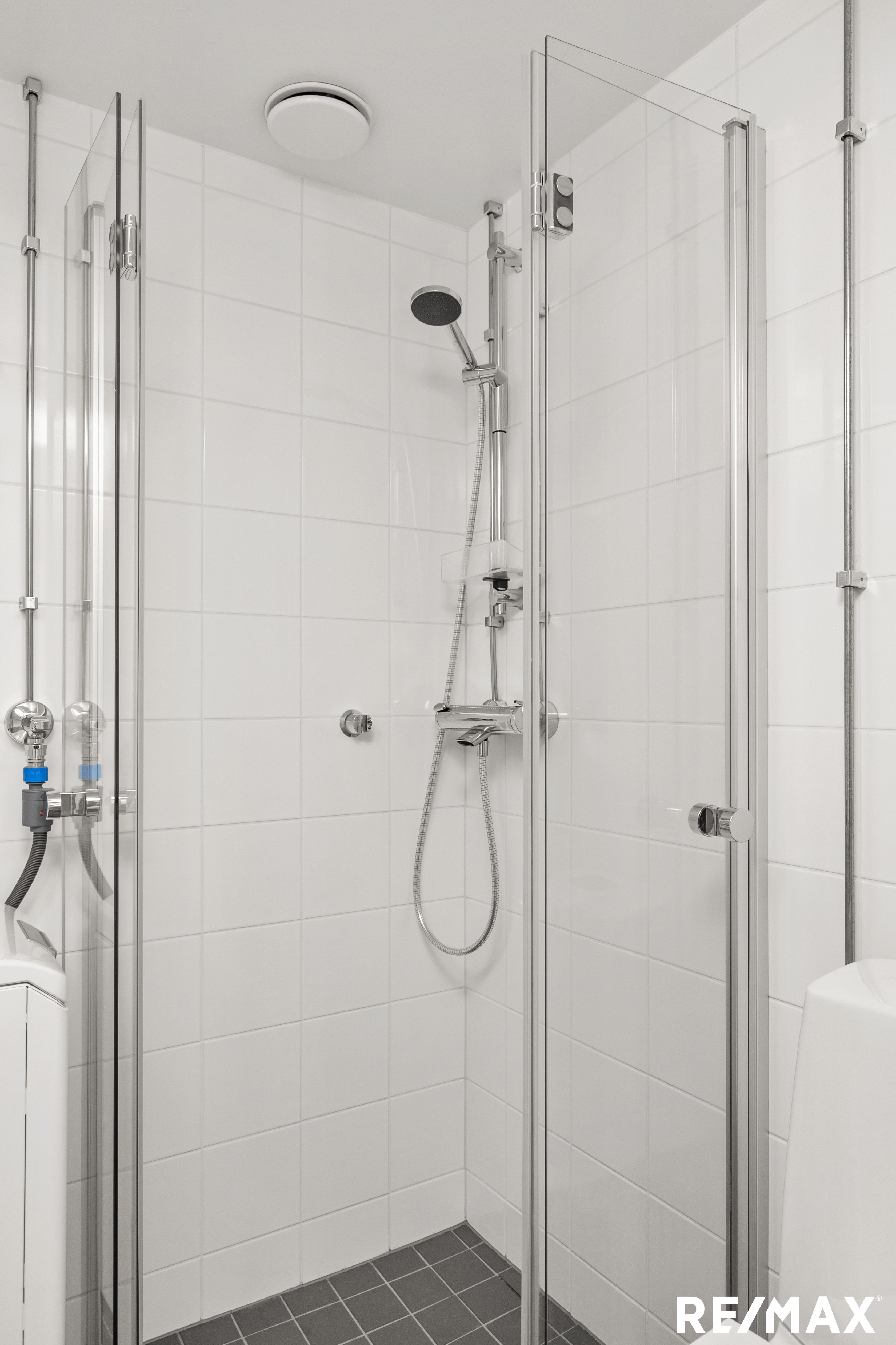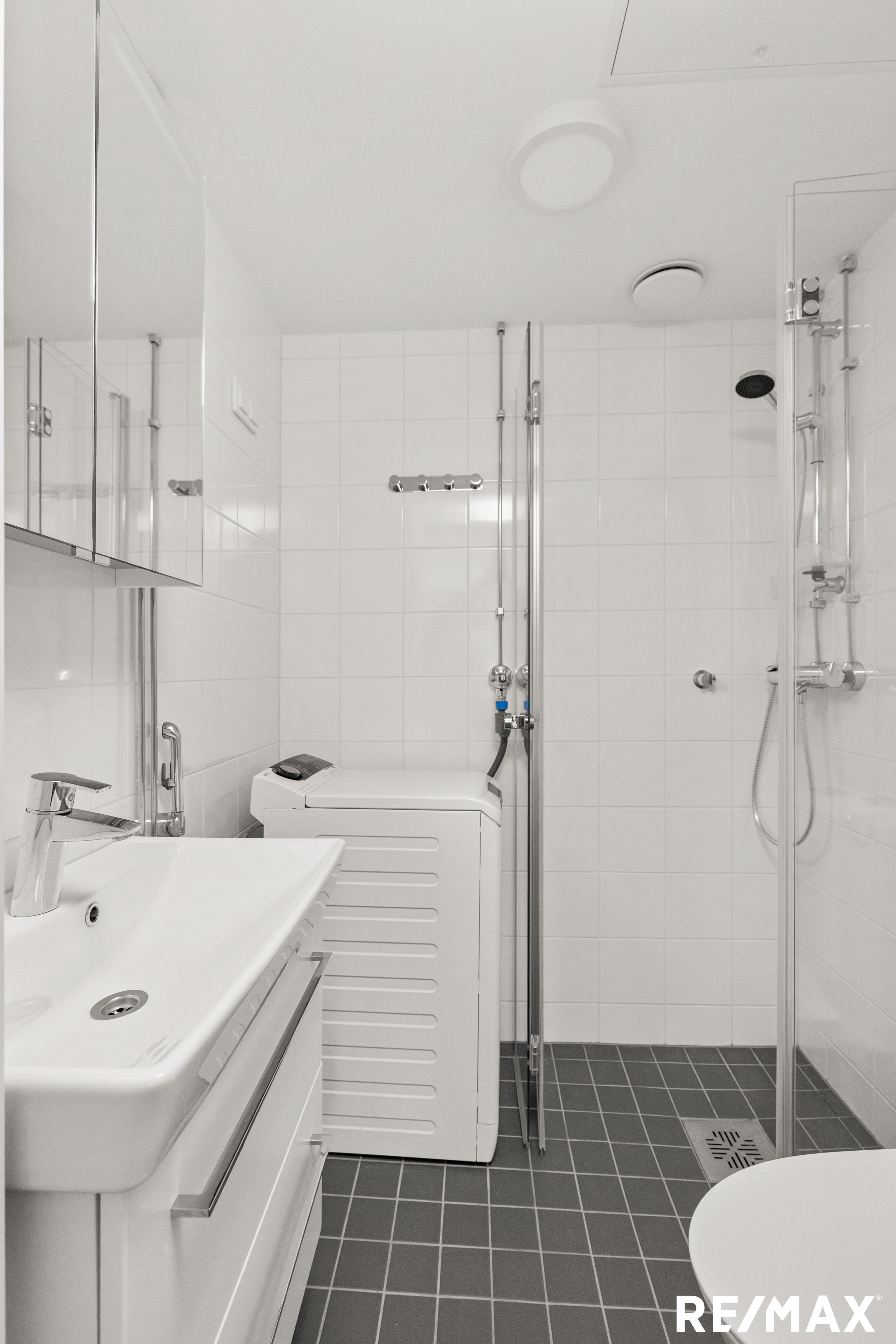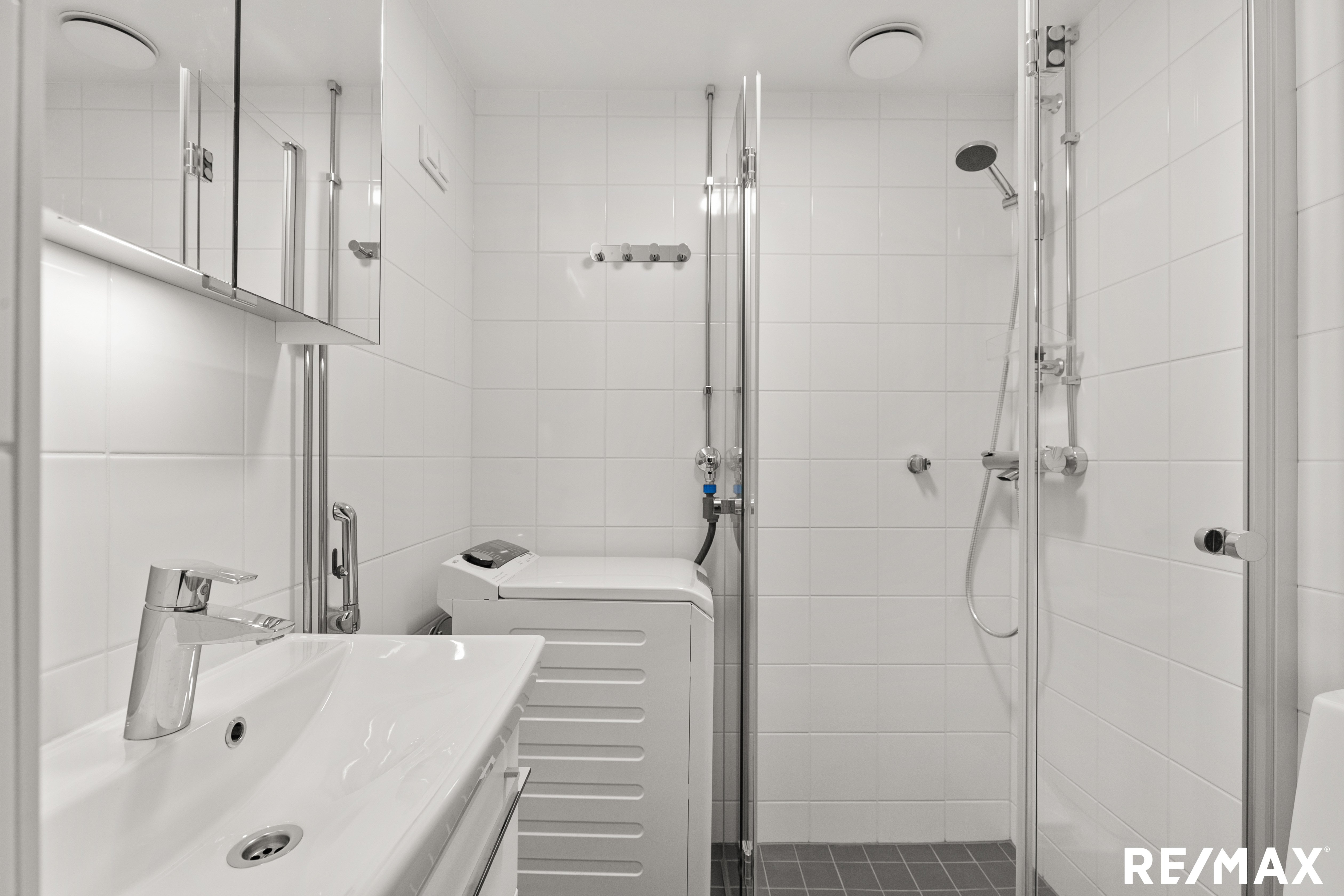 Moderni kylpyhuone yhdistää tyylikkyyden ja käytännöllisyyden, vaaleat laatat, moderni kalustus ja tilava suihku luovat raikkaan kokonaisuuden ja pesukoneelle tai pesutornille on oma paikkansa. Säilytystilaa löytyy eteisen kaapistoista sekä lisätilaa säilytykseen tarjoaa taloyhtiön kellari- ja vinttikomerot.