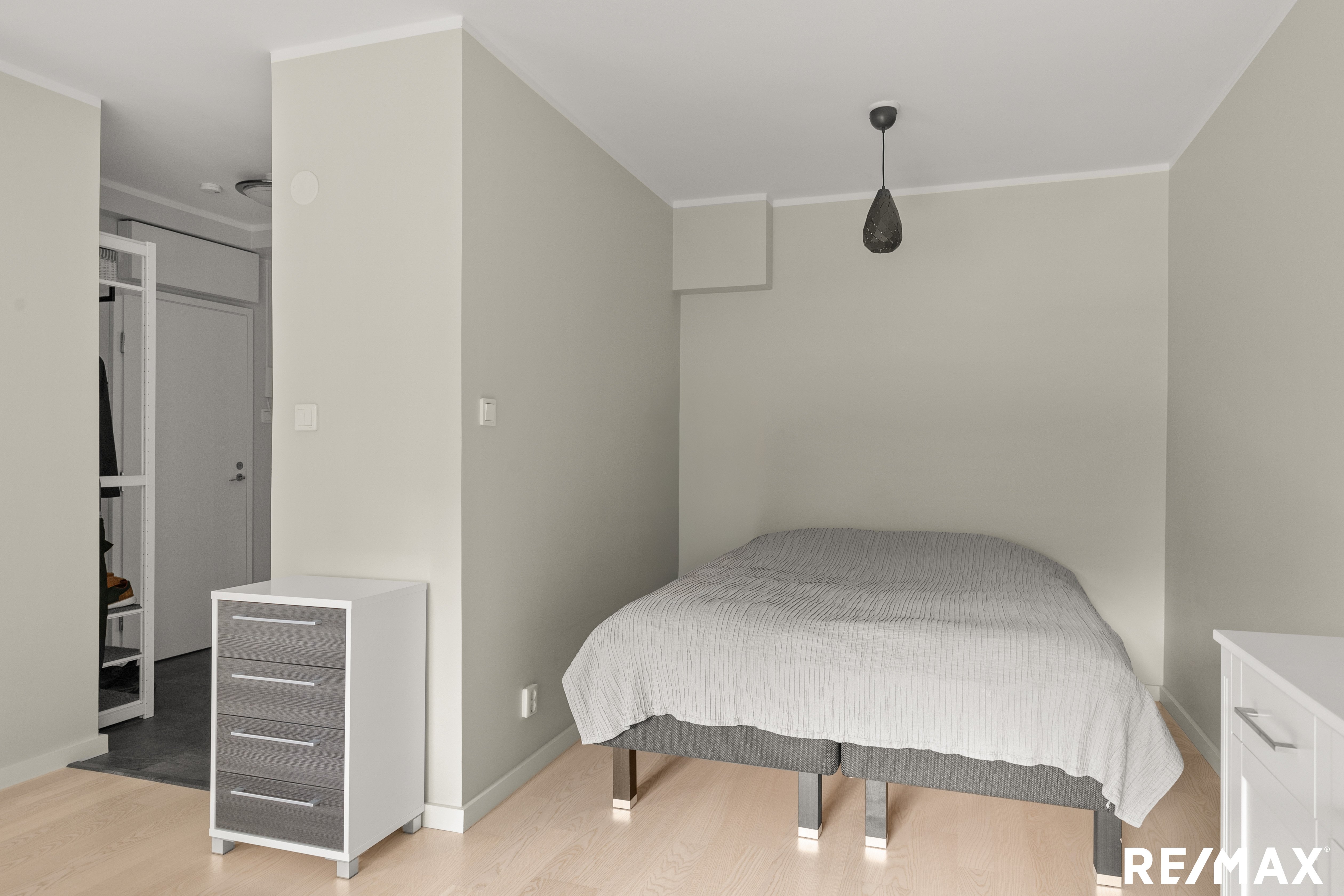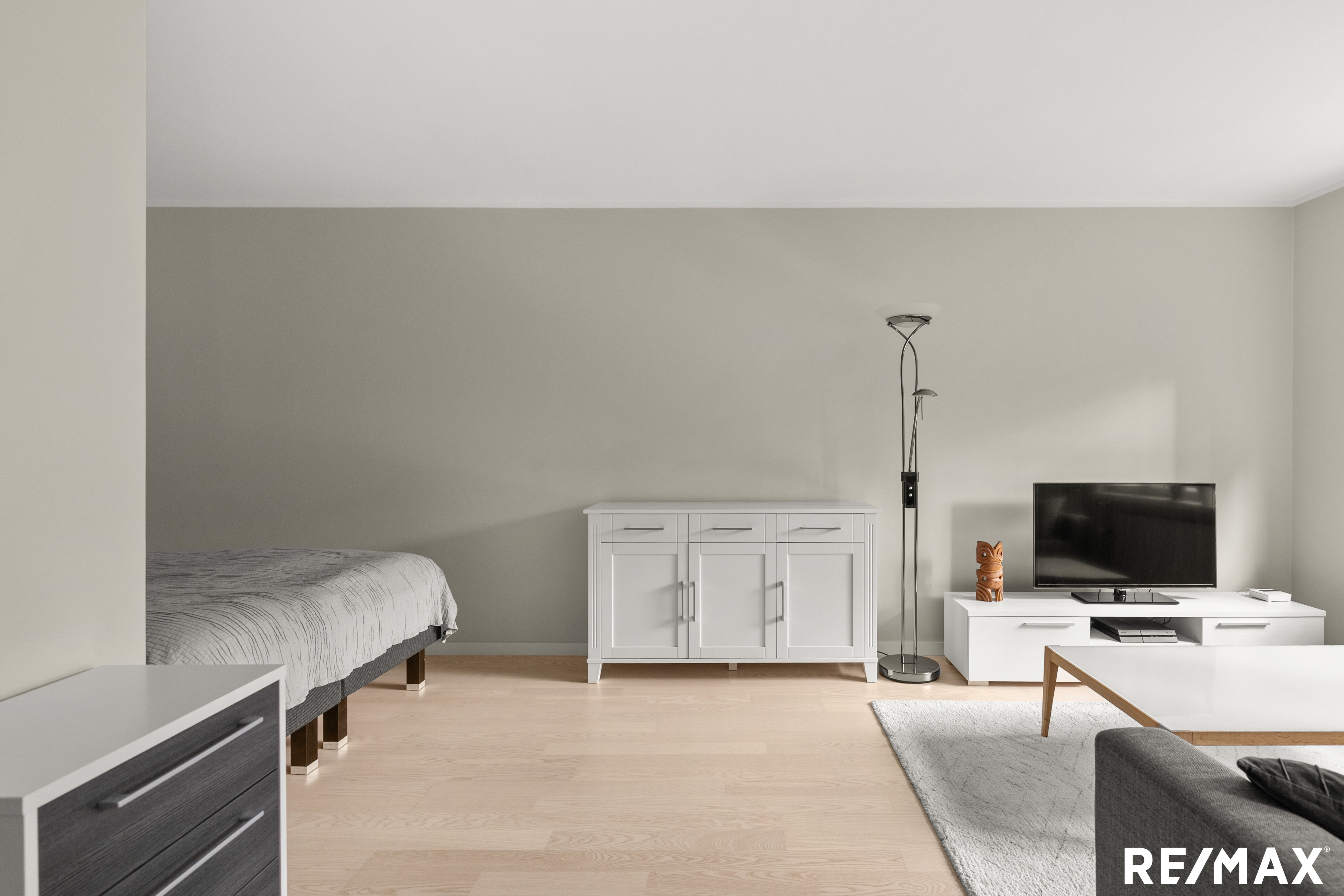 Avara olohuone tarjoaa monipuoliset sisustusmahdollisuudet. Makuualkovi sijoittuu luonnollisesti osaksi kokonaisuutta ja sinne mahtuu helposti isokin sänky. Halutessasi tila voidaan rajata näyttävillä lasiovilla omaksi huoneeksi.