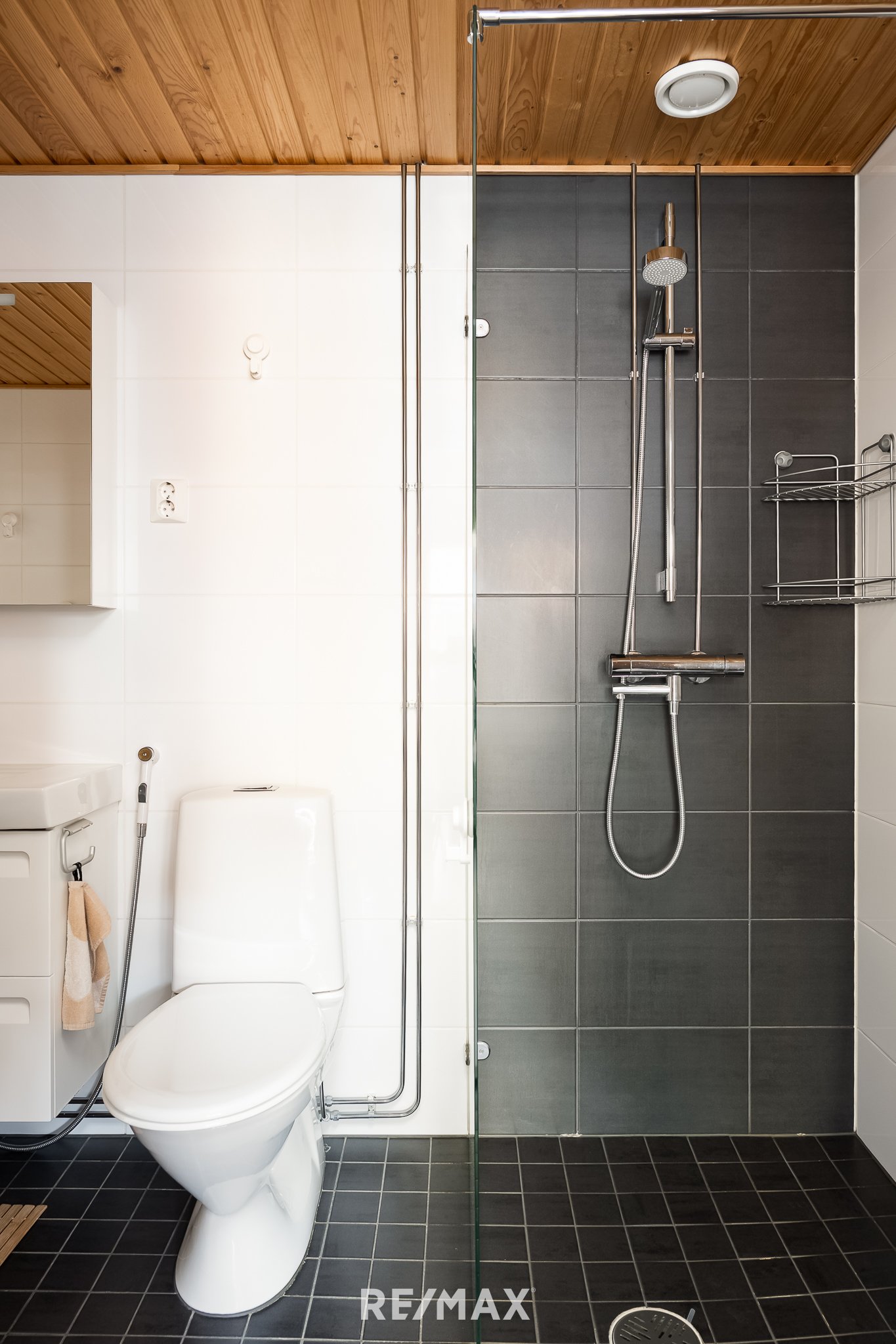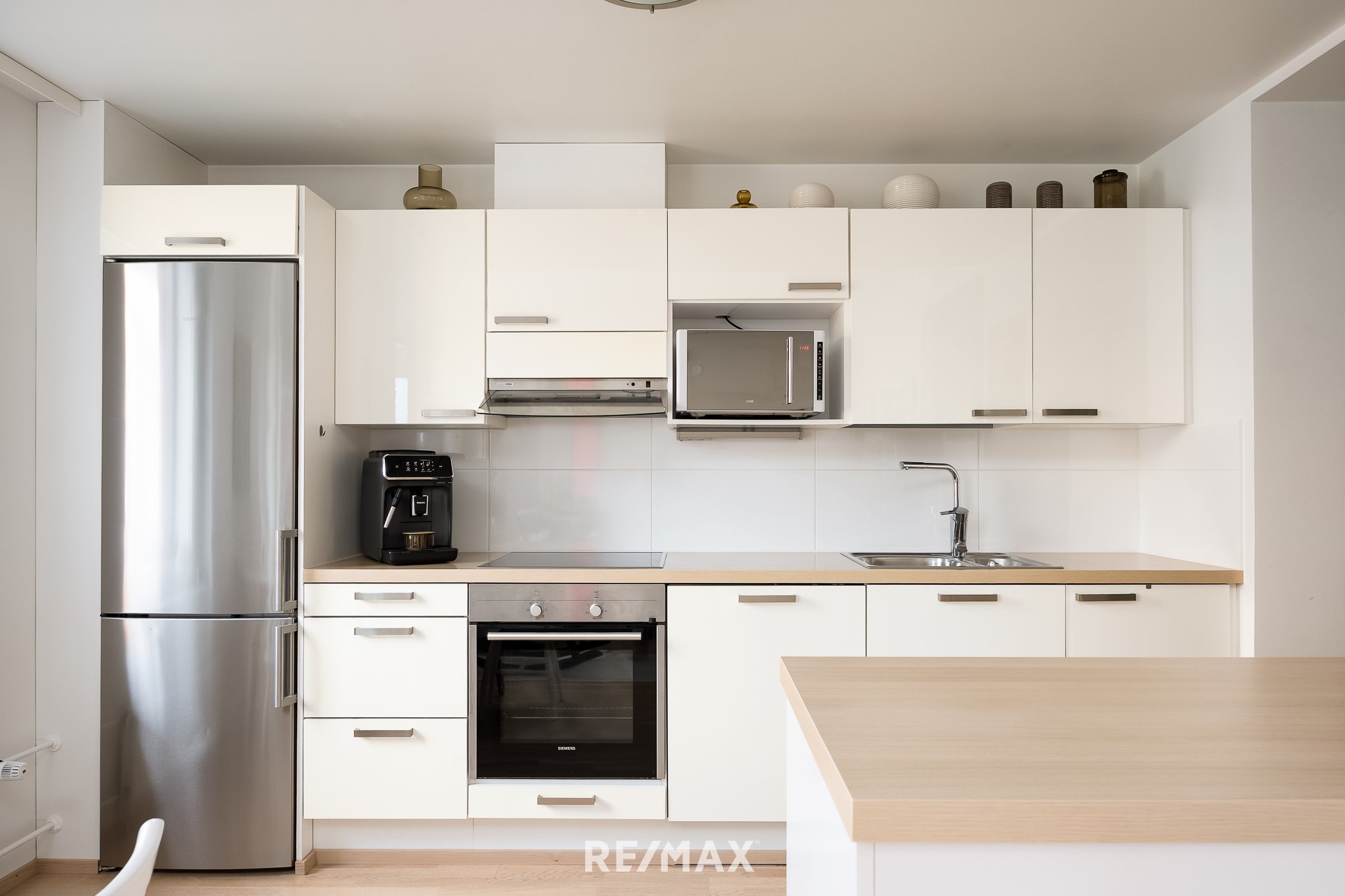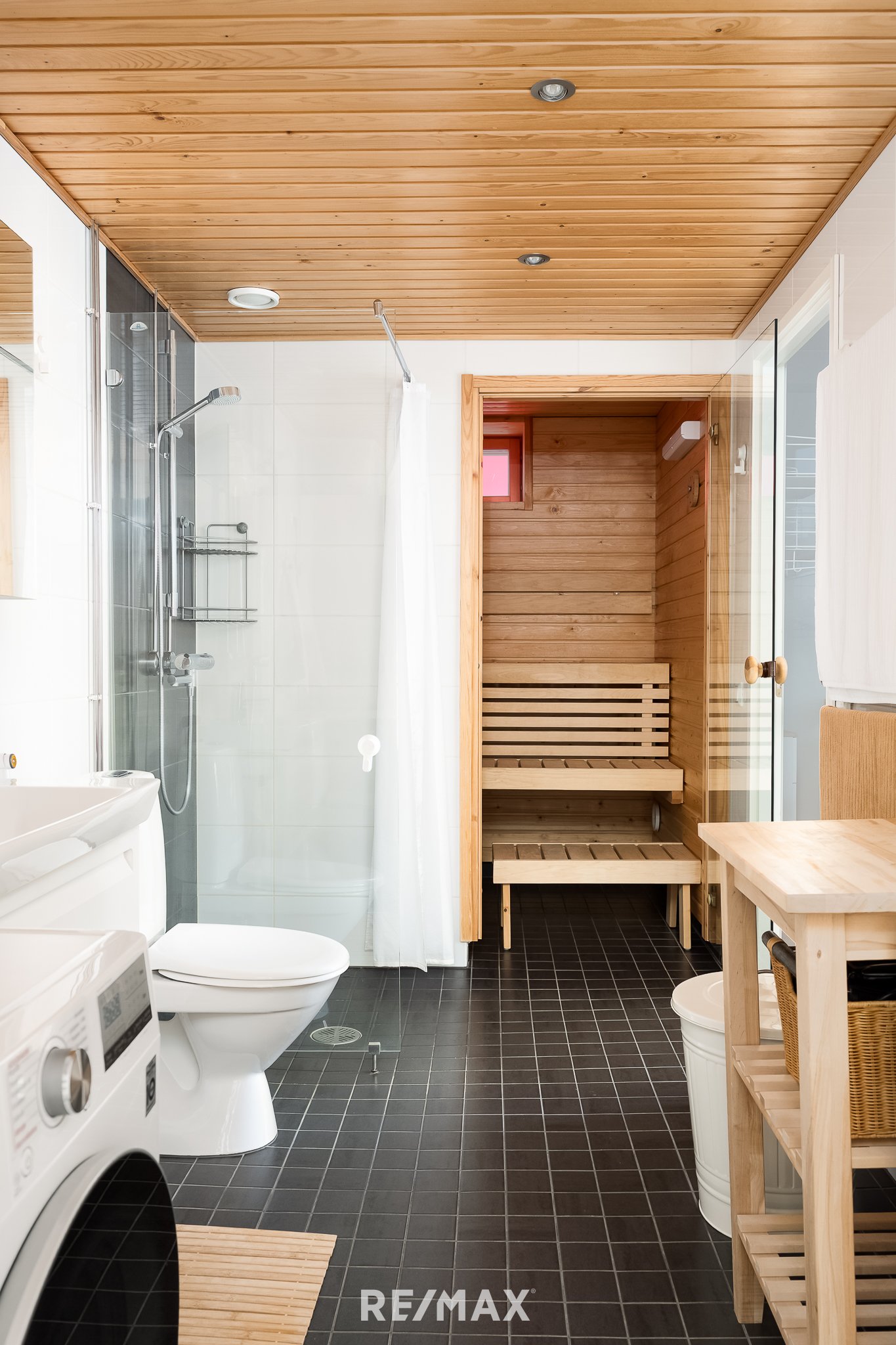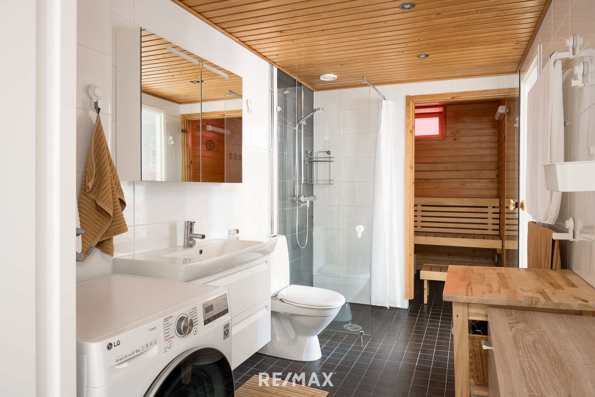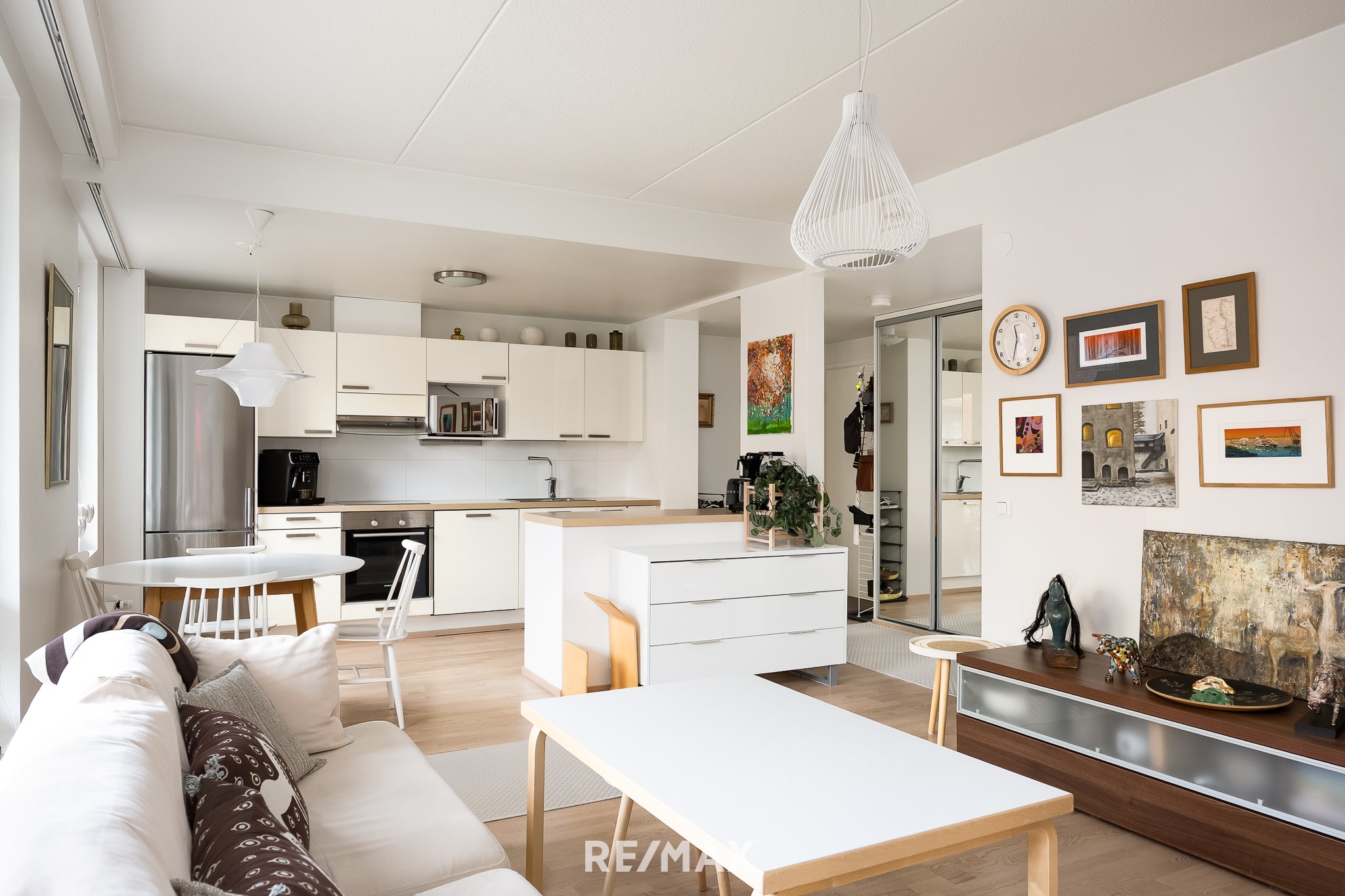 Pohjaratkaisu on selkeä ja toimiva: avokeittiö on osa oleskelutilaa, ja keittiössä on saareke sekä nykyaikaiset kodinkoneet. Kylpyhuoneessa on lattialämmitys ja asunnossa on oma sauna.