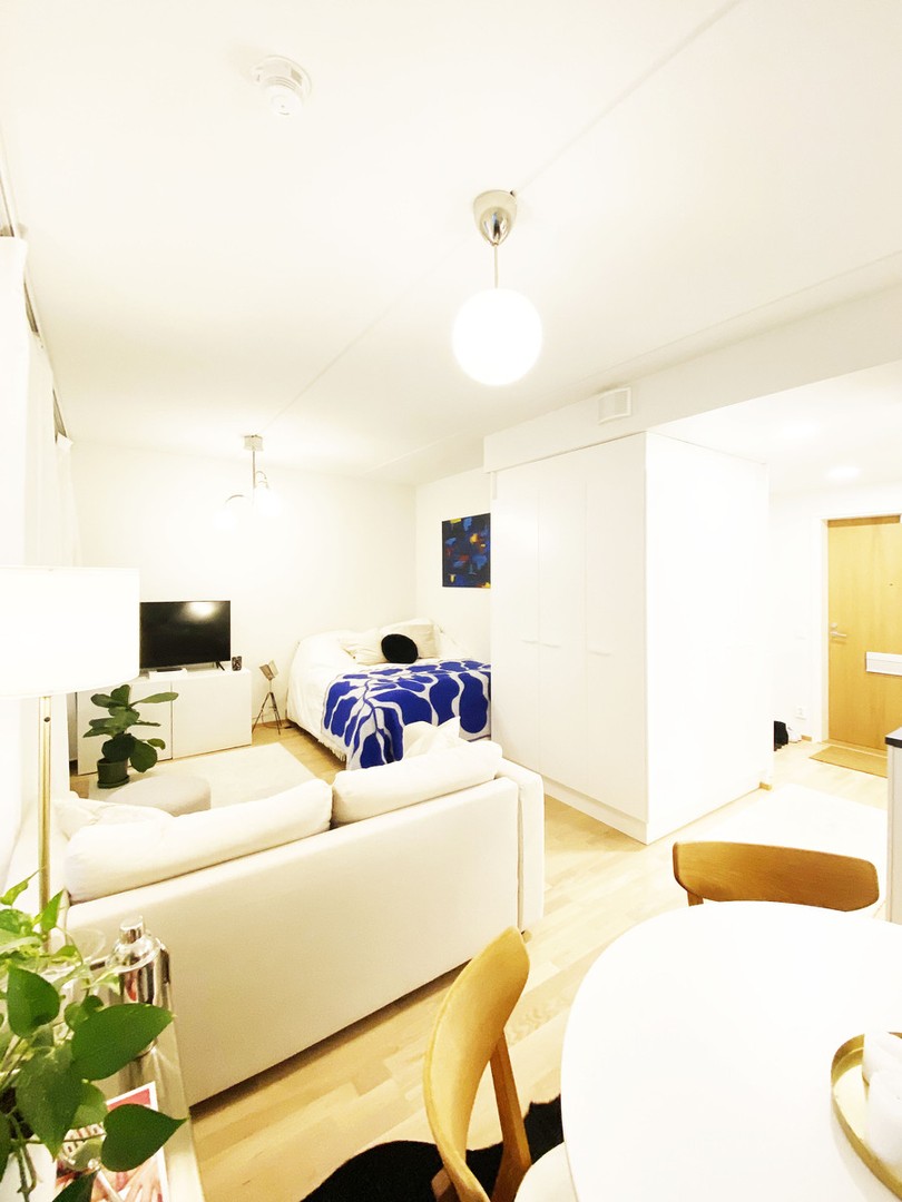 A beautiful one room studio with great layout located in the heart of Helsinki near the seashore of Jätkäsaari is now for sale! This newish studio apartment, completed in 2020, in the popular area of Jätkäsaari offers a modern and carefree lifestyle. The apartment is located on the second floor and offers nice inner yard view, giving a unique opportunity to enjoy the beautiful and peaceful scenery from your own glazed balcony and dinning area.