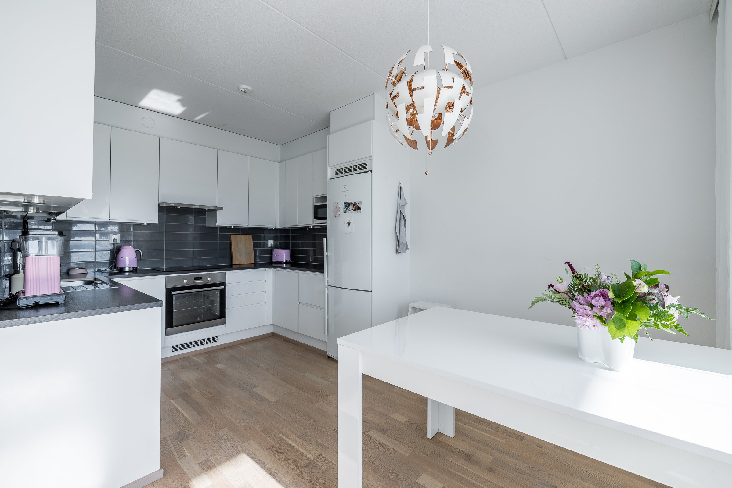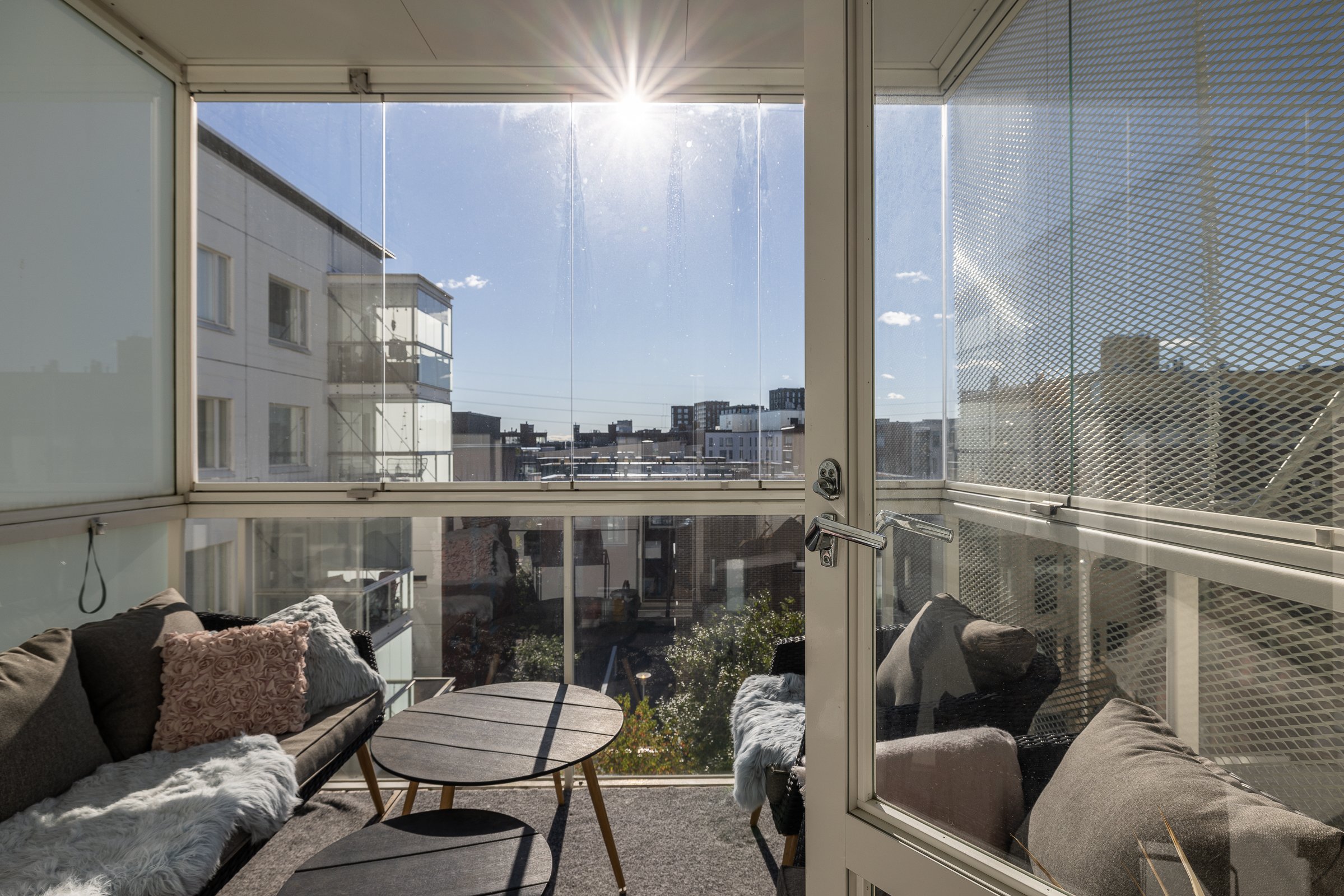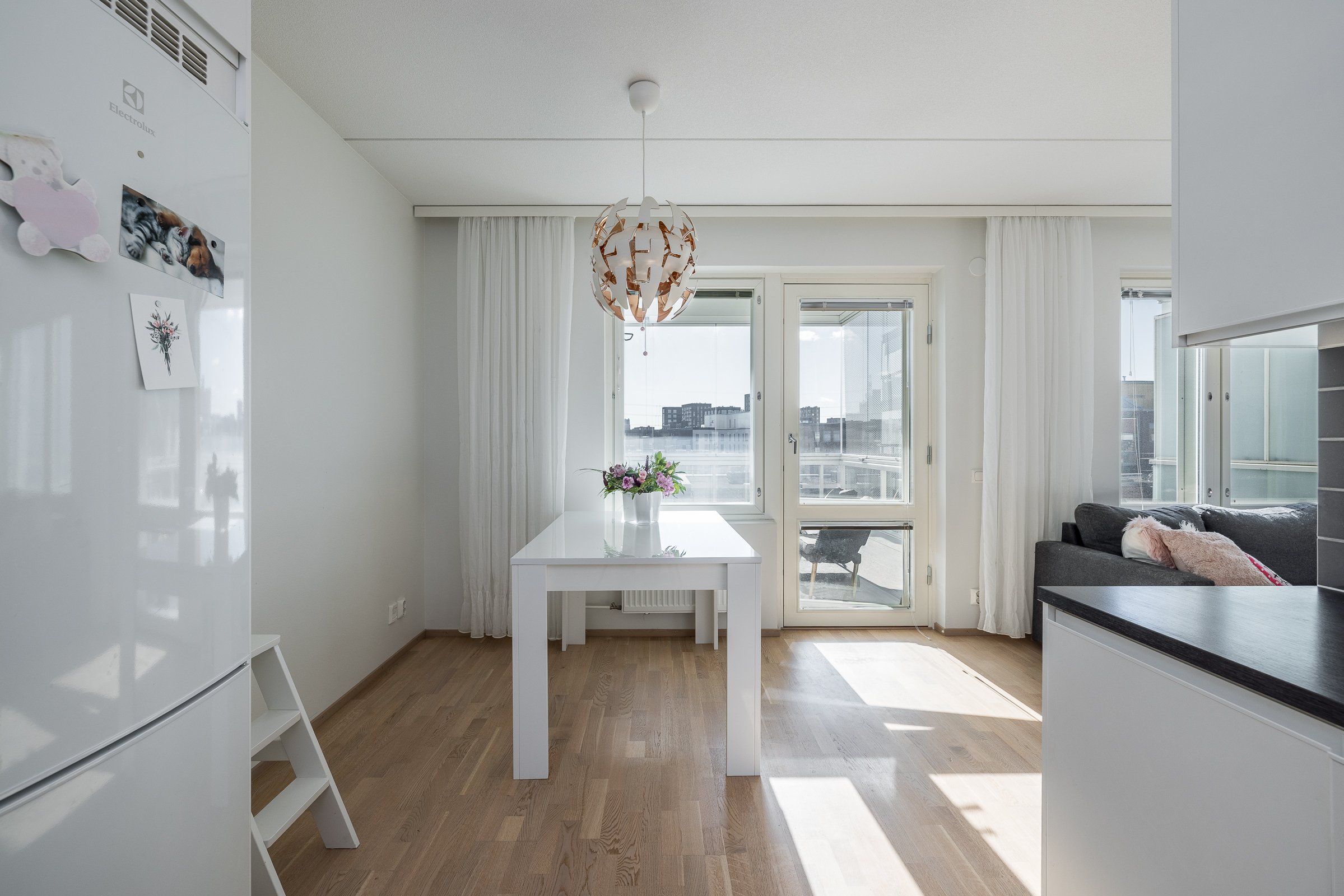Tämä valoisa kaksio sijaitsee Kalasatamassa, ja sen ikkunoista avautuvat avarat näkymät etelään talojen yli. Lasitettu parveke lisää asunnon käyttötilaa ja toimii lisähuoneena lämpiminä päivinä.