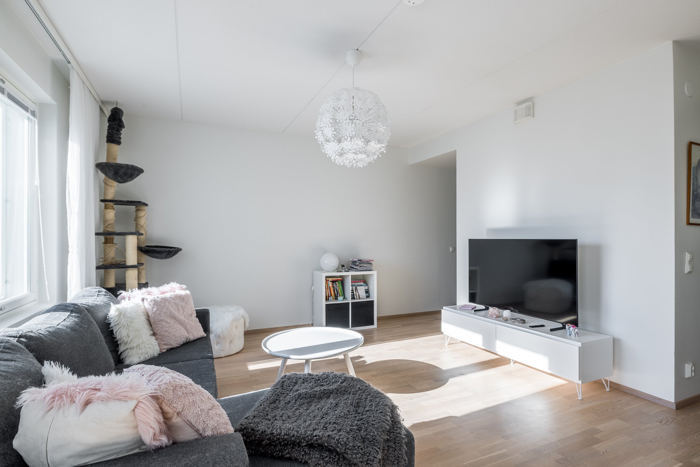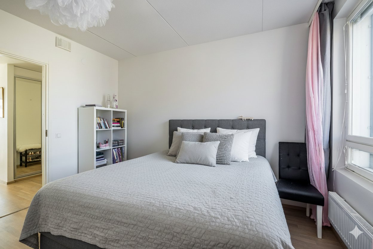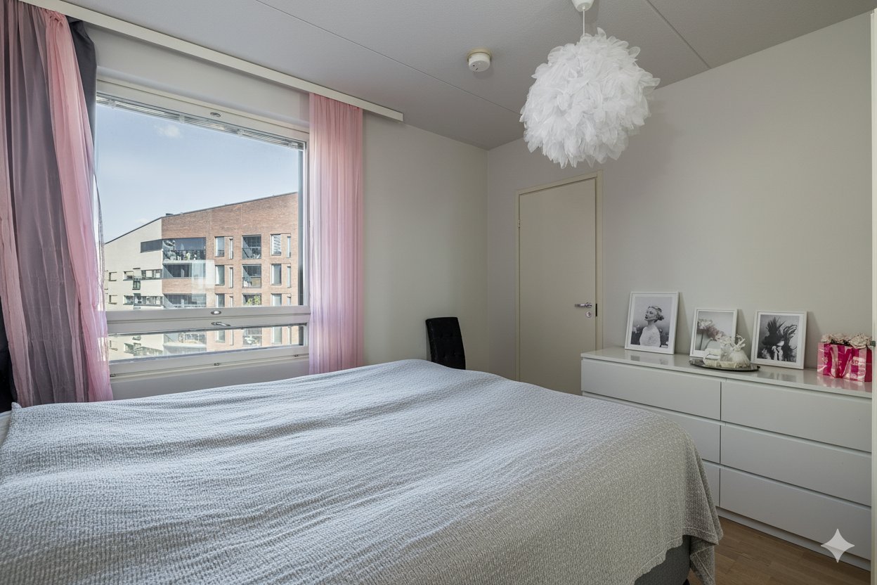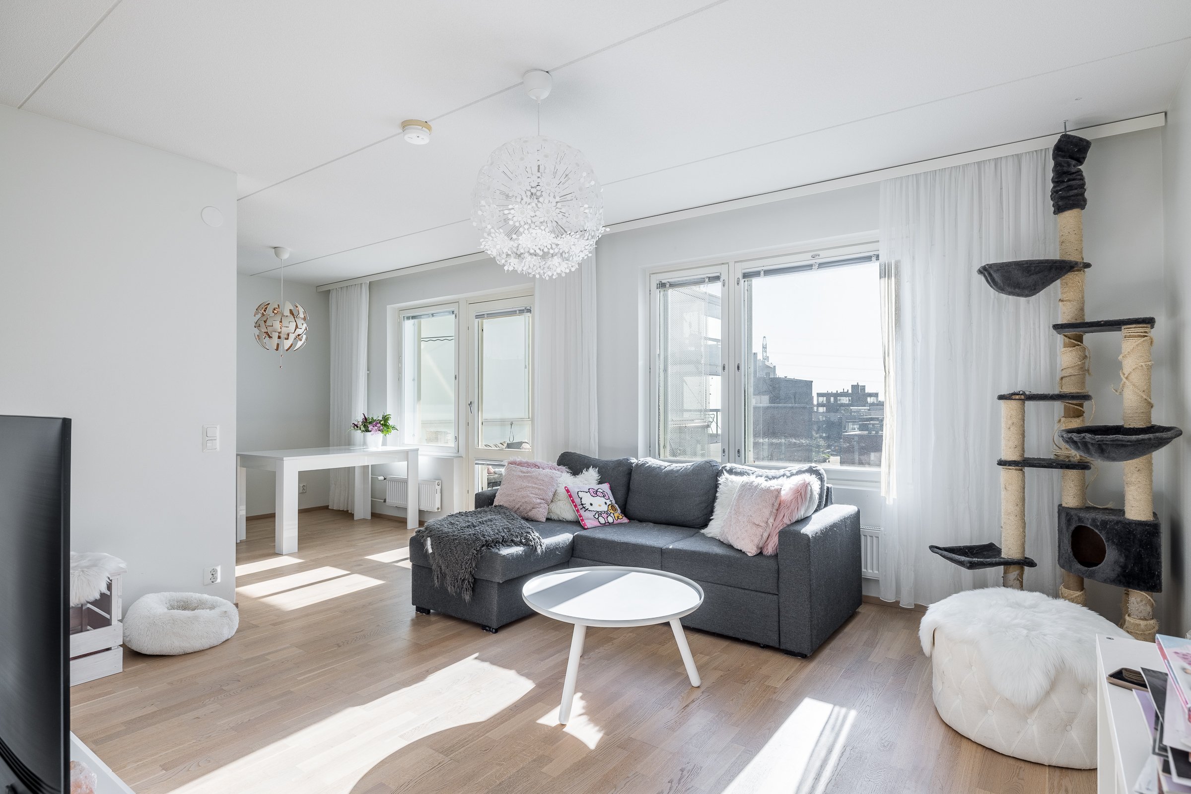 Tämä valoisa kaksio sijaitsee Kalasatamassa, ja sen ikkunoista avautuvat avarat näkymät etelään talojen yli. Lasitettu parveke lisää asunnon käyttötilaa ja toimii lisähuoneena lämpiminä päivinä.