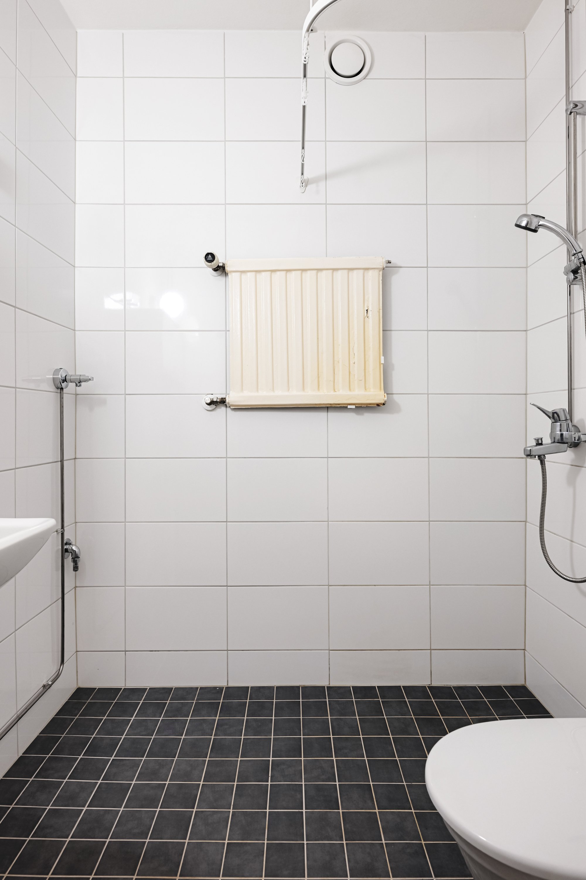 Kylpyhuoneessa on tyylikkäät laatat ja suihku, kokonaisuudessaan tilavan kokoinen ja sinne mahtuu myös pyykinpesukone. Huoneiston pinnat kaipaavat päivittämistä ja lautalattia on hiottavissa uuden veroiseksi.