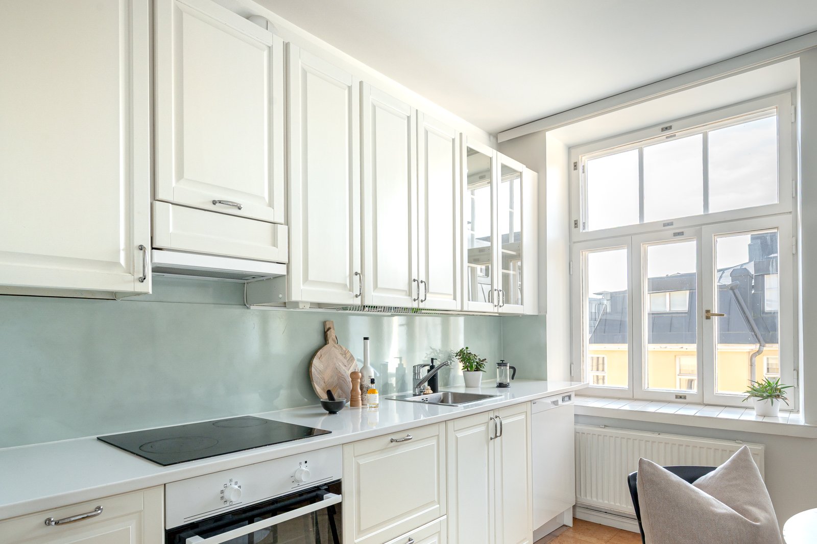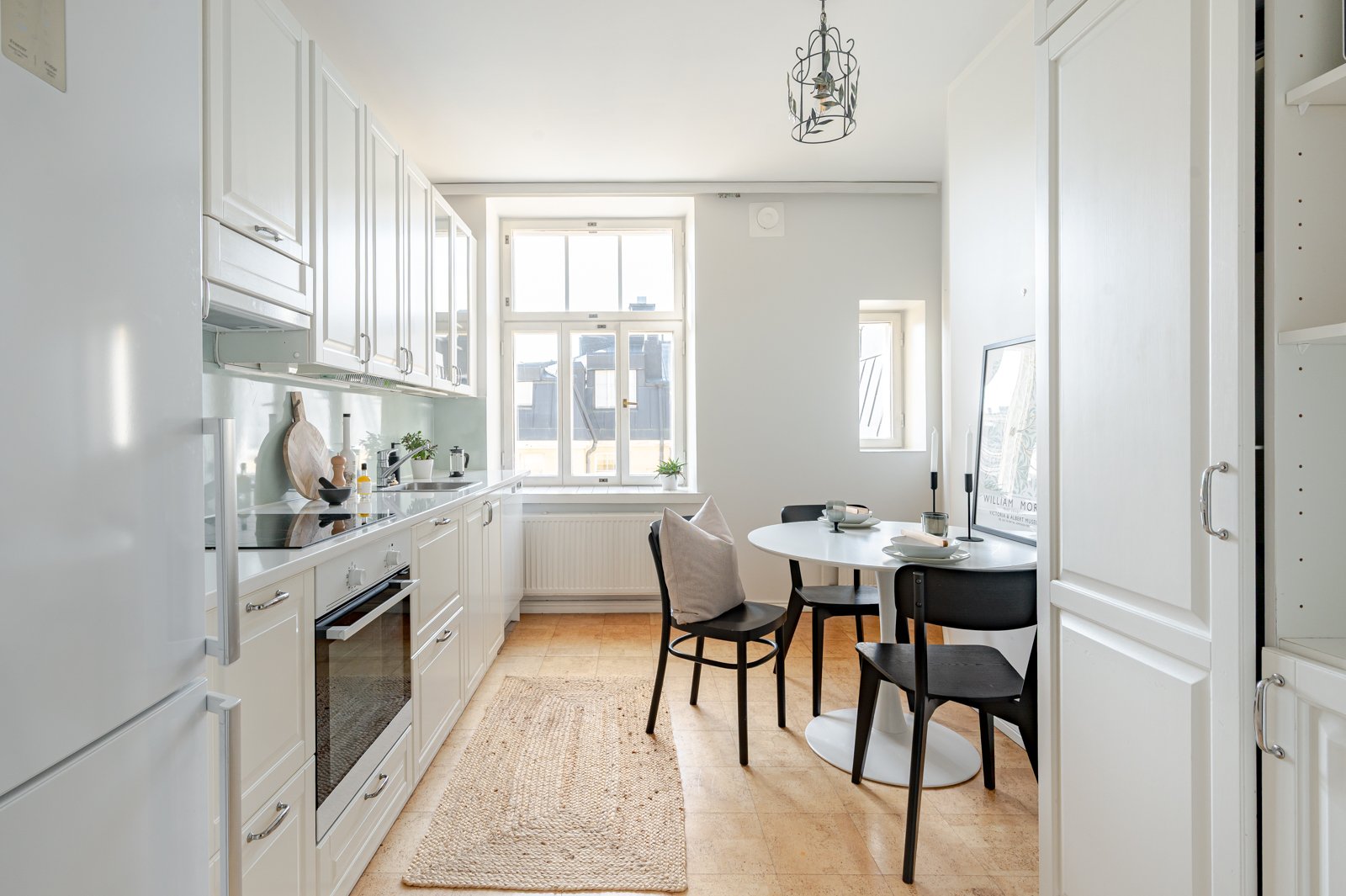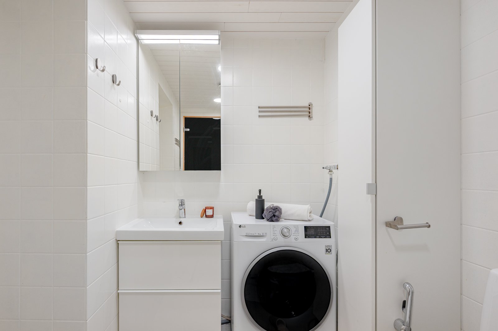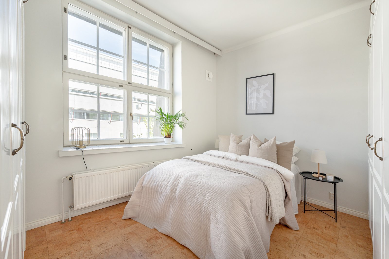 Keittiöstä avautuvat hurmaavat näkymät yli kaupungin kattojen, ja makuuhuoneessa on hyvät säilytystilat. Harvinaisuutena kaupunkiasunnossa oma sauna tuo arkeen ripauksen luksusta.