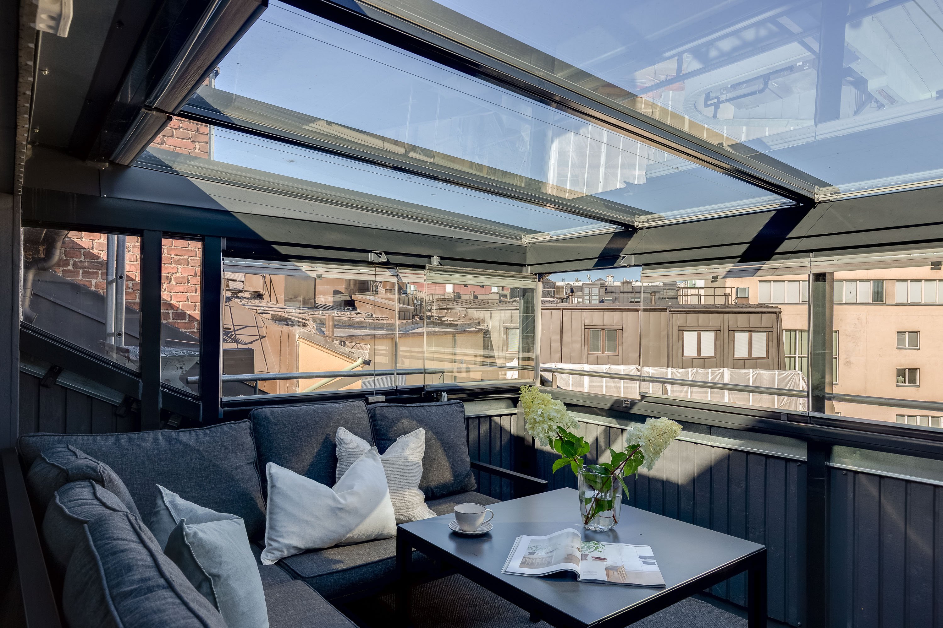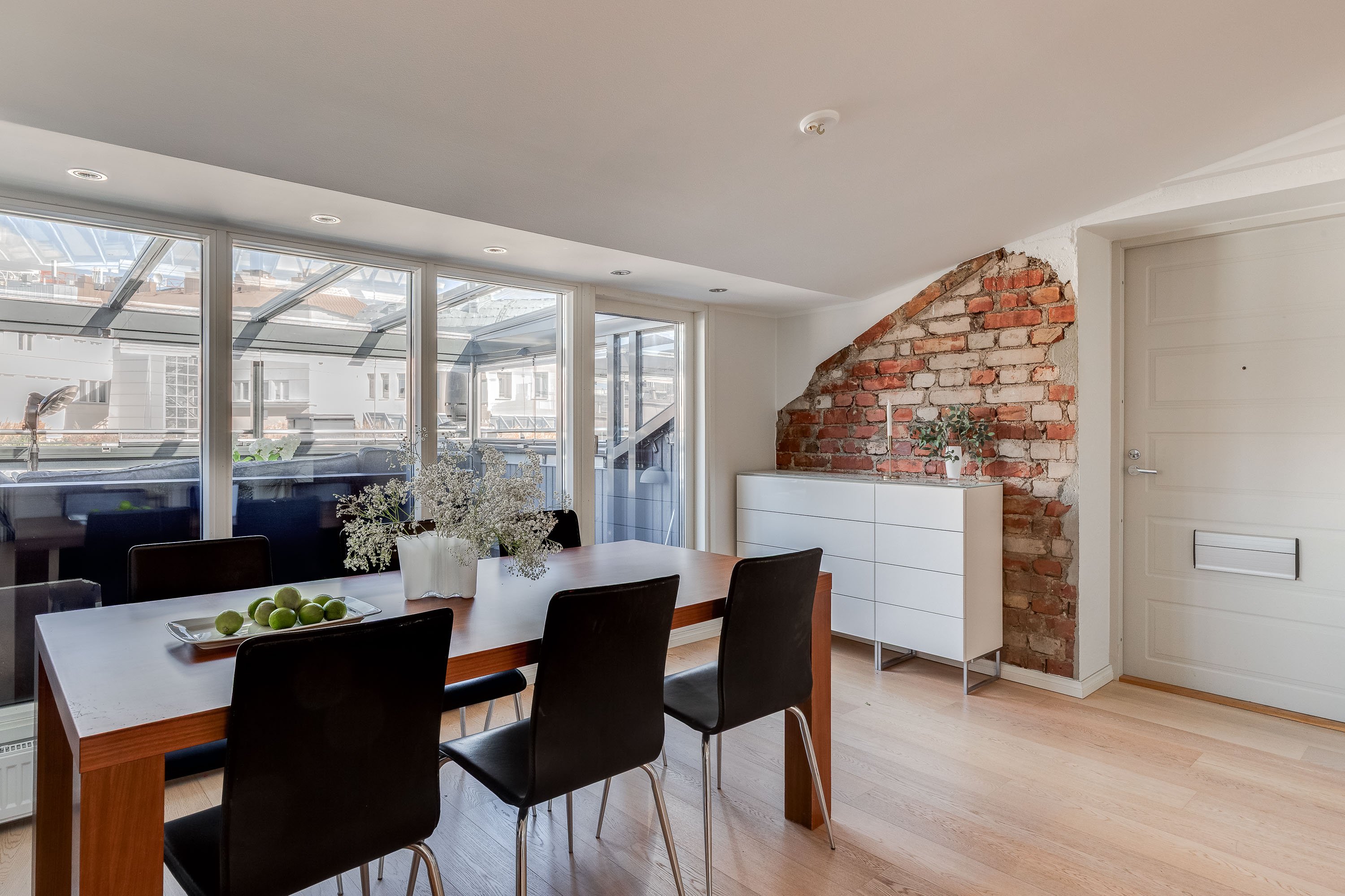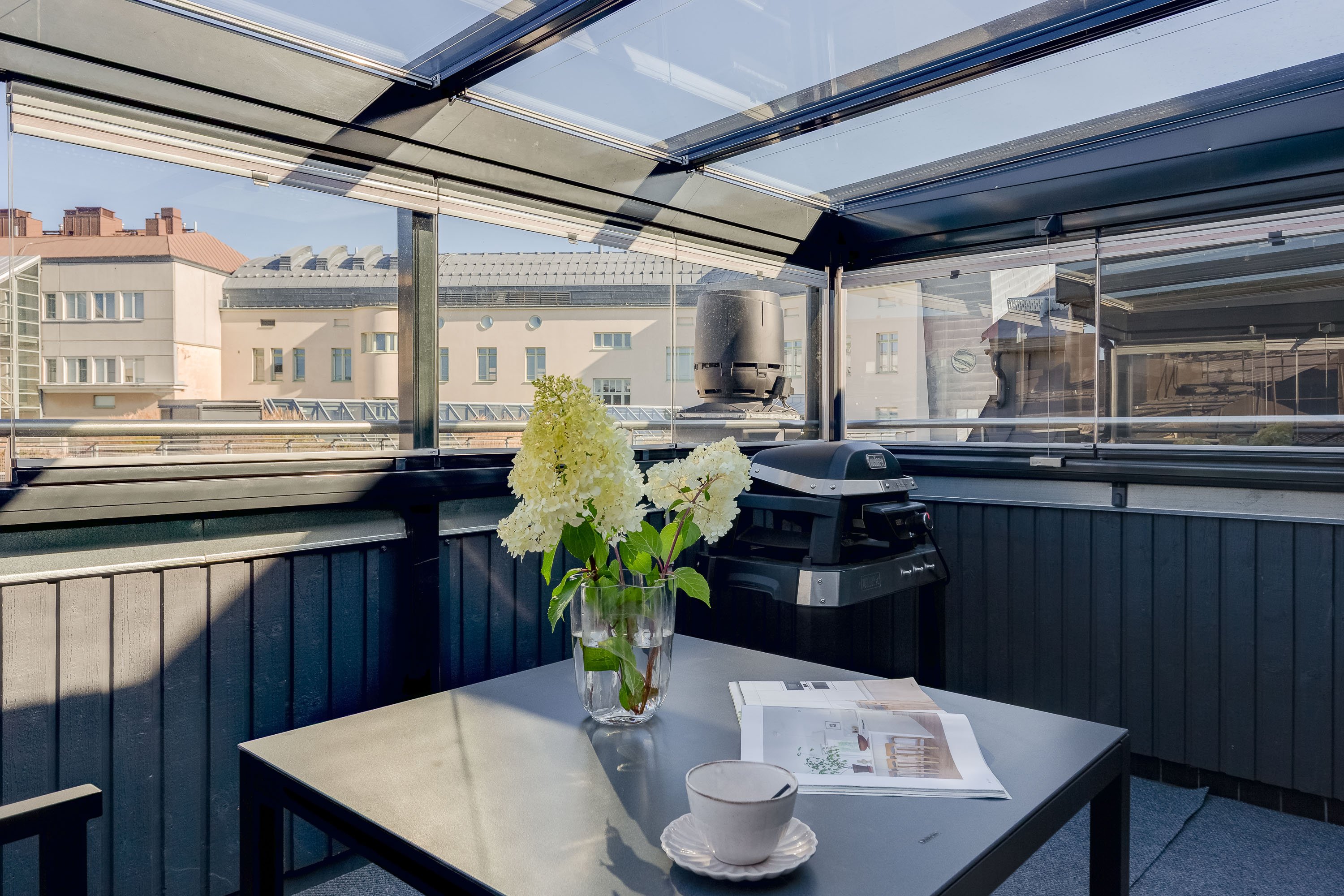 Tyylikäs, vuonna 2021 laadukkaasti remontoitu avokeittiö tarjoaa erinomaiset puitteet ruoanlaittoon. Tilava olohuone-avokeittiökokonaisuus luo avaruutta ja tekee kodista ihanteellisen paikan niin arkeen kuin juhlaan. Hienoa tunnelmaa tähän läpitalon huoneistoon tuo kattoikkunat sekä osittain näkyviin jätetyt tiiliseinät. Yhden reilun kokoisen makuuhuoneen lisäksi huoneiston työhuoneen voi tarvittaessa muuttaa toiseksi makuuhuoneeksi. Moderni sauna tuo ihanaa lisäluksusta arkeen. Huoneiston kruunaa upea, lasitettu terassi, josta avautuu hieno sisäpihakorttelinäkymä. Terassin katto on myös lasitettu ja se tuo tilaan lisää valoa ja avaruutta. Täällä voit nauttia illasta ystävien kanssa keskellä kaupungin vilskettä mutta kuitenkin täysin omassa rauhassa.