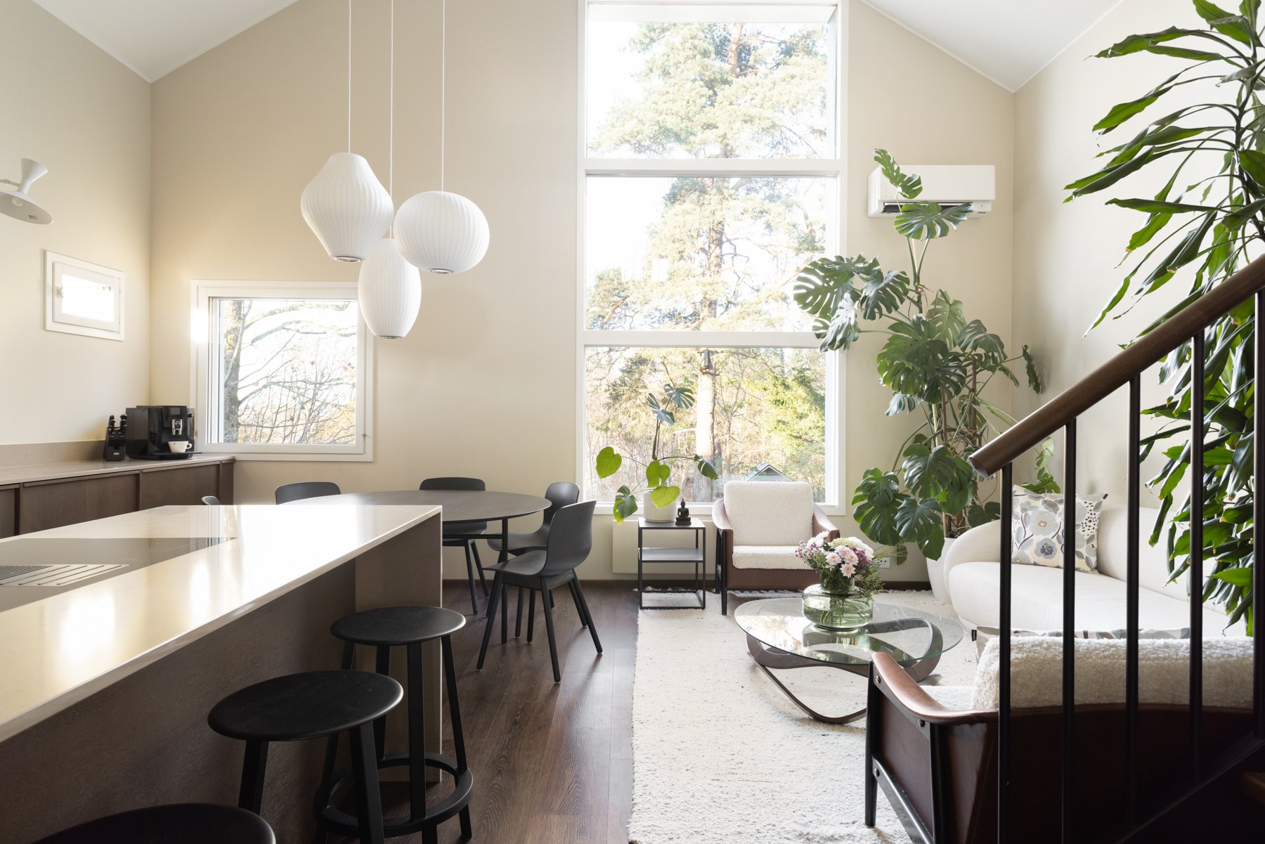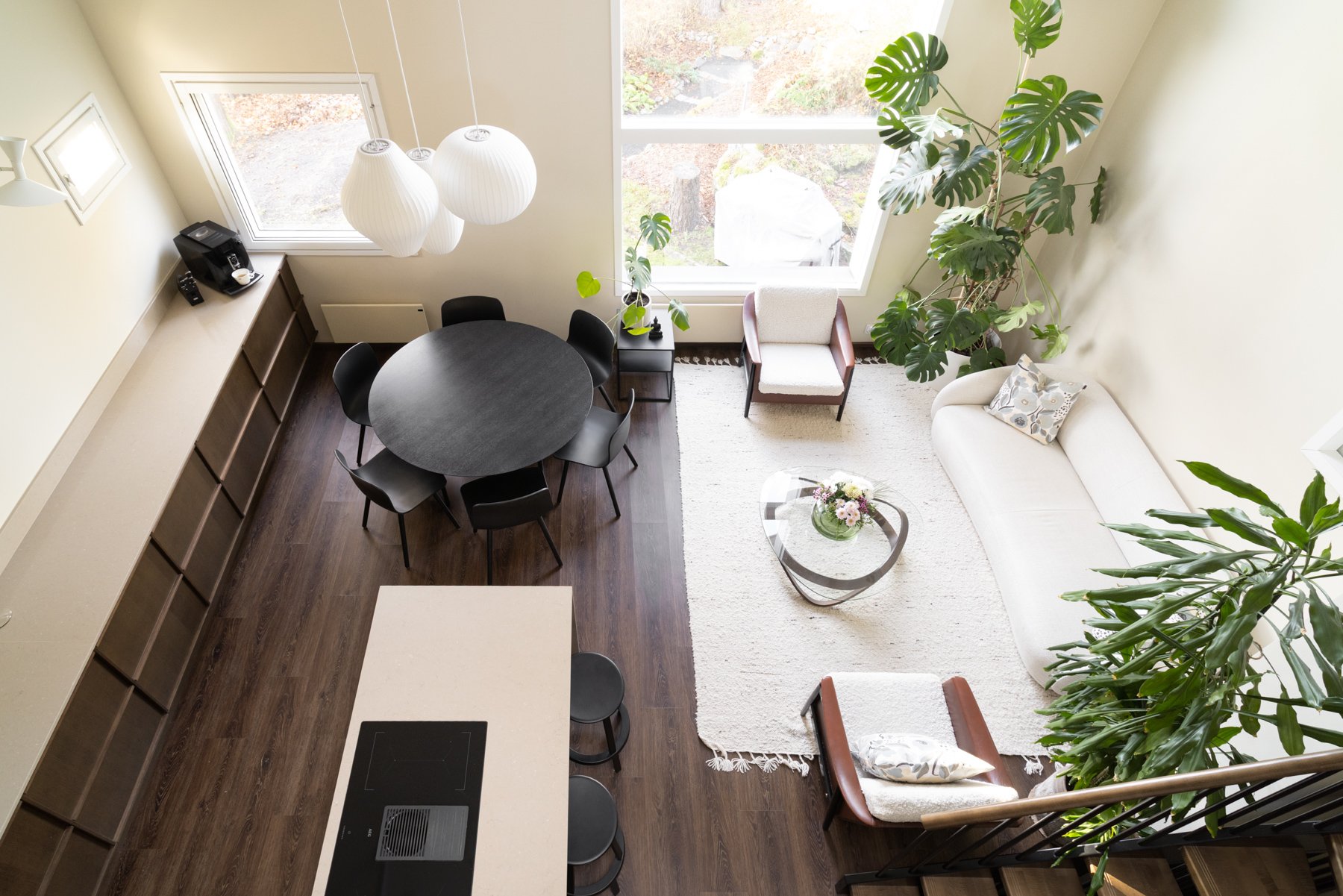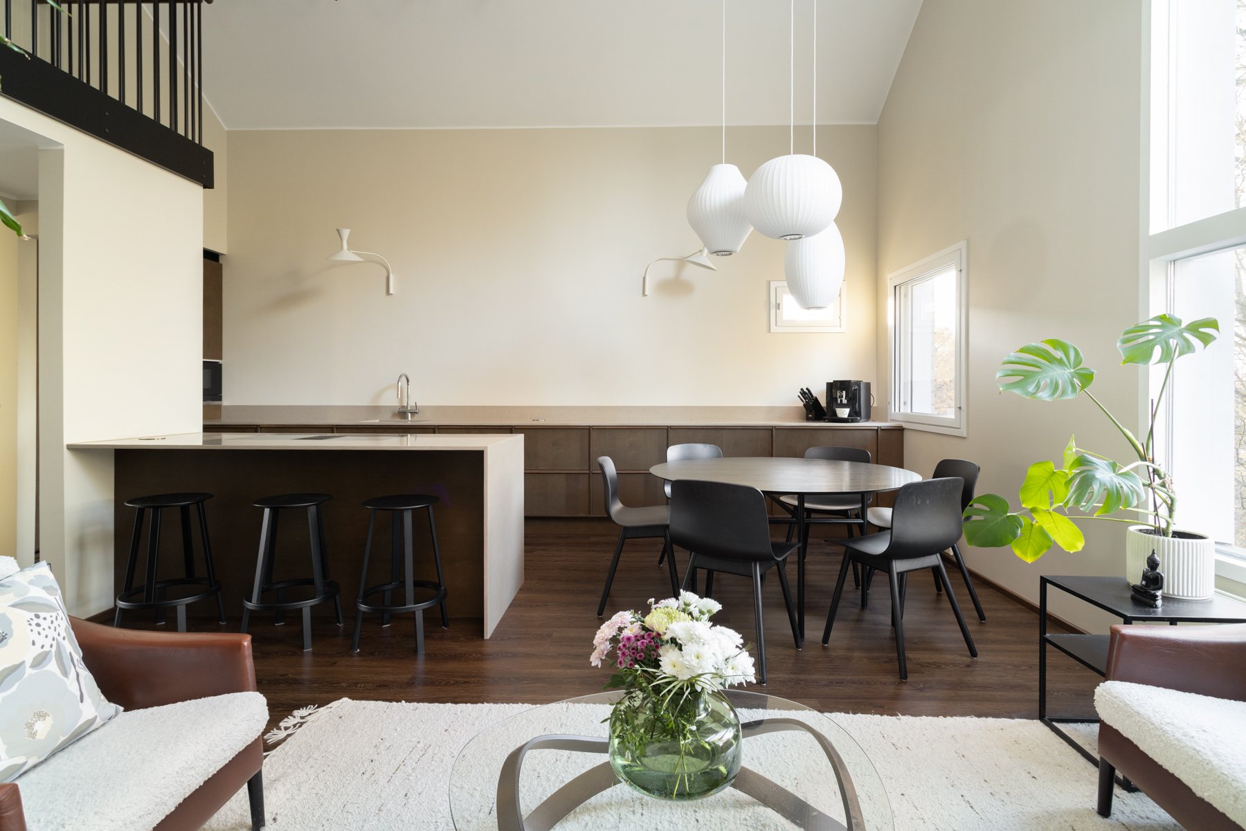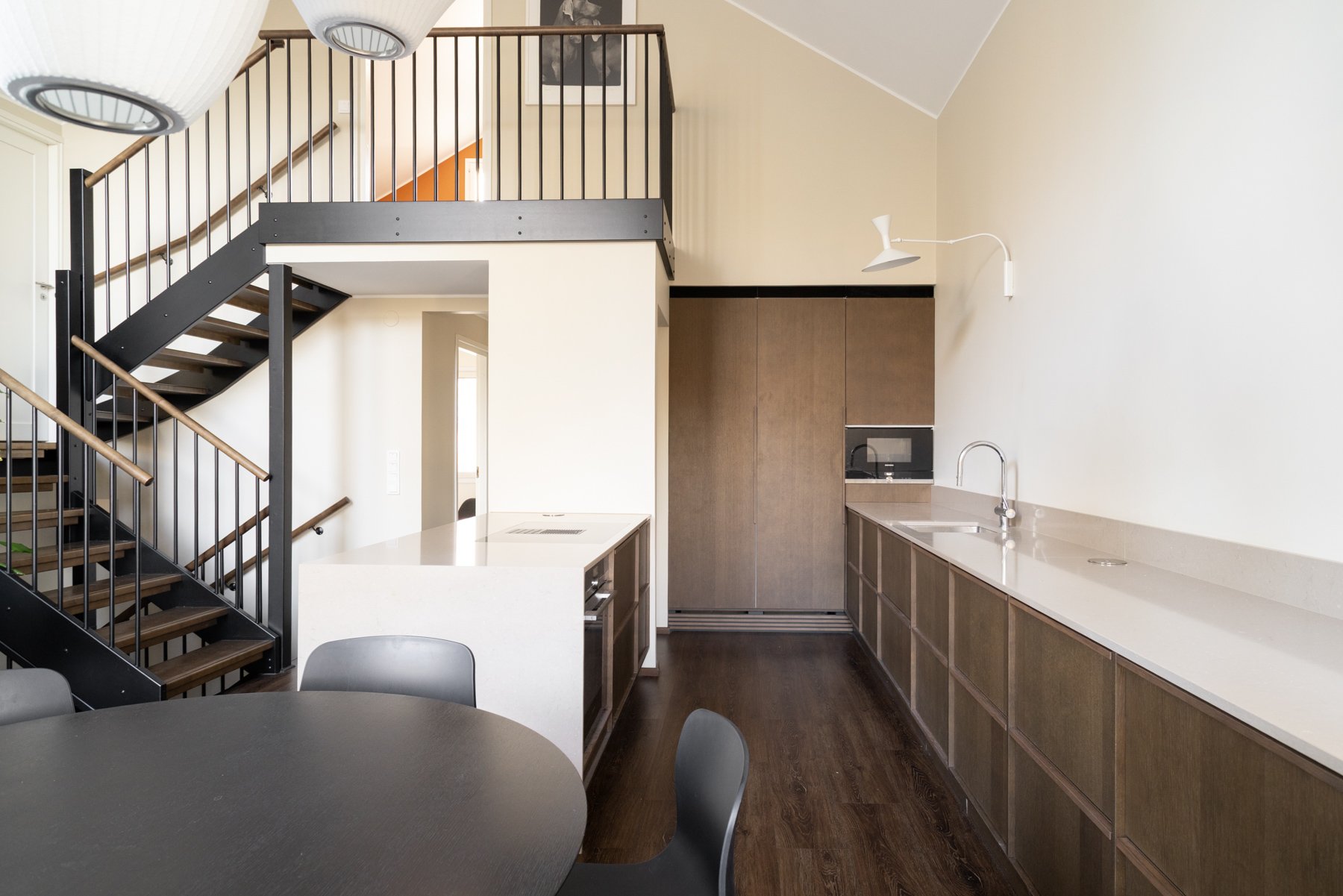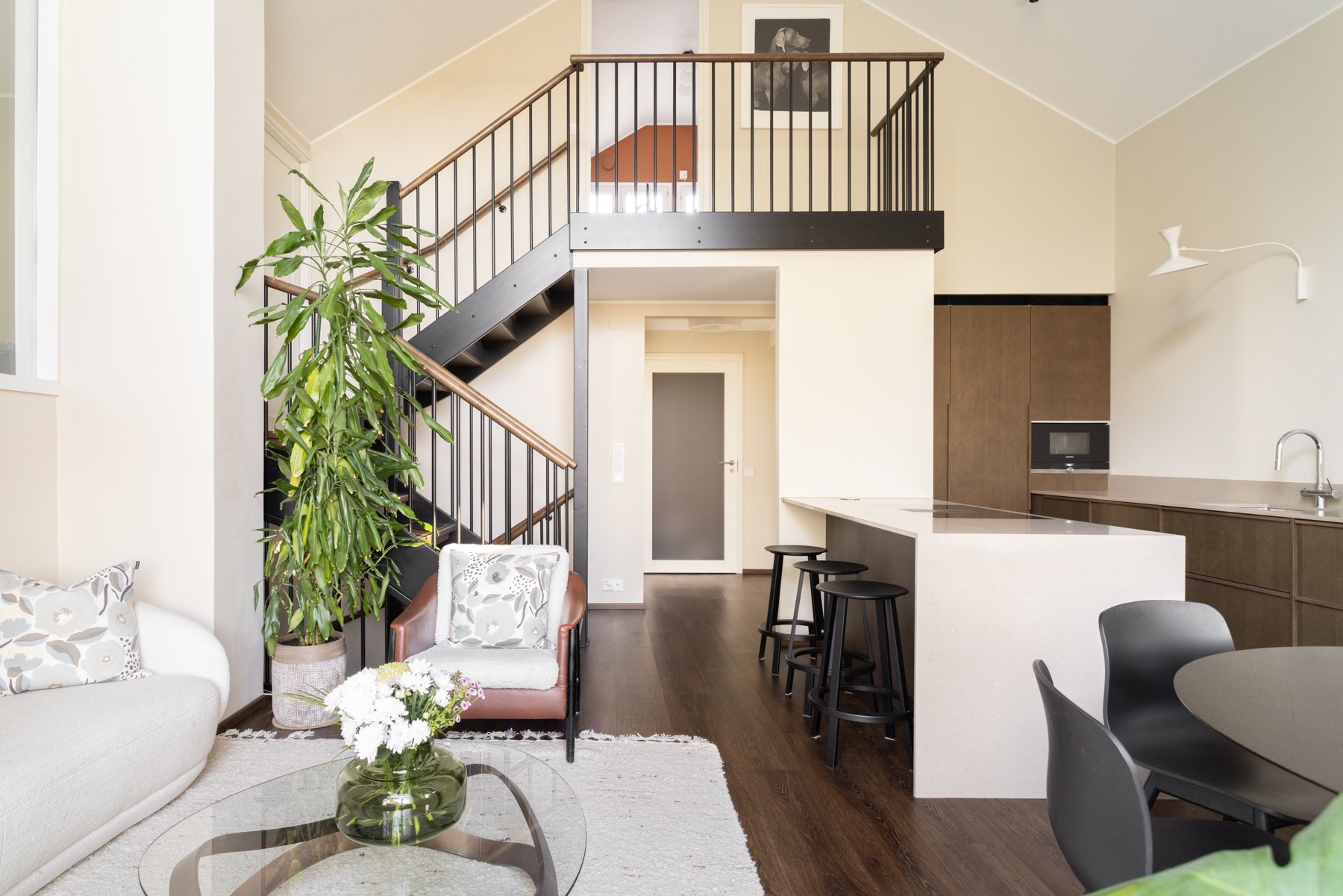 Asunnossa on viisi makuuhuonetta, joista yksi toimii erinomaisesti työ- tai viherhuoneena. Alakerrassa on takkahuone, joka voi toimia toisena olohuoneena tai lisämakuuhuoneena. Moderni avokeittiö kivitasoineen ja saarekkeineen on varustettu laadukkailla kodinkoneilla, mikä tekee ruoanlaitosta nautinnollista.