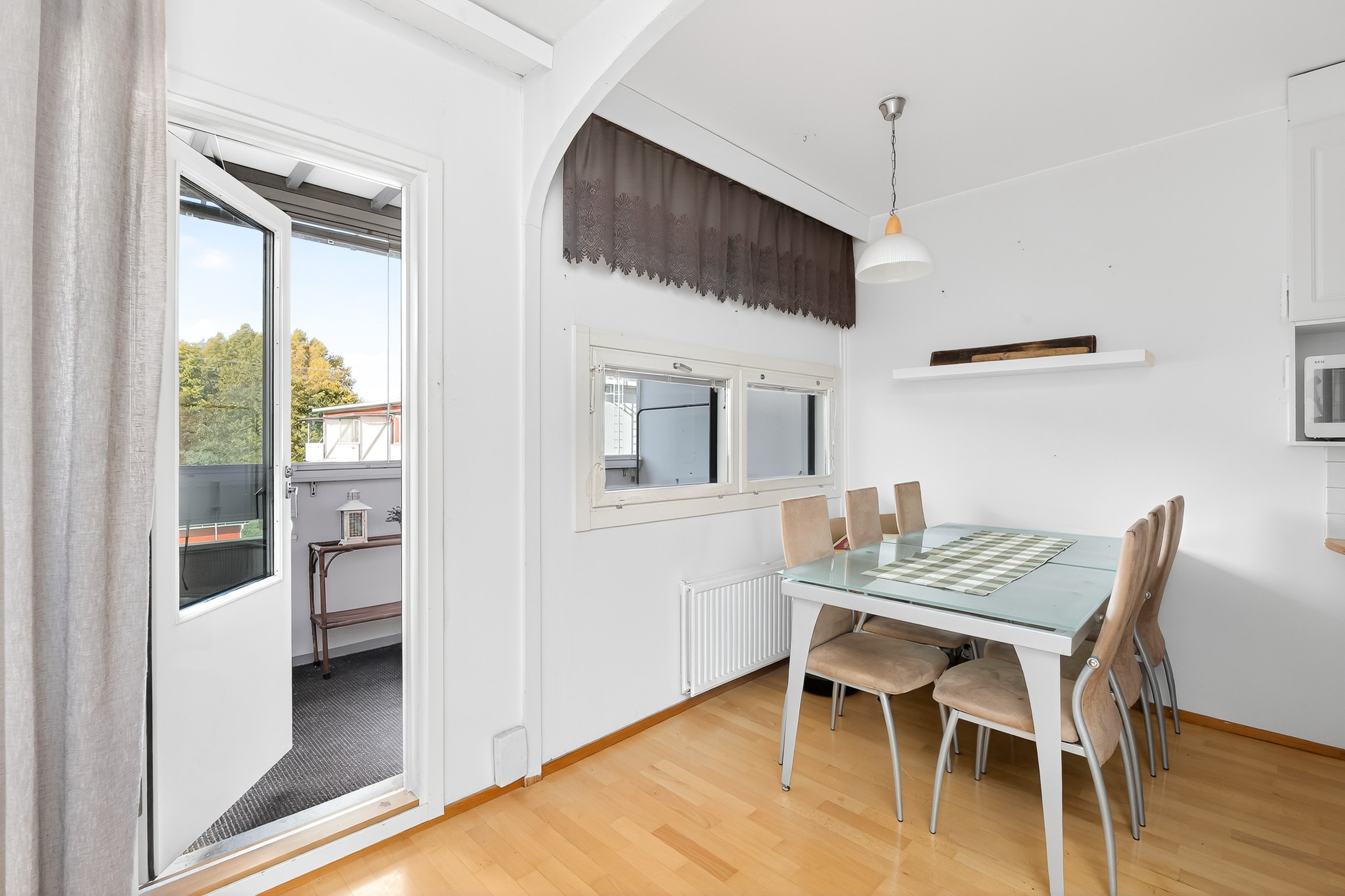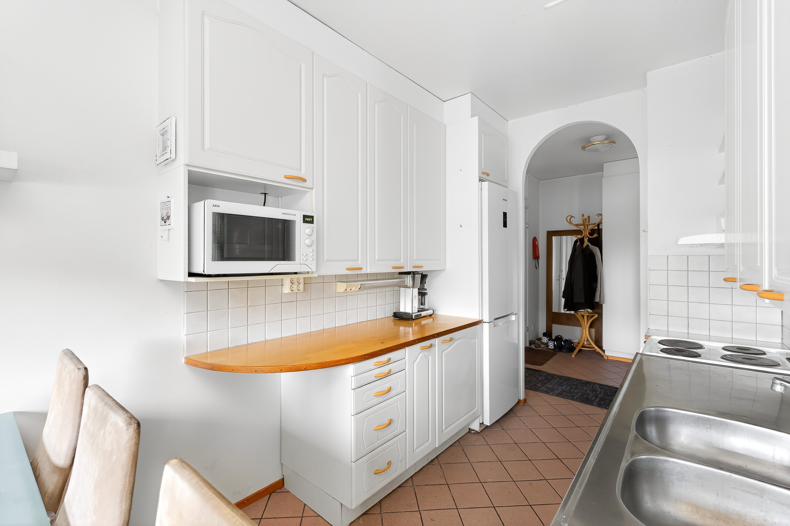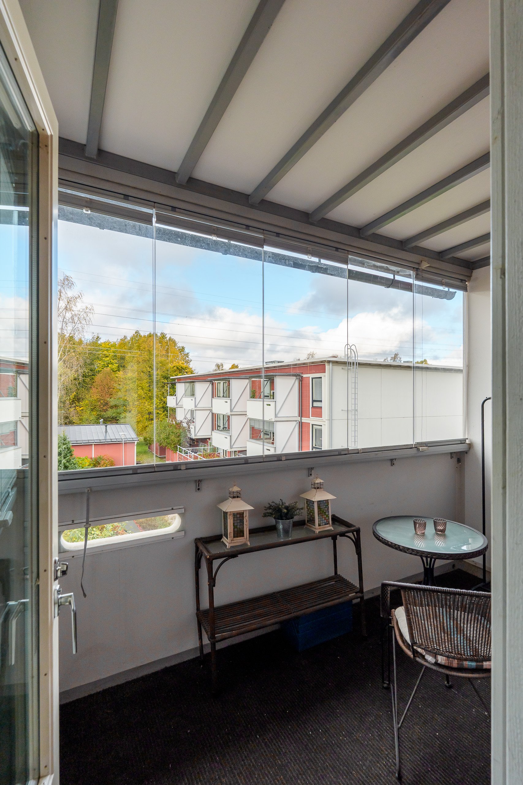 Tässä kodissa ei ole hukkaneliöitä eikä turhia käytäviä. Eteisessä on tila naulakolle ja kaapille. Olohuone on tilava ja lasitettu parveke on olohuoneen jatkeena. Keittiössä on kaikki tarvittavat laitteet, kuten astianpesukone ja jääkaappipakastin. Ruokailutila on avoin keittiön ja olohuoneen yhteydessä. Kylpyhuone on remontoitu vuonna 2013. Makuuhuoneessa on tilaa parisängylle ja vaatekaappeja on reilusti.