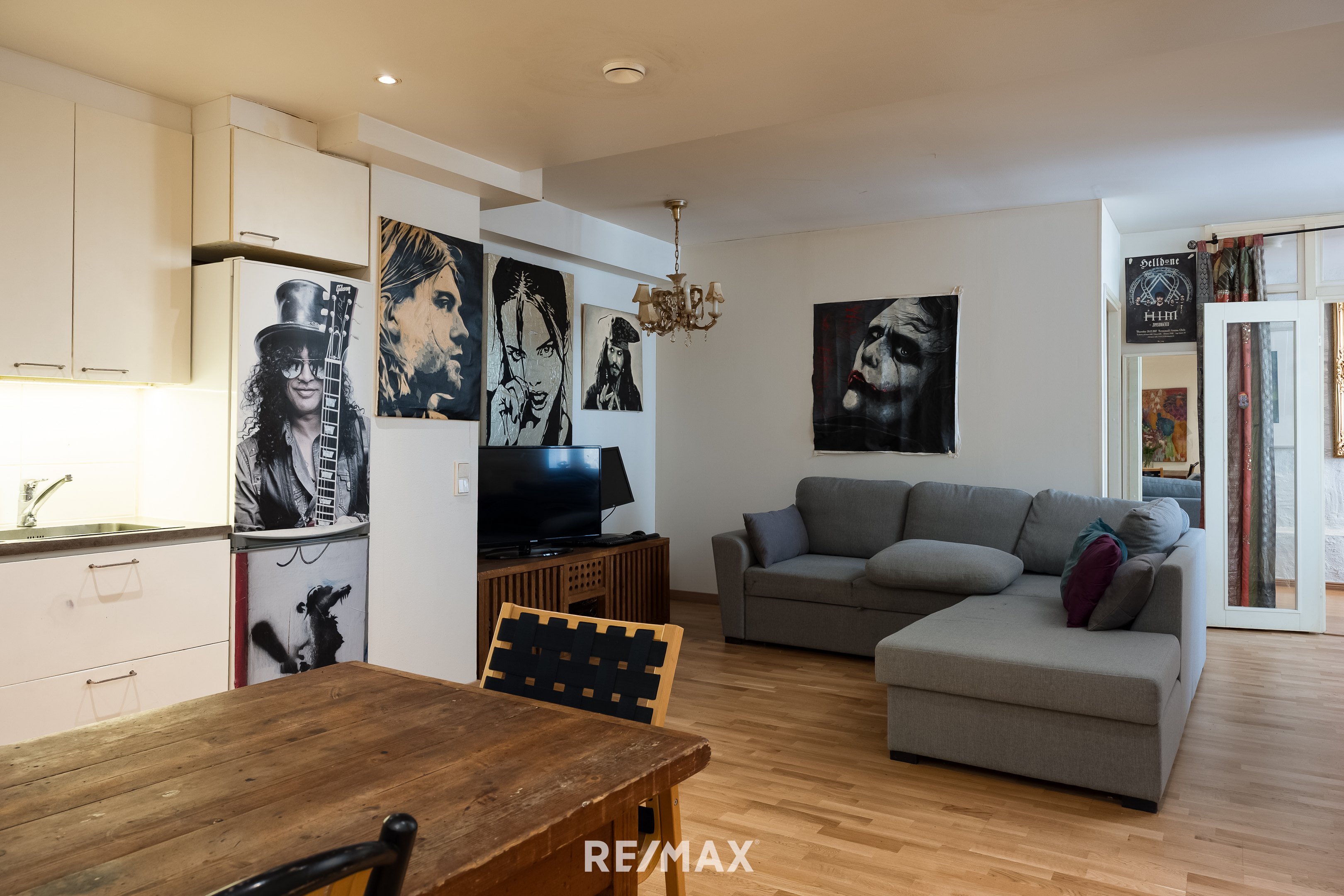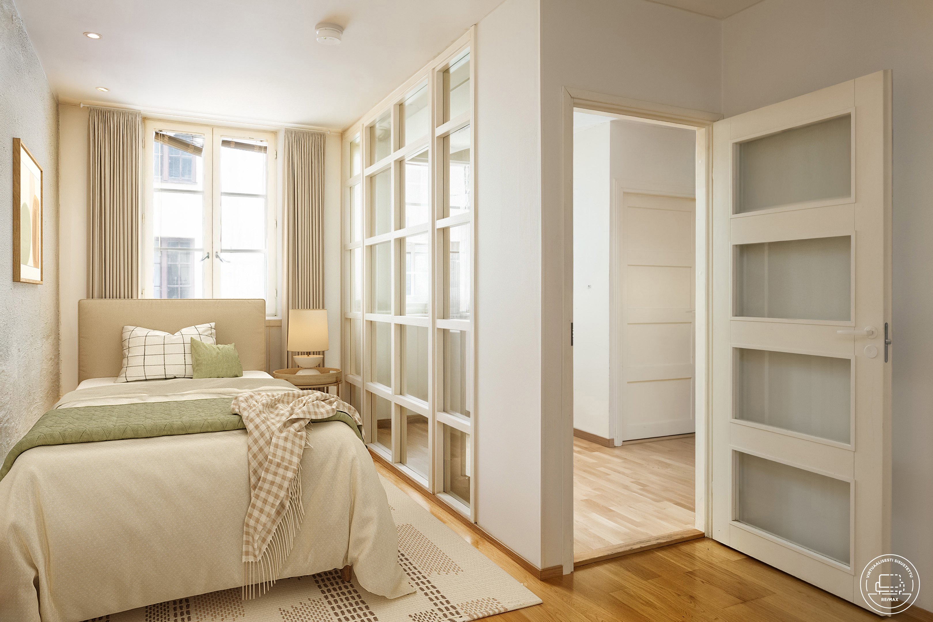 Tässä asunnossa on iso keittiö ja olohuone. Tilavaan makuuhuoneeseen mahtuu myös etätyöpiste.