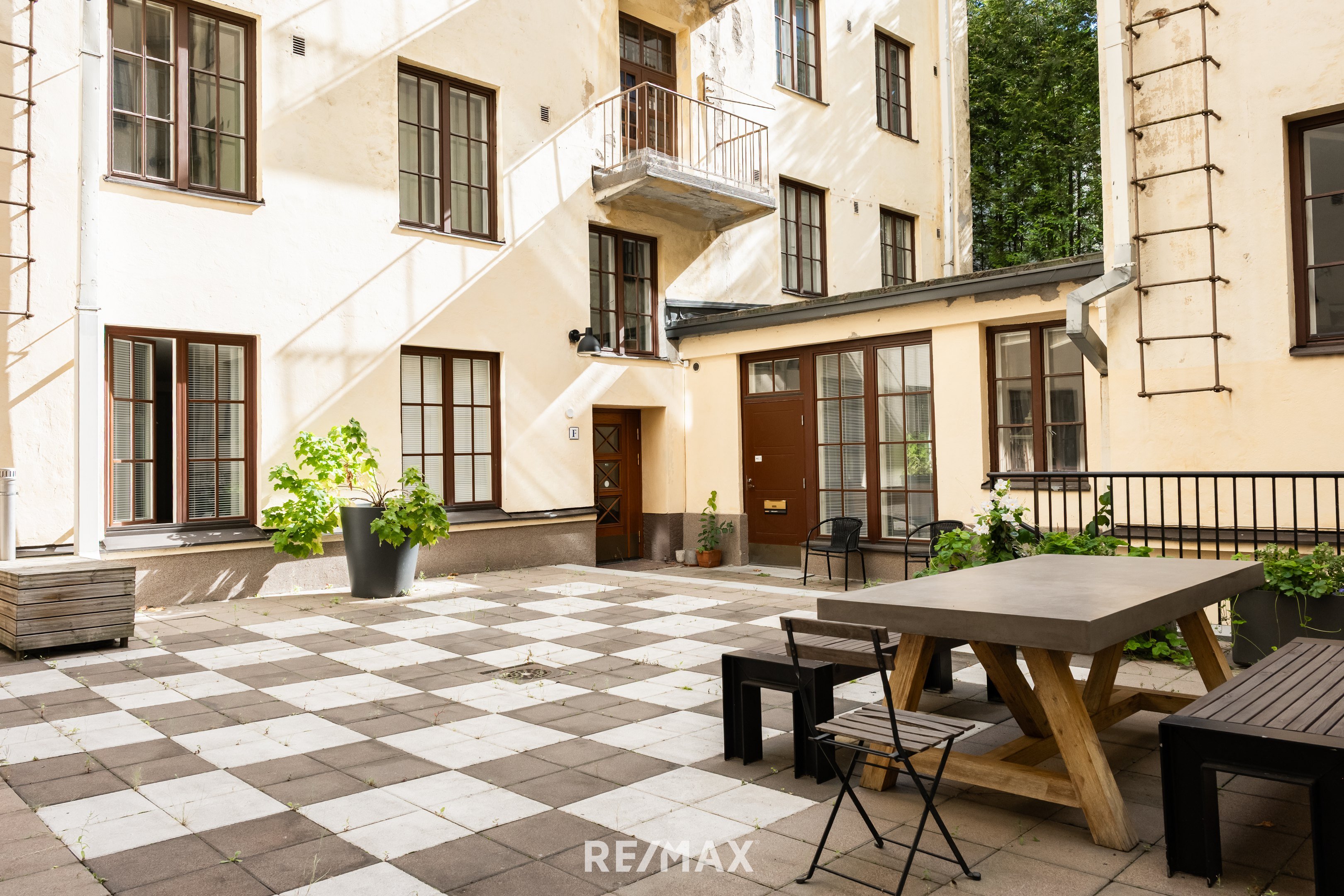 Tämä asunto sijaitsee rakennuksen sisäpihalla omassa rauhassaan. Asunnon ulko-oven edessä on iso terassipiha, jossa voit nauttia ulkoilmasta.