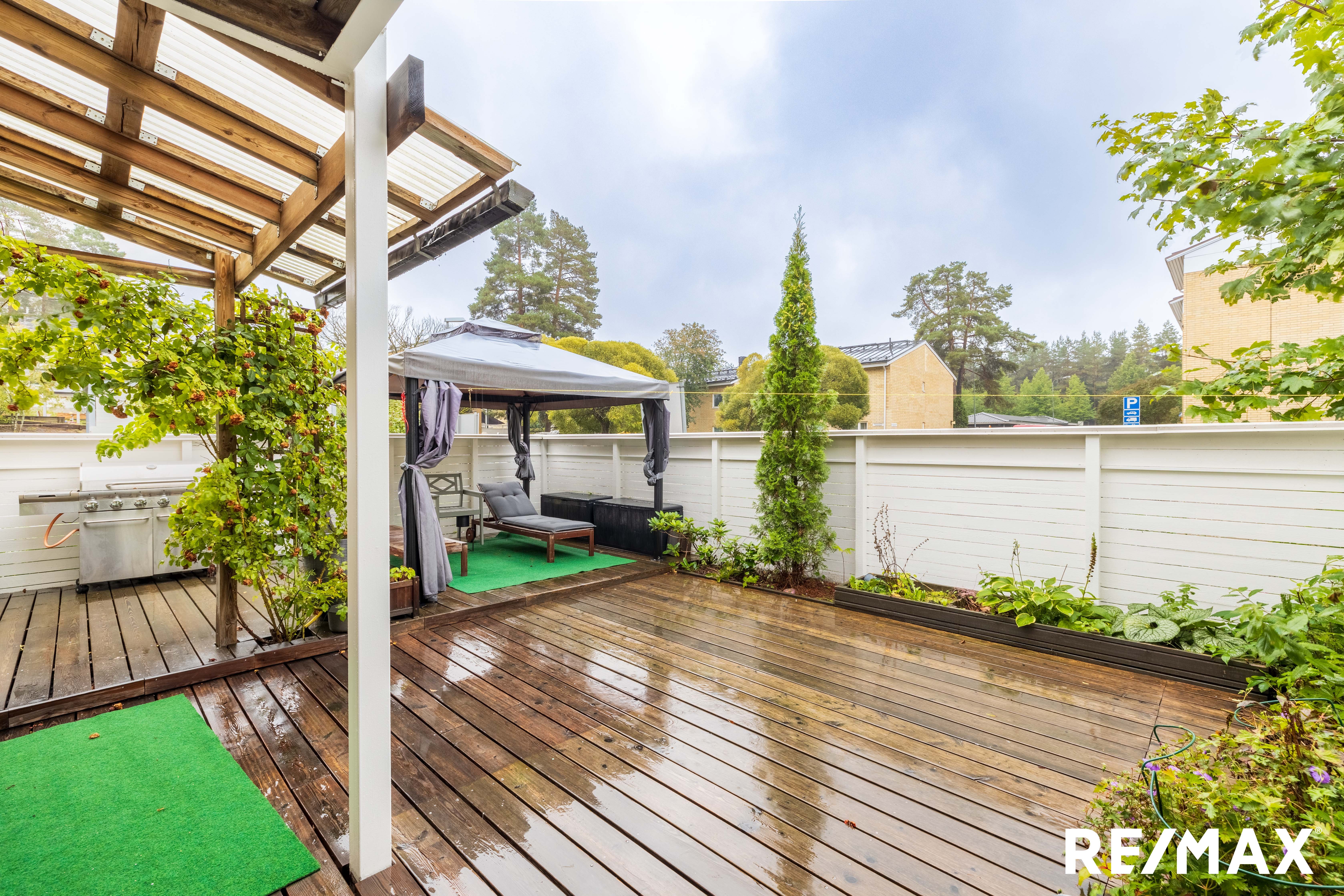 The front yard of the apartment has a sheltered entrance through a partially covered and tiled yard, and the backyard has a cozy terrace area with renewed terrace decking. This provides an ideal place to enjoy summer days and barbecues with family and friends.