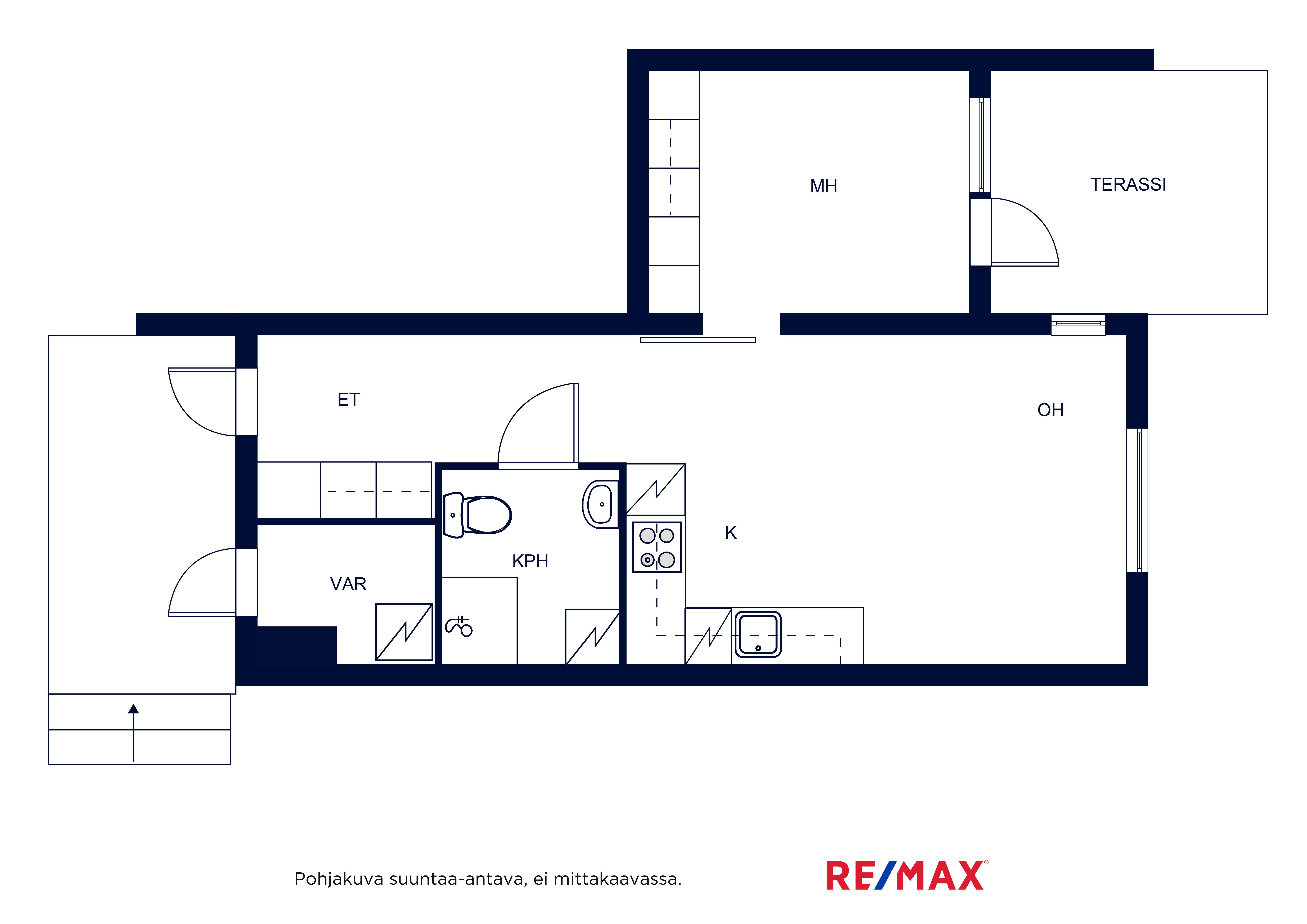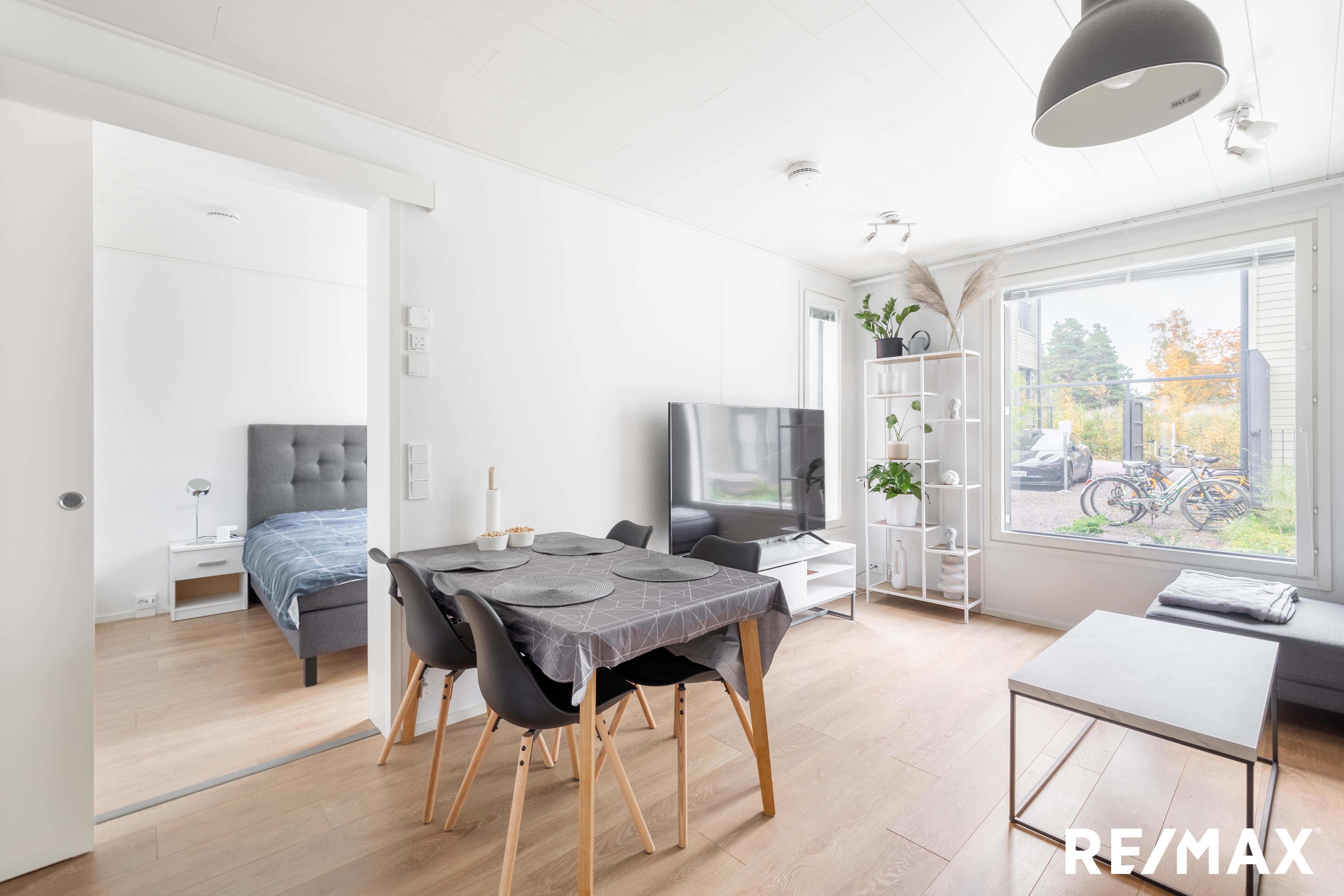 Olohuoneen ja makuuhuoneen laminaattilattiat sekä maalatut seinät luovat raikkaan ja nykyaikaisen ilmeen. Kylpyhuoneessa on lattialämmitys, mikä tuo lisämukavuutta erityisesti talvikuukausina. Asunnon yhteydessä on myös oma terassi.