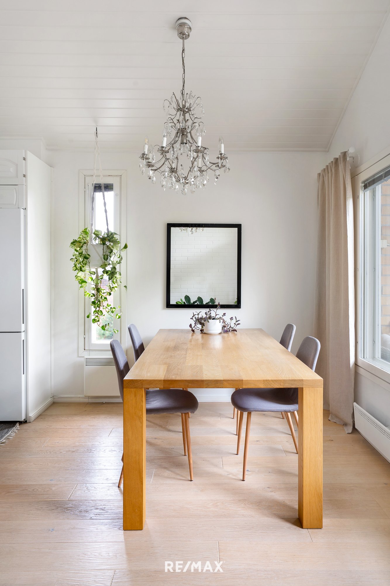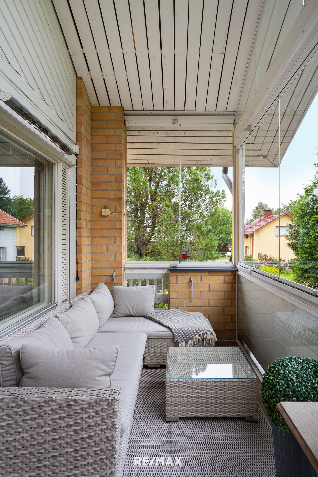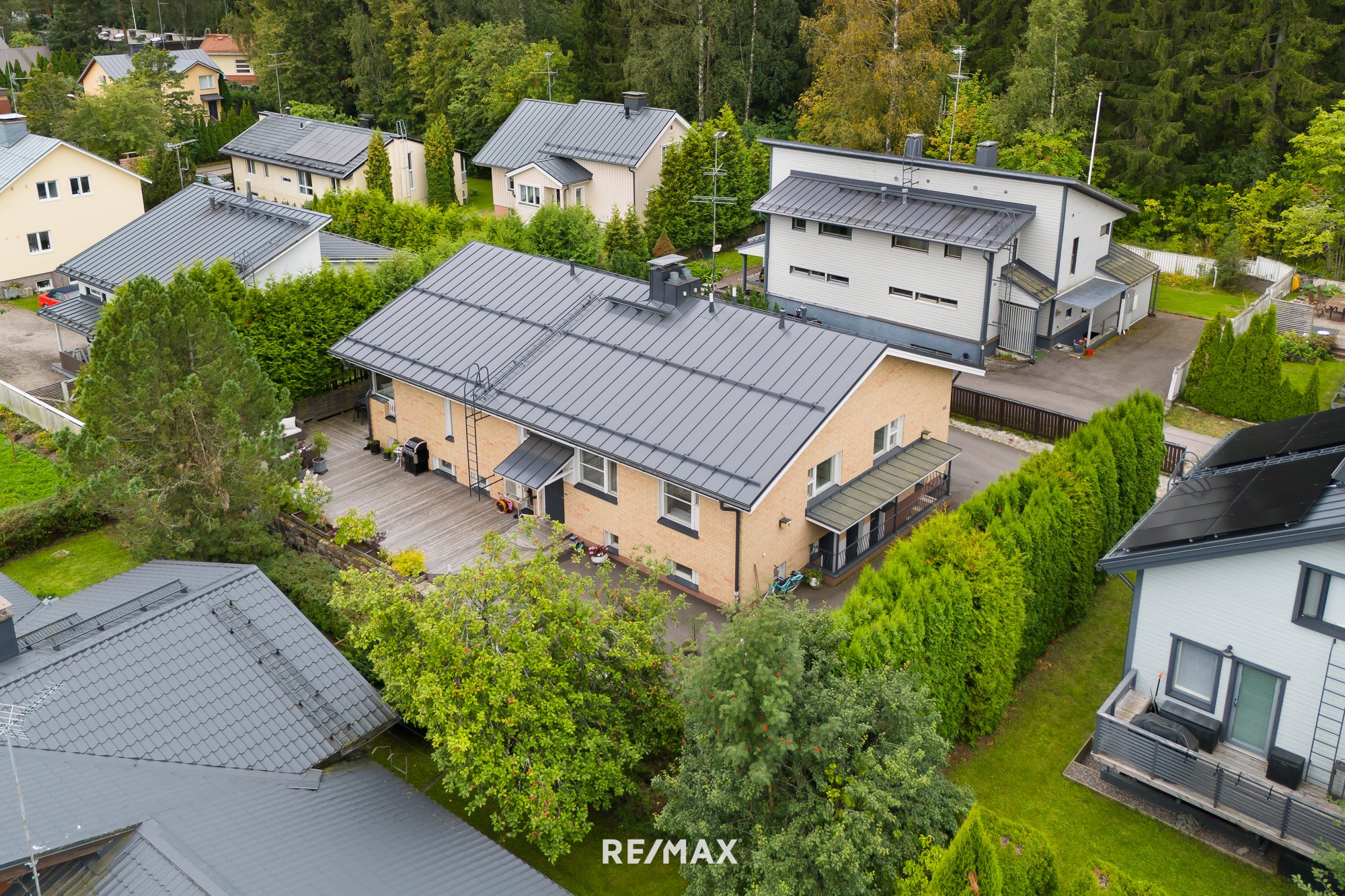 Koti on rakennettu vuonna 1989 ja siinä on kaksi kerrosta, jotka tarjoavat monipuoliset tilat perheen arkeen ja juhlaan. Valoisa olohuone ruokailutiloineen, tiiliseinä sekä noin viiden metrin huonekorkeus luovat ainutlaatuisen tunnelman, ja avokeittiö saarekkeineen tekee ruoanlaitosta nautinnon. Kaksi kylpyhuonetta ja sauna tarjoavat arjen luksusta, ja kodinhoitohuone sekä erillinen wc helpottavat perheen arkea. Alakerrassa sijaitsee tunnelmallinen takkahuone, joka kutsuu viettämään lämpimiä iltoja perheen kesken. Ilmalämpöpumpun avulla asunto pysyy viileänä kesähelteilläkin ja lämpenee energiatehokkaasti talvisin.