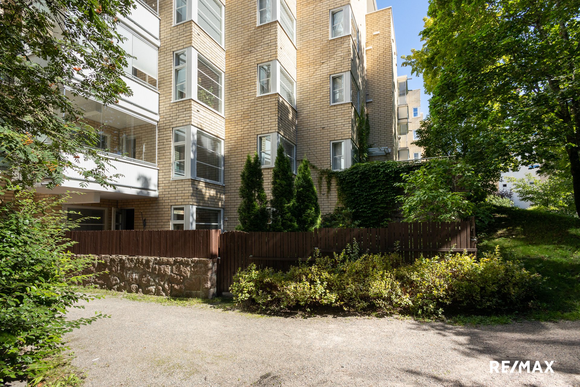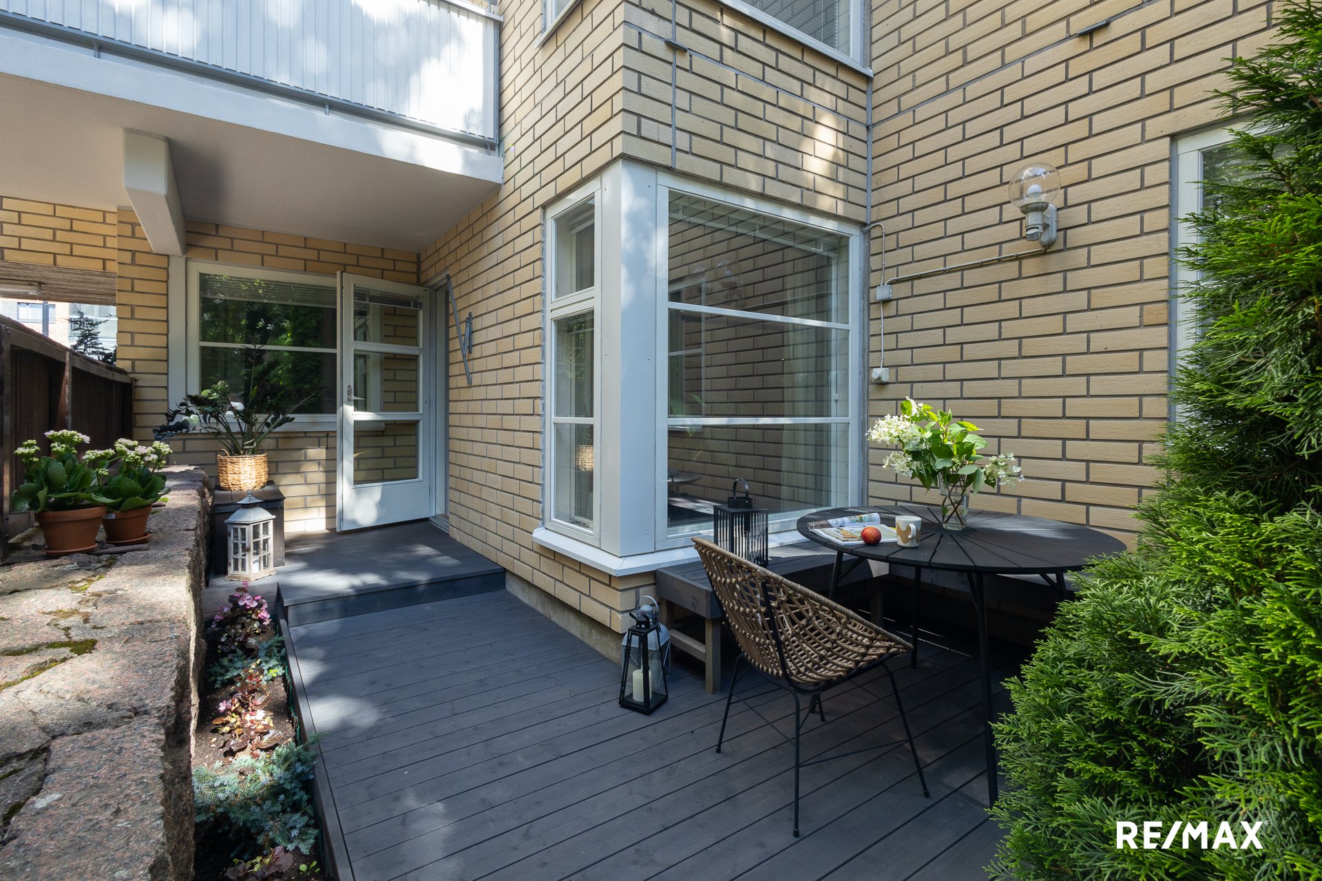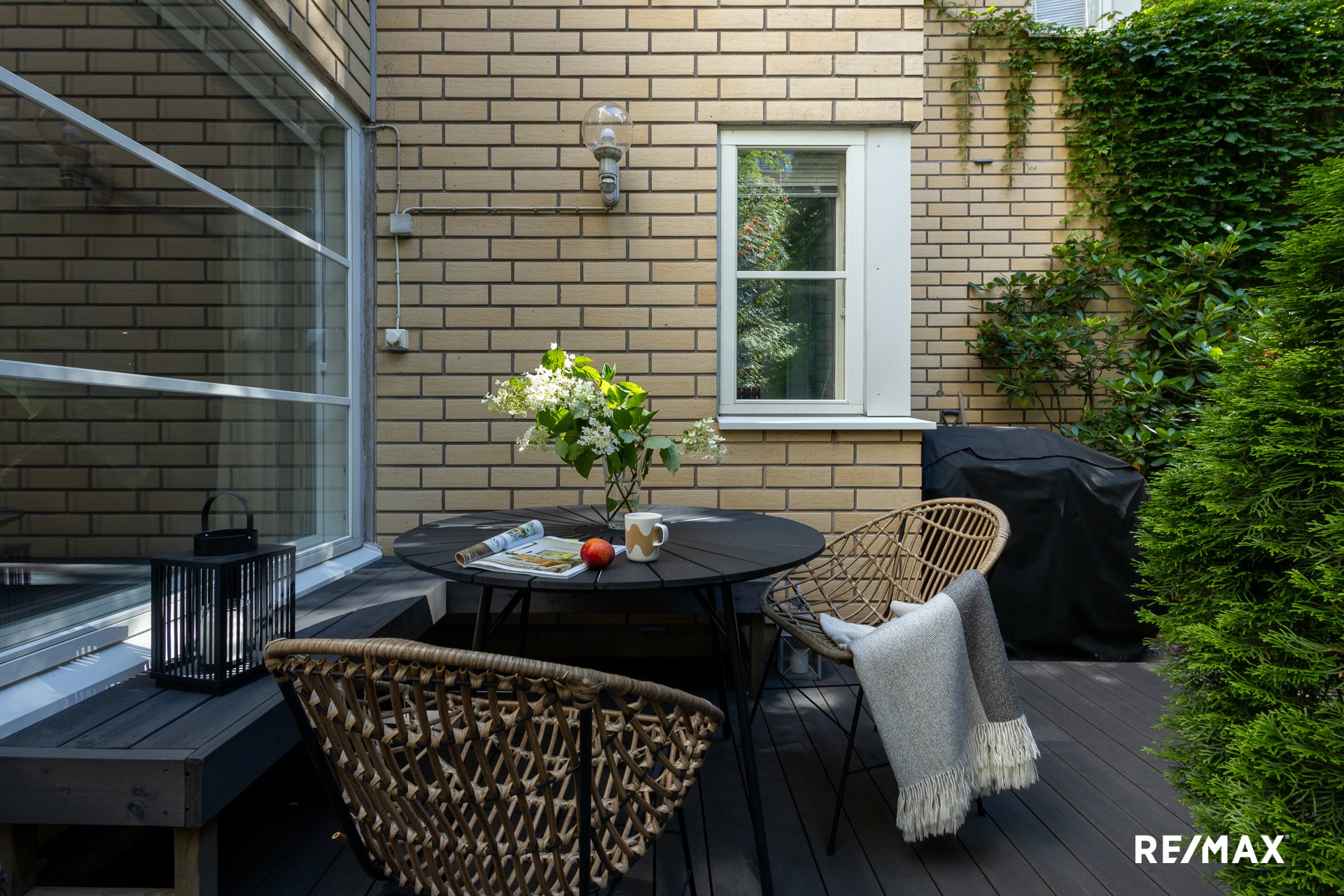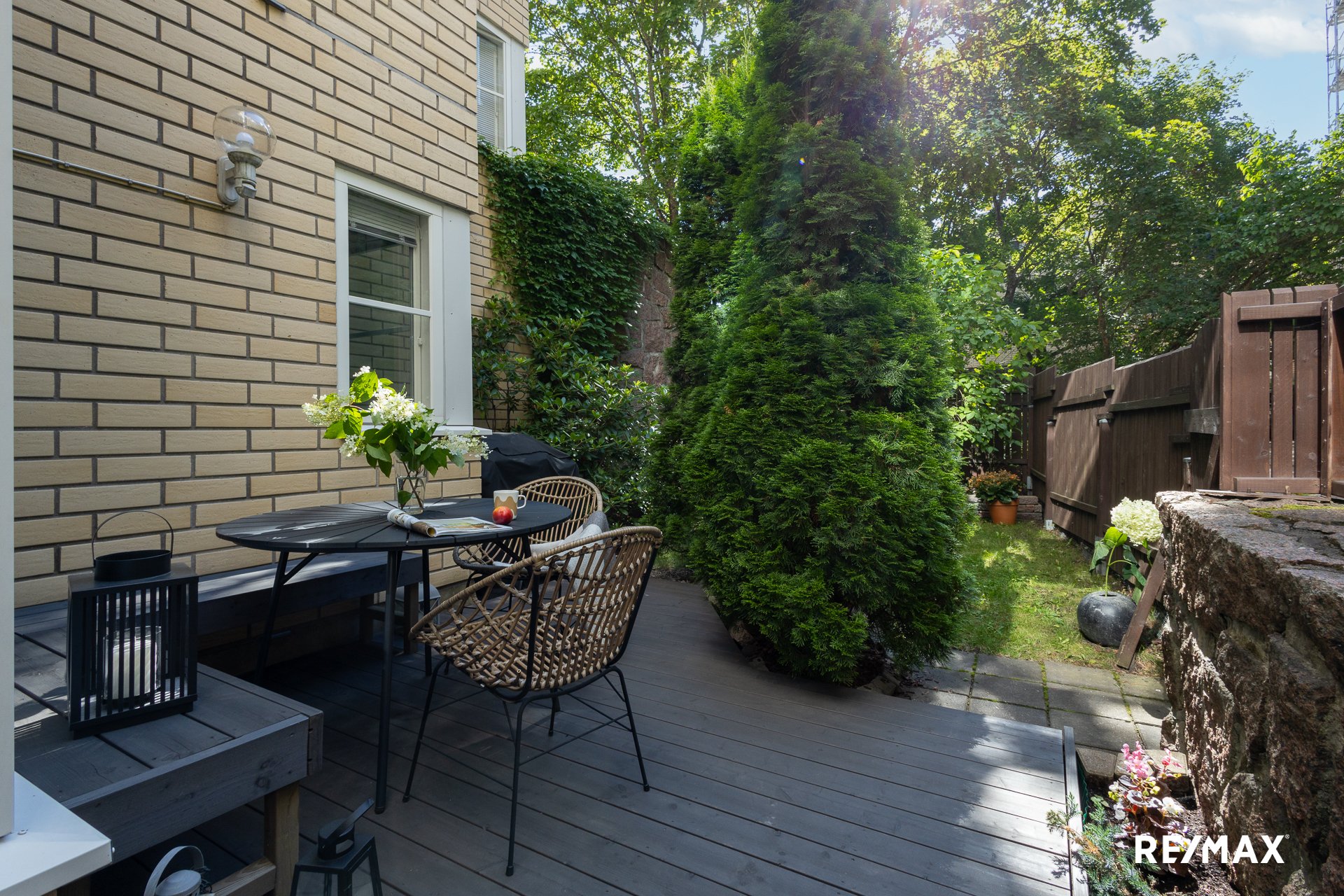 Tämän asunnon kruunaa oma suojaisa aidattu terassipiha, jossa on tilaa oleskeluun, grillaamiseen sekä pienen puutarhan vaalimiseen. Suuri vaahtera, sireenipensas ja upeat Tuijat tuovat vehreyttä sekä yksityisyyttä. Ihan heti ei arvaisi, että Kauppakeskus Tripla ja Pasilan asema ovat kävelyetäisyydellä.