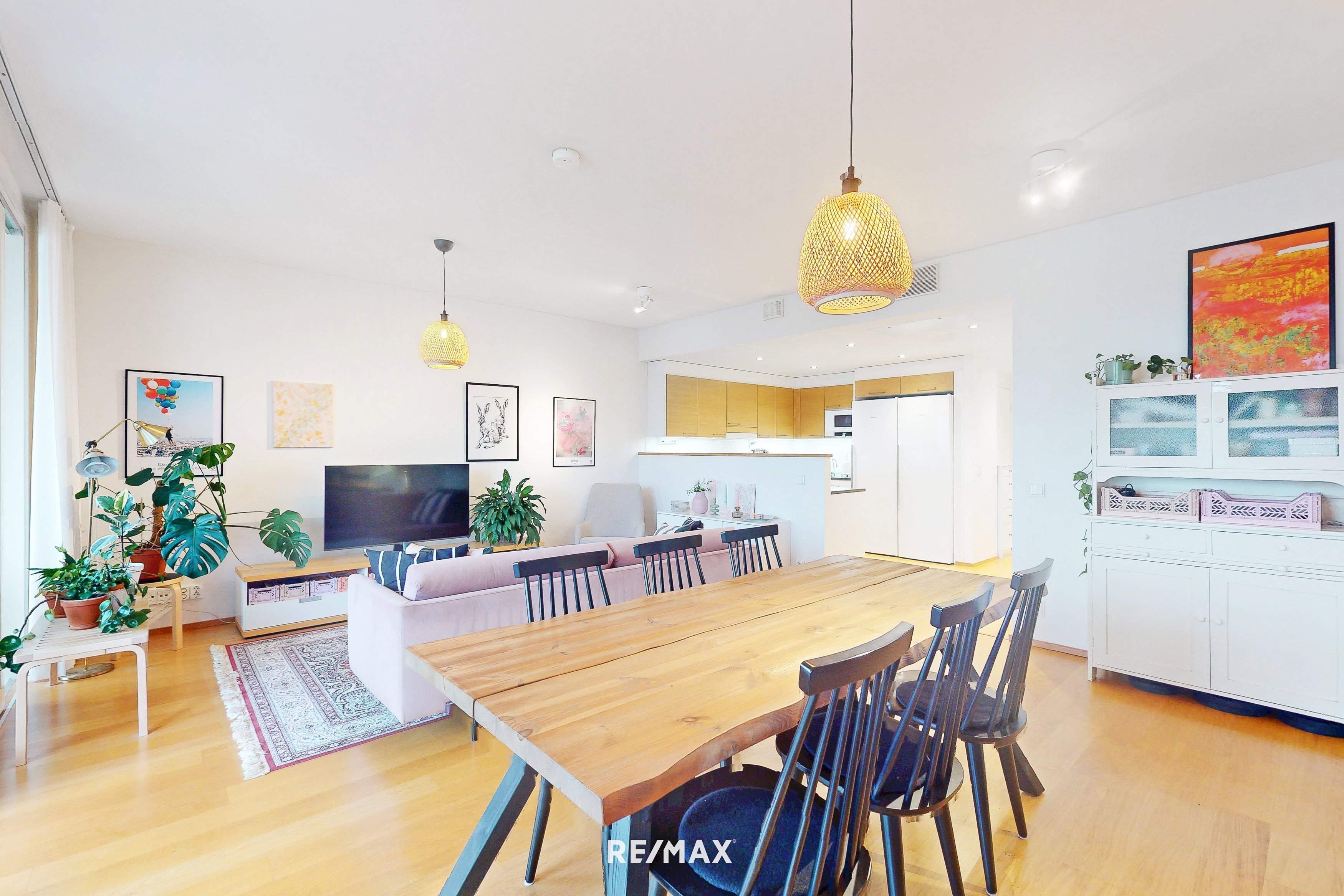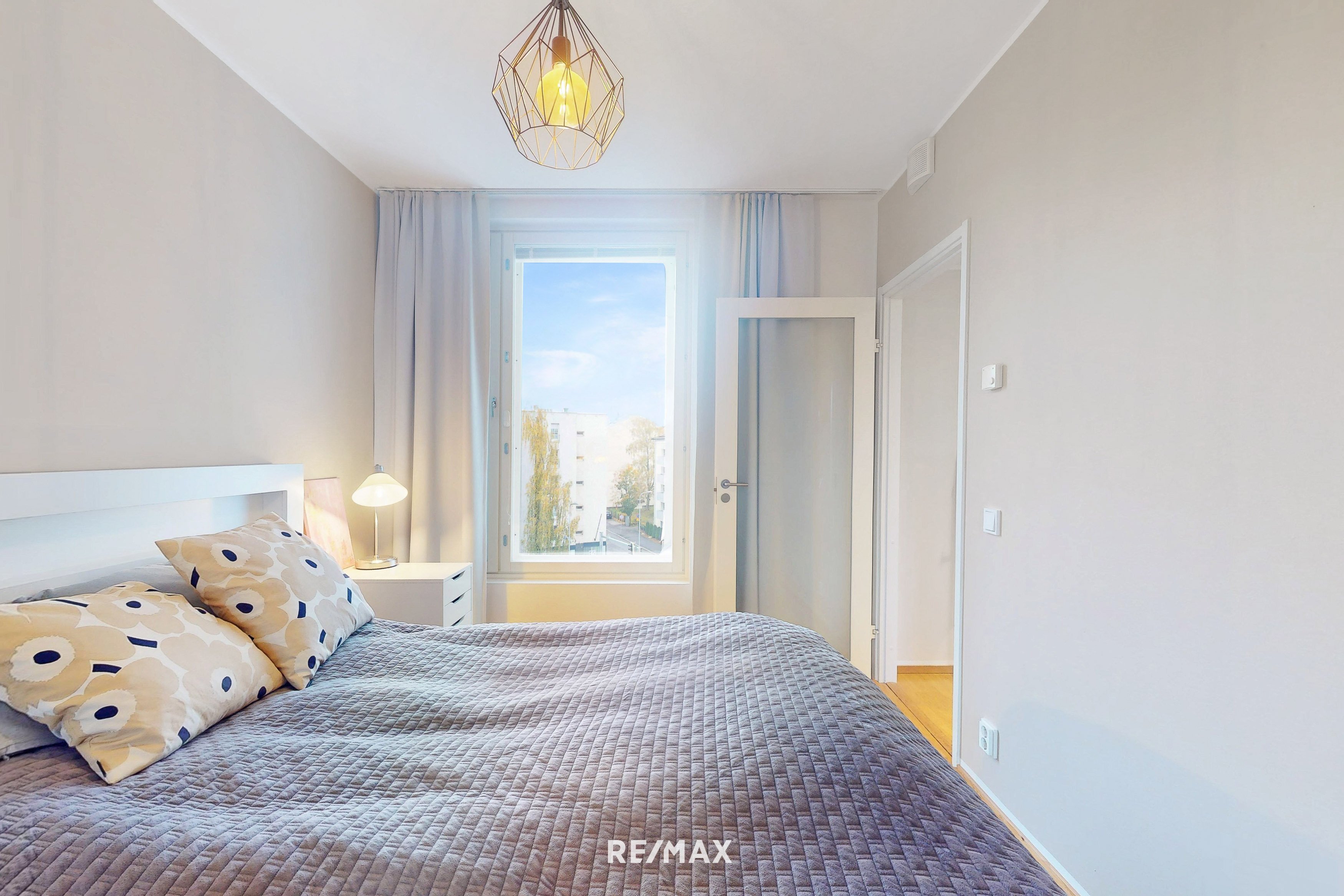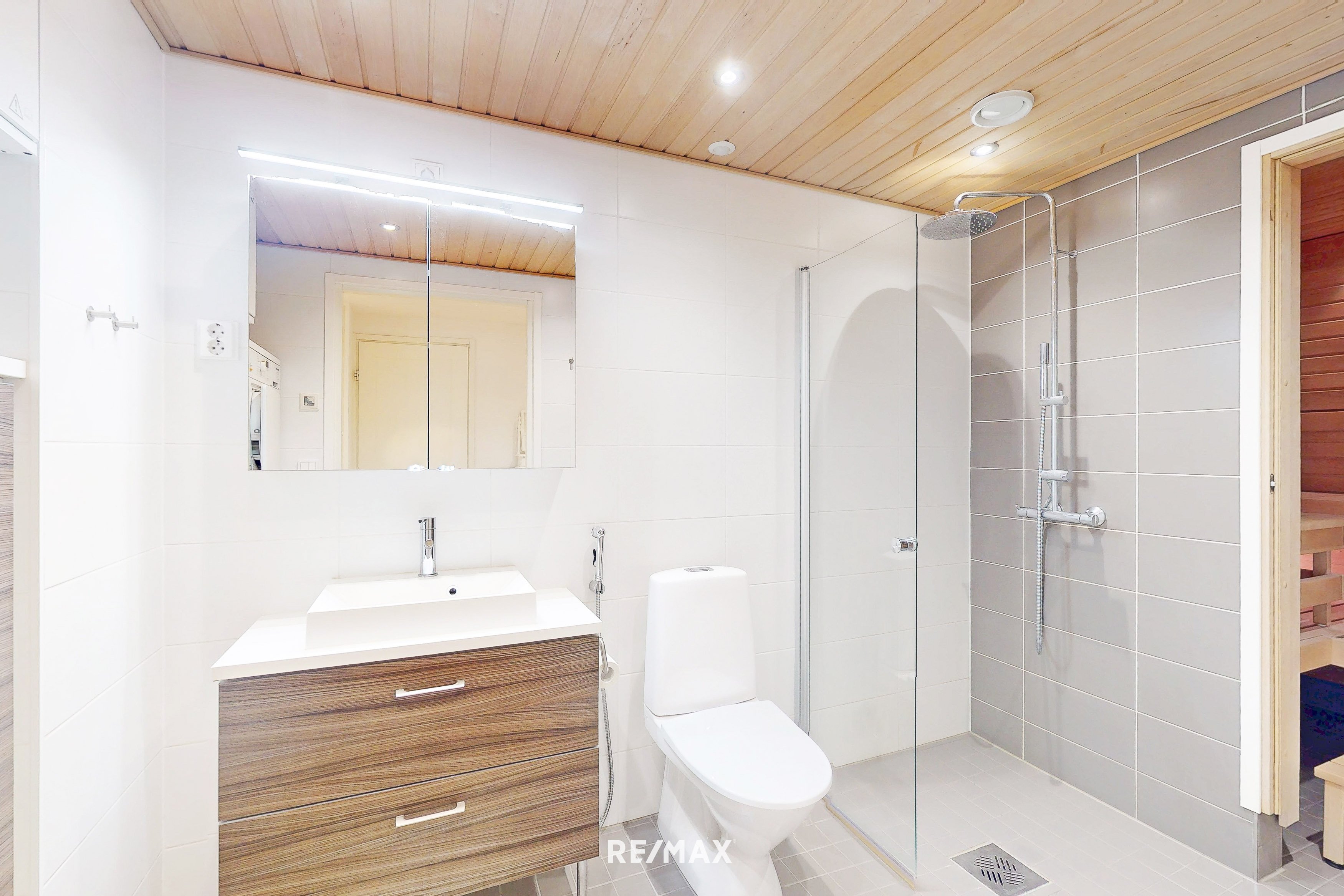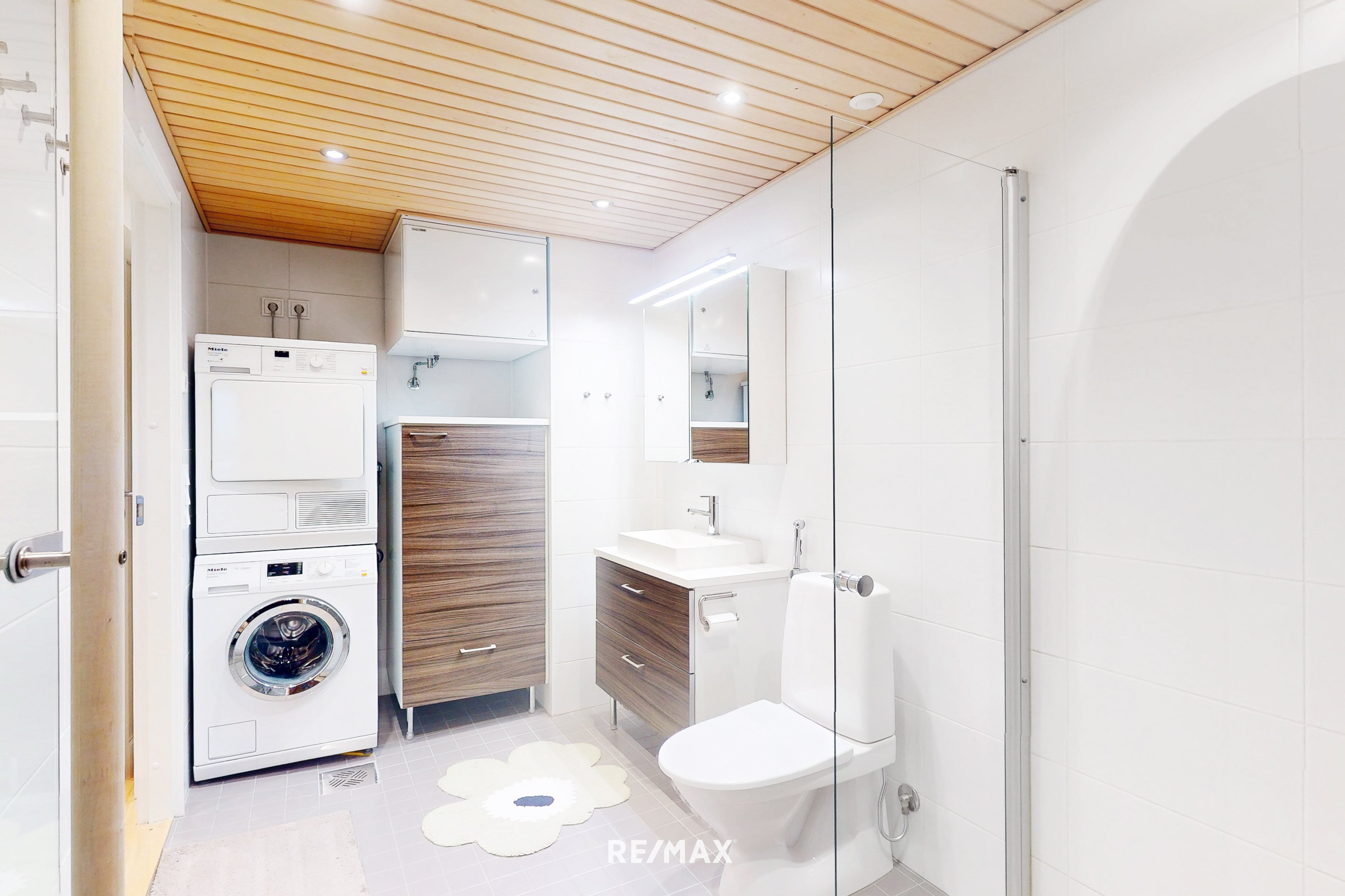 Avoin pohjaratkaisu yhdistää tilavan olohuoneen ja tyylikkään avokeittiön, jossa on runsaasti kaappi- ja työskentelytilaa sekä modernit kodinkoneet. Suuret ikkunat tulvivat valoa ja tuovat vuodenaikojen vaihtelun sisälle. Kaksi makuuhuonetta tarjoavat joustoa elämän eri vaiheisiin, ja säilytystilaa löytyy niin vaatehuoneesta kuin kellarikomerosta. Tilavan kylpyhuoneen yhteydessä on oma sauna, ja erillinen wc lisää arjen sujuvuutta.
