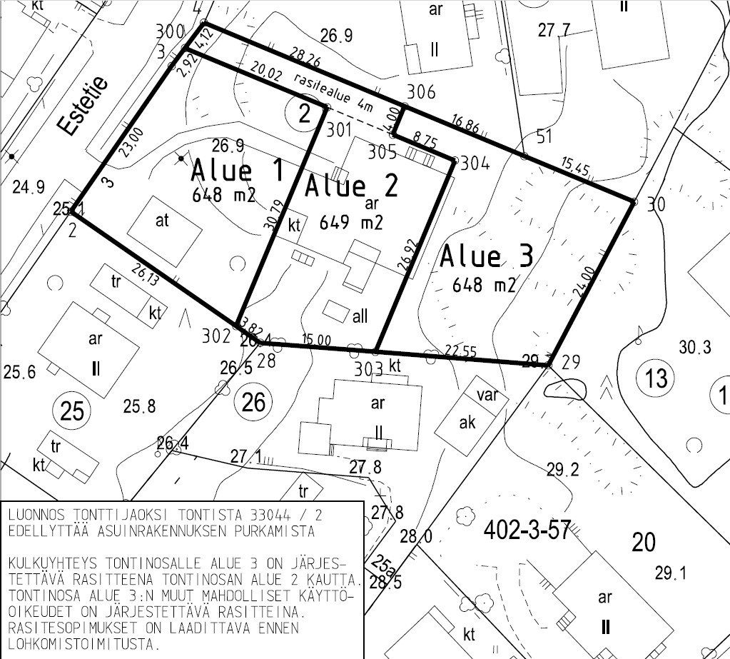 Rakennus on jo purettu pois. Mahdollisuus ostaa koko tontti tai 1/3 osa tontista, jolloin jokaiselle kolmelle myytävälle tontille tulee n. 648 m2 määräosa tontista tai ostajat tekevät keskenään hallinnanjakosopimuksen.