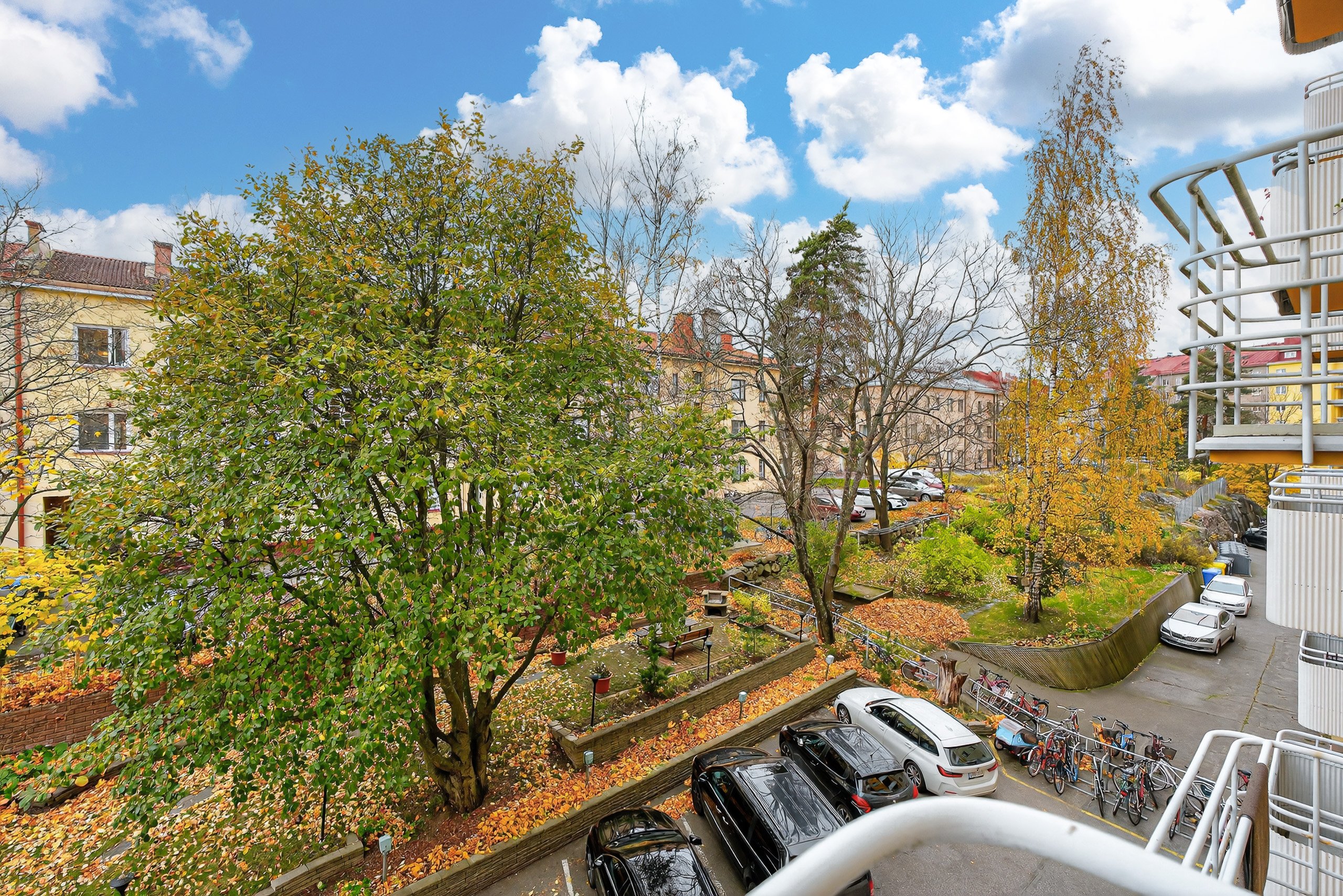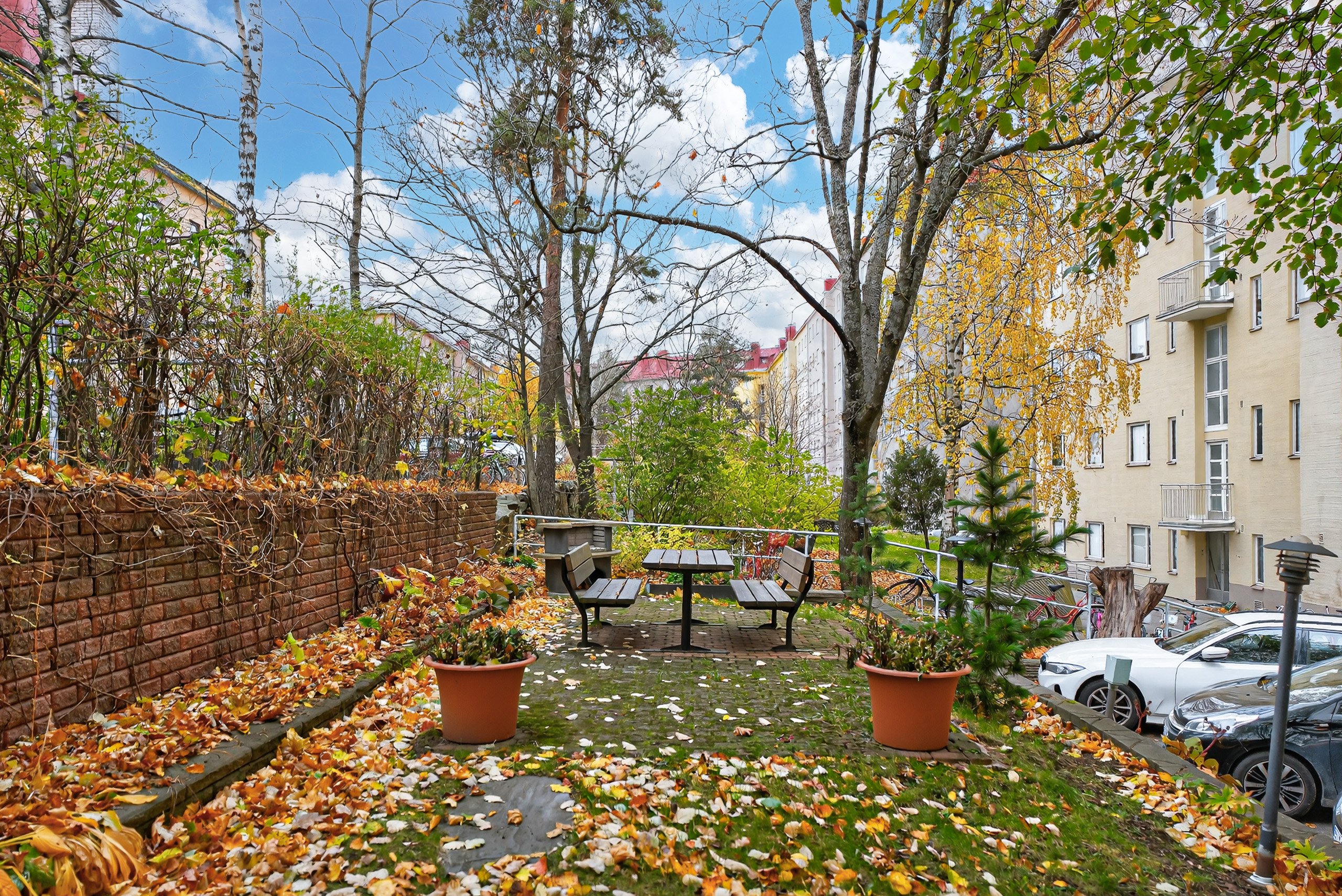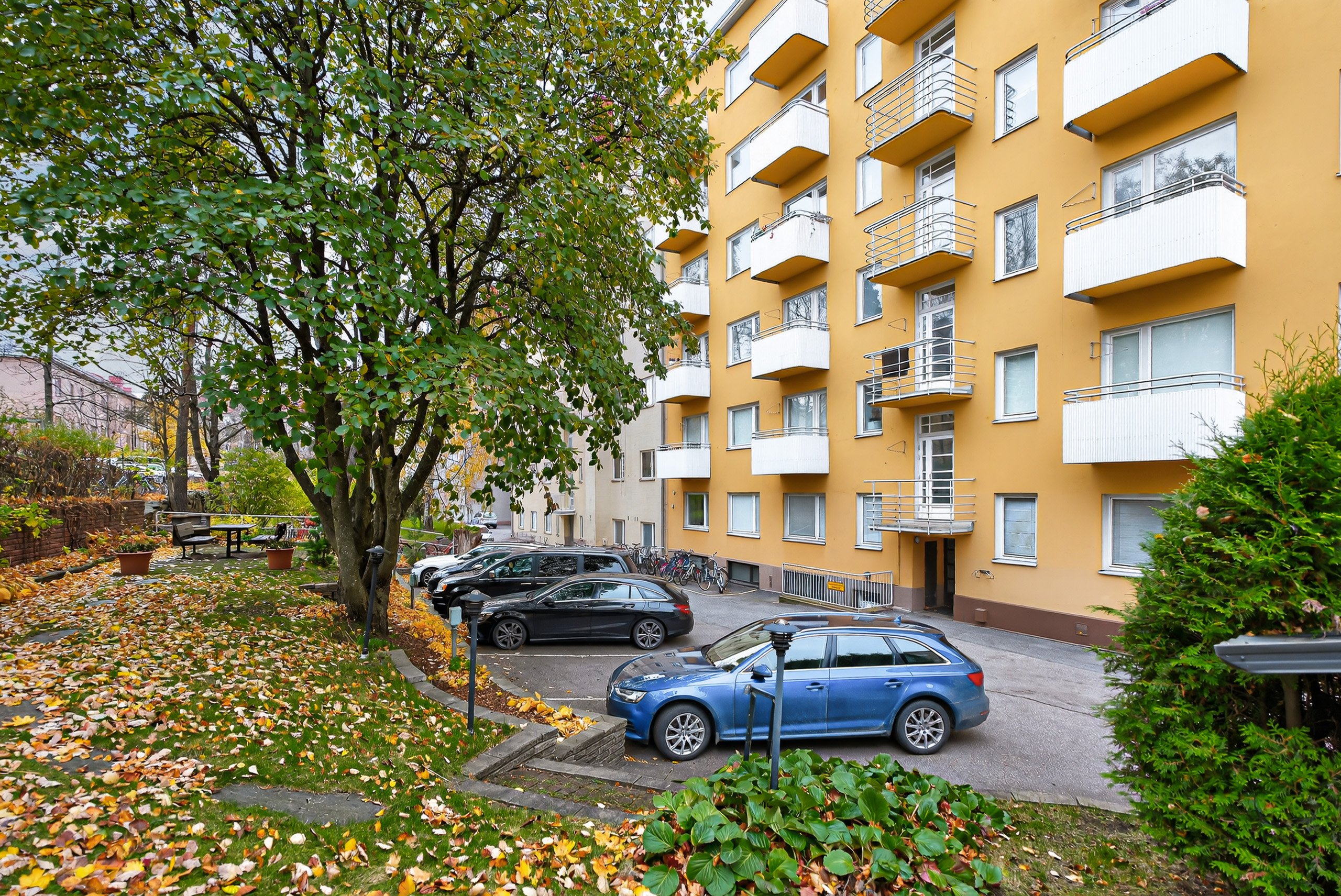 Tämä kaksio sijaitsee Meilahdessa, Mannerheimintien varrella, sisäänkäynti Valpurintien puolelta. Asunto on kolmannessa kerroksessa pihan puolella ja siitä on vehreät näkymät Pihlajatien suuntaan.