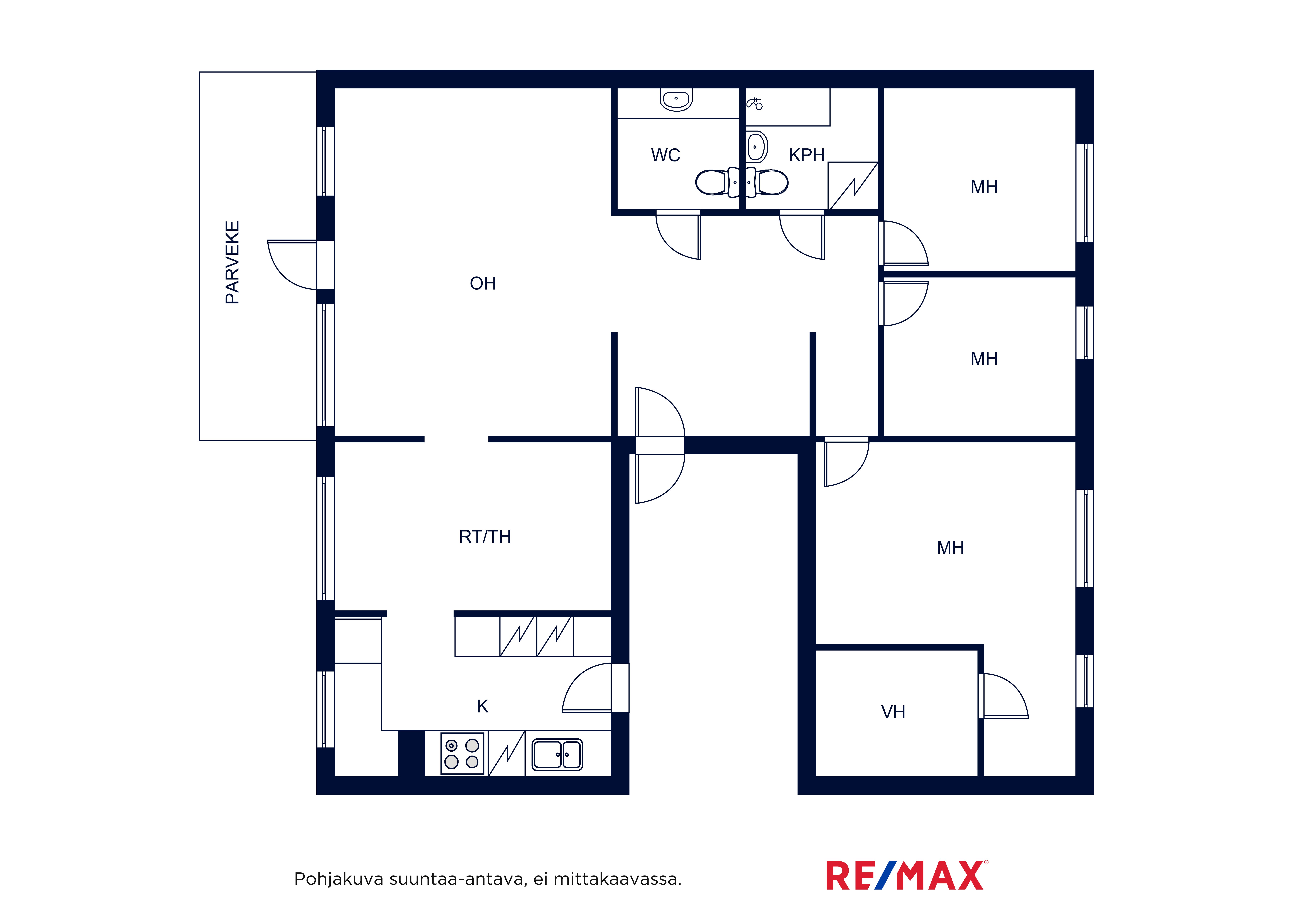 Asunnon sydän on sen todella tilava olohuone, josta on käynti asunnon lasitetulle parvekkeelle. Kolme makuuhuonetta ovat kivasti erillään olohuoneen oleskelualueesta. Keittiön vieressä oleva huone taas sopii hyvin joko ruokailutilaksi tai vaikkapa työhuoneeksi. Kylpyhuoneessa on pesukoneliitäntä ja wc-istuin ja lisäksi asunnossa on myös erillinen wc.