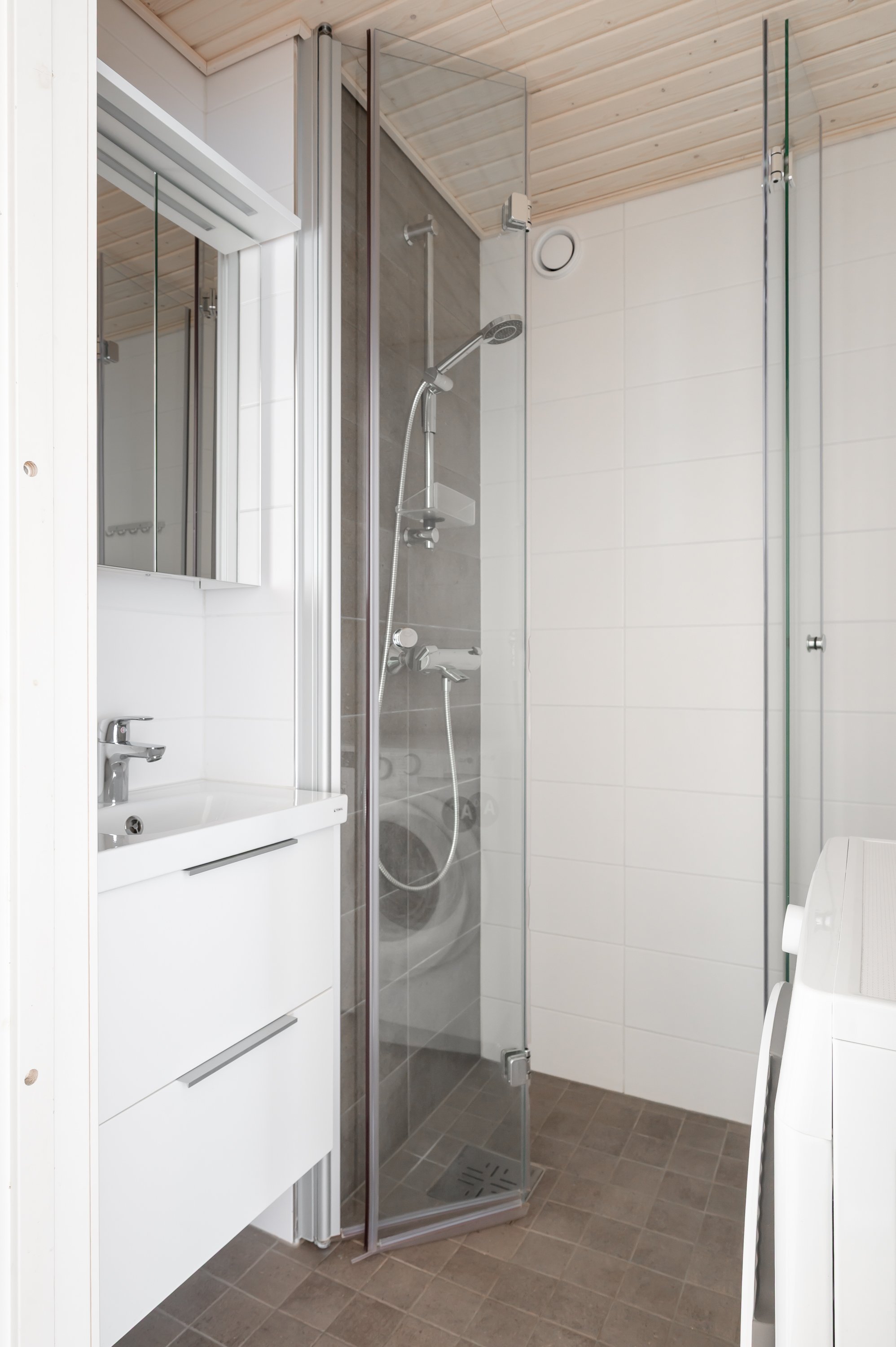 Suihku, suihkuseinä, pesukone, peilikaappi, pesuallas, allaskaappi ja kuivauspatteri