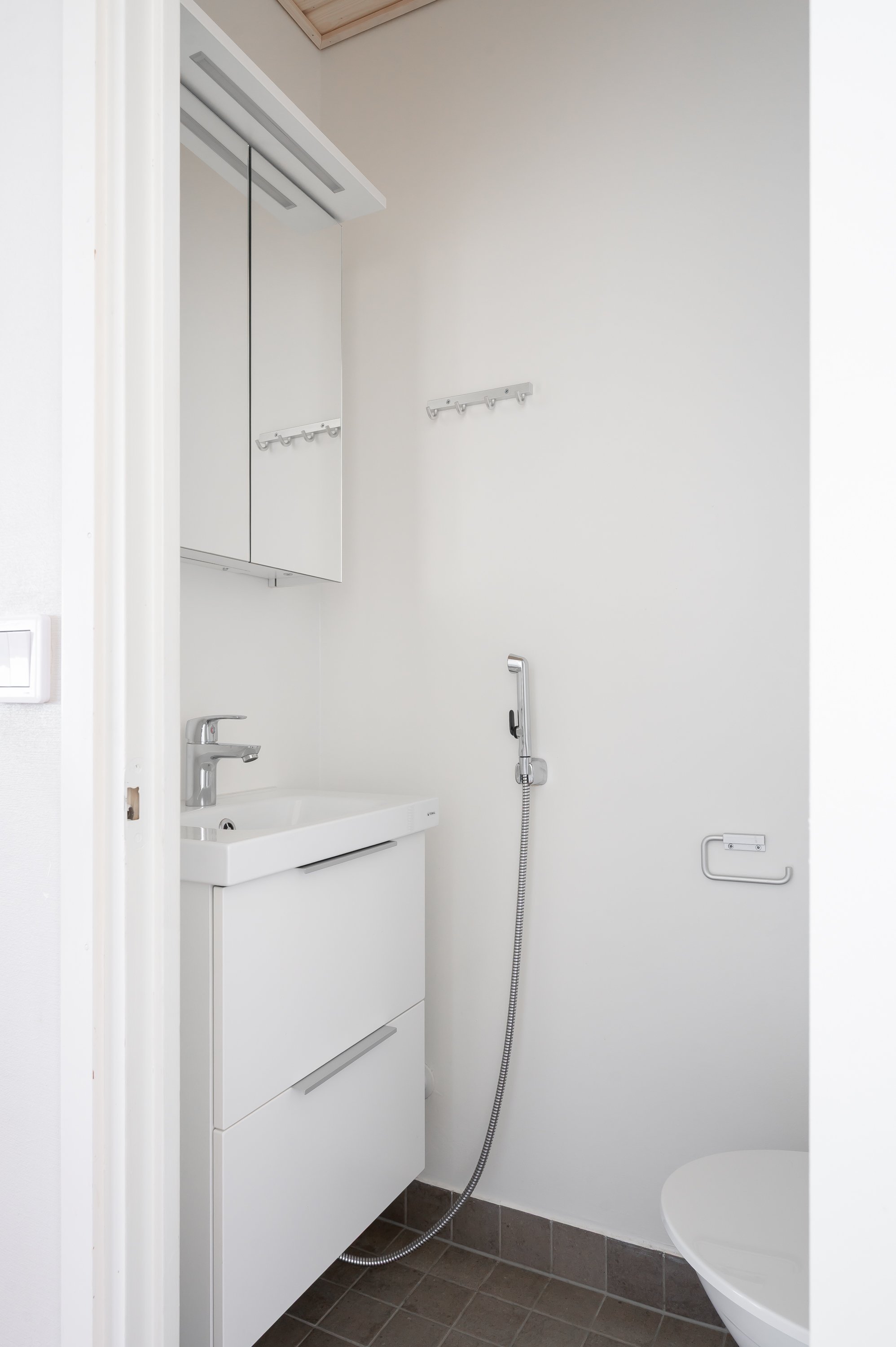 WC-istuin, peilikaappi, pesuallas, allaskaappi ja bidee-suihku
