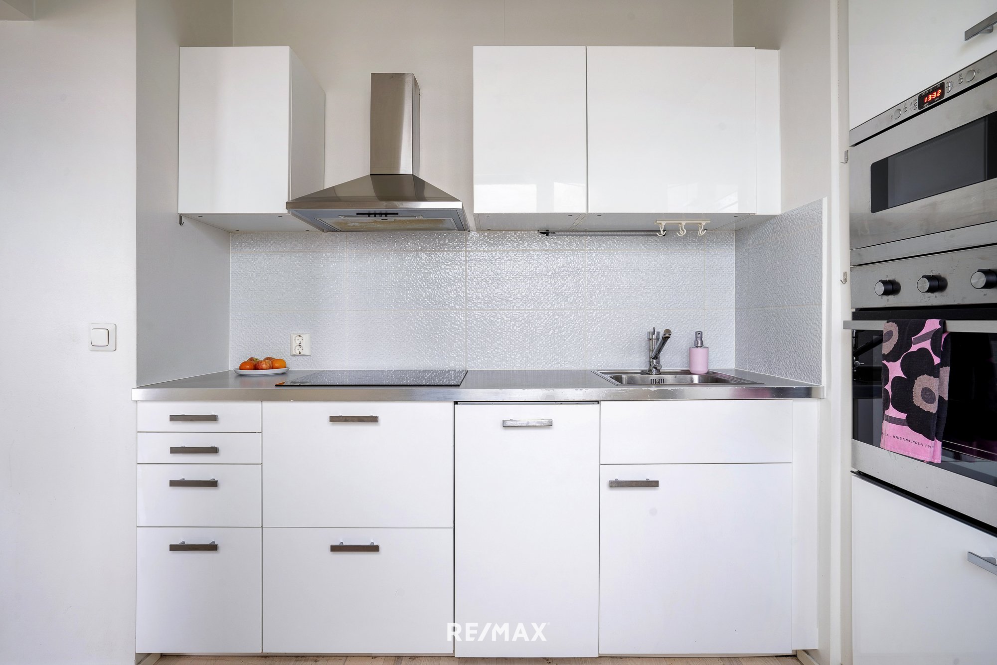 Asunnon tilava olohuone ja keittiö luovat toimivan kokonaisuuden, ja modernit kodinkoneet, kuten astianpesukone ja mikroaaltouuni, tekevät keittiöstä käytännöllisen. Eteisen yhteydestä löytyy käytännöllinen vaatehuone takeille ja kengille.
