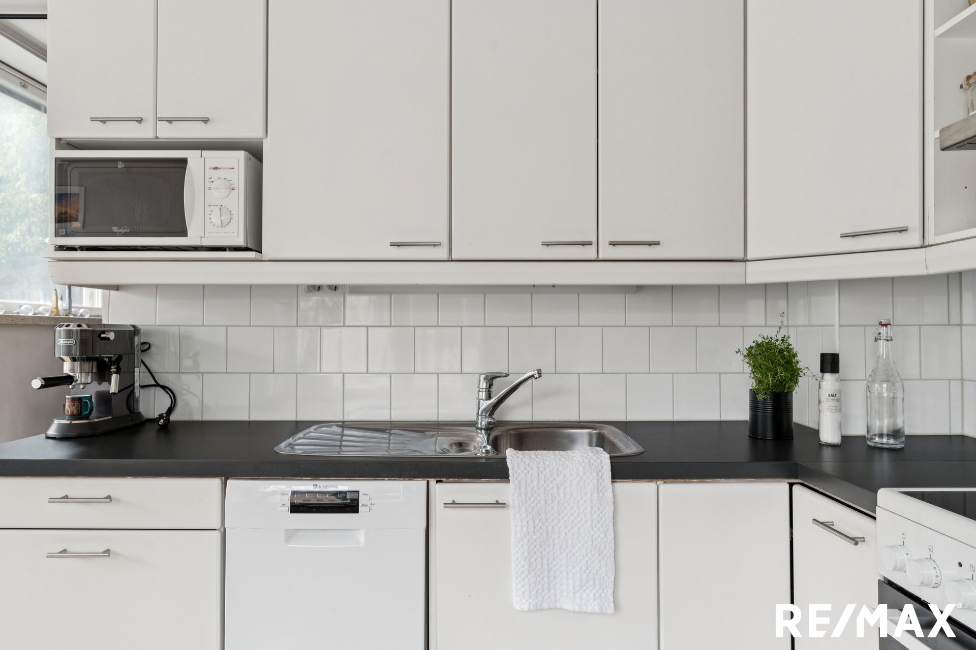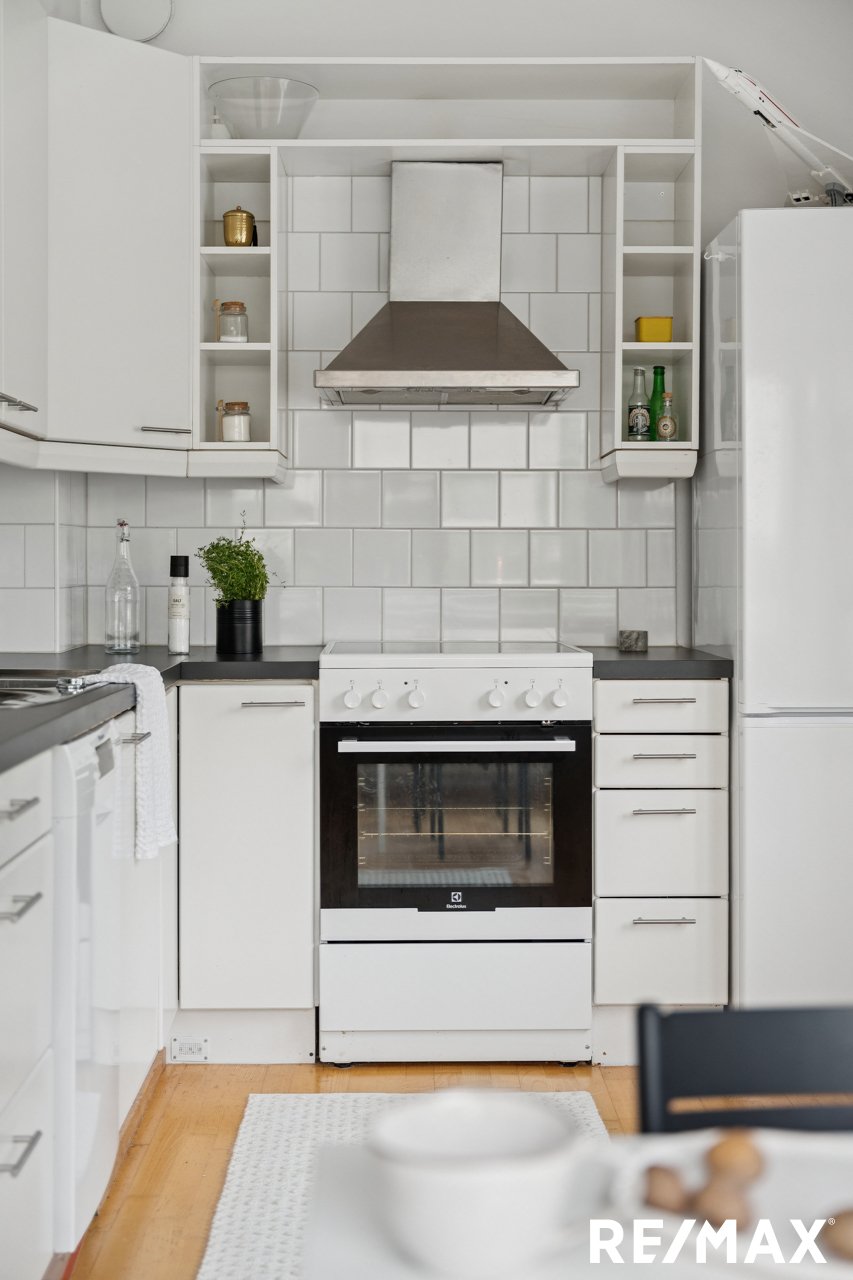 Asunnon keittiössä on runsaasti säilytys- ja työskentelytilaa, ja se on varustettu moderneilla laitteilla, kuten astianpesukoneella ja keraamisella liedellä. Ikkunat tuovat runsaasti luonnonvaloa sisään ja parkettilattiat luovat lämpimän tunnelman.