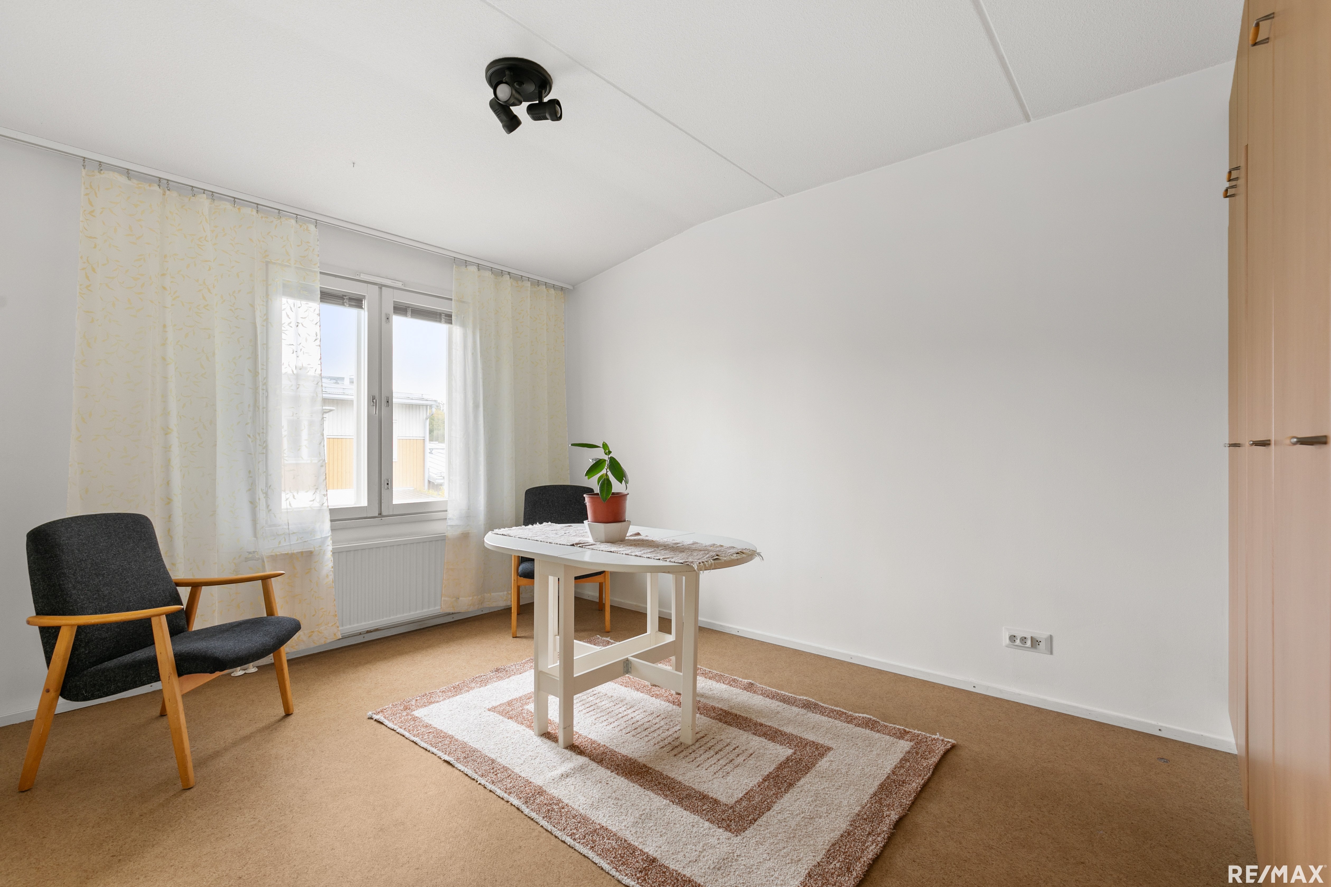 Toisen kerroksen asunto tarjoaa toimivan ja selkeän pohjaratkaisun: kaksi makuuhuonetta, tilava olohuone, erillinen keittiö sekä kylpyhuone. Asunnon sisäänkäynnissä on suojaisa kuisti ja käytössäsi on myös oma piha.