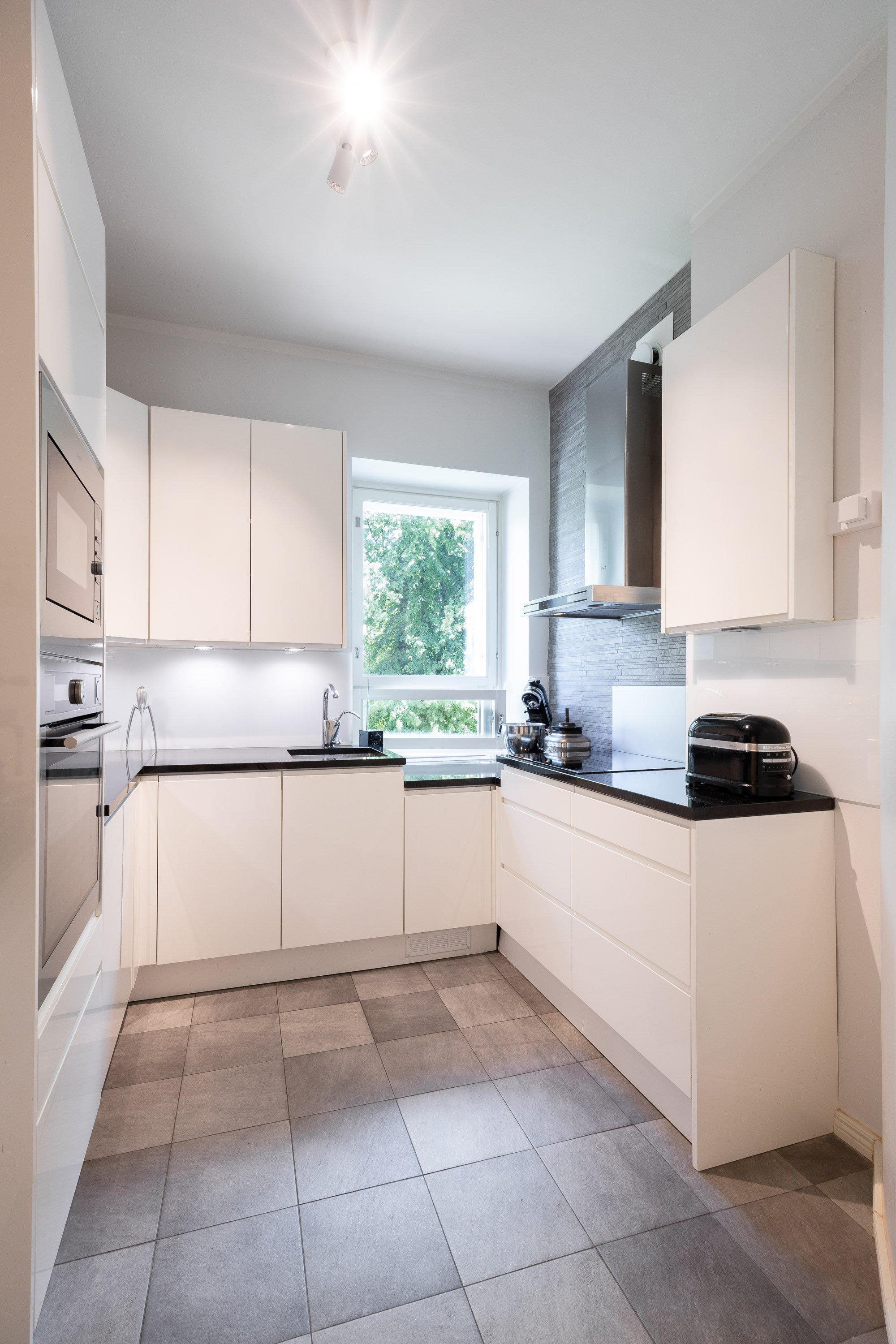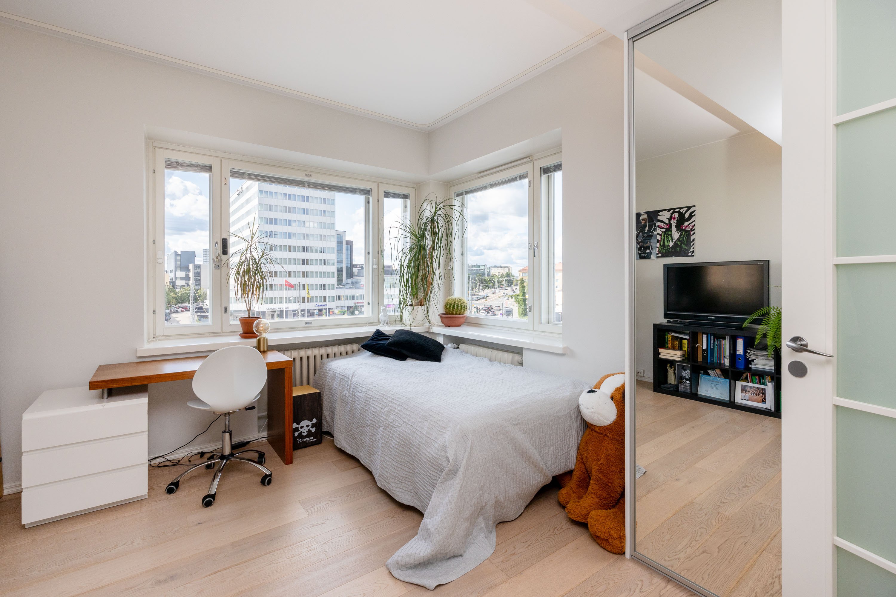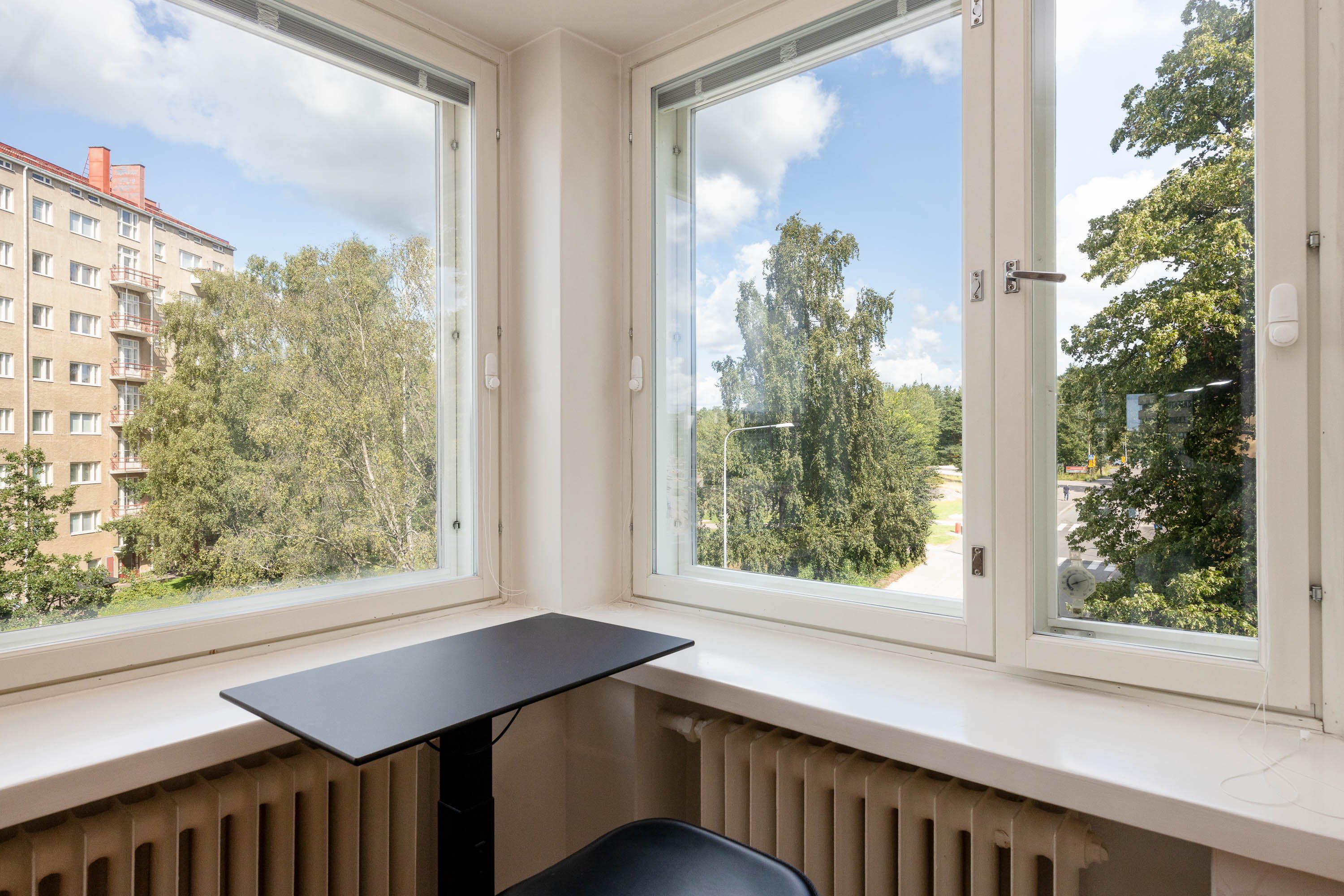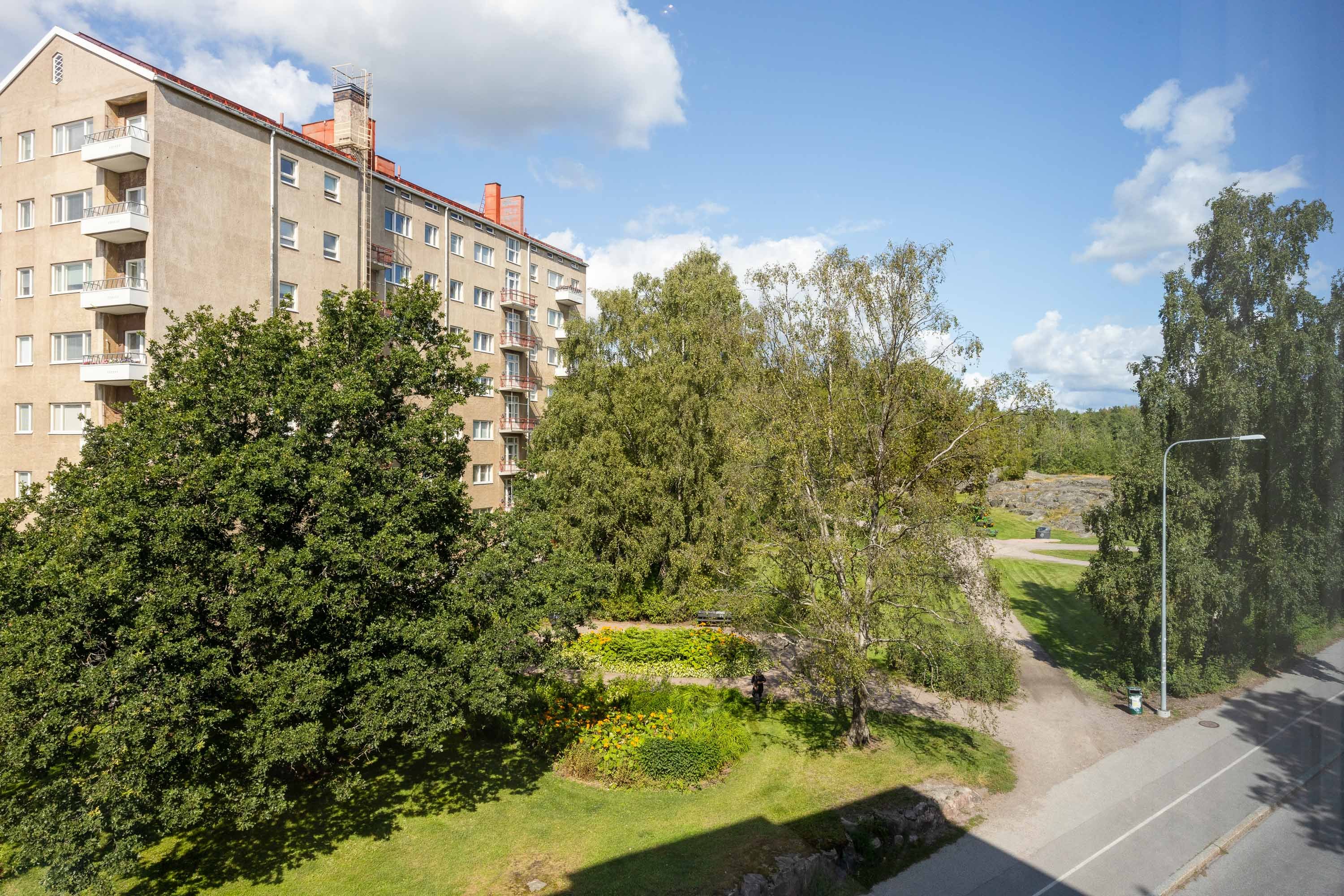 2021 ja kylpyhuone on uusittu v. 2023. Useissa huoneissa on näkymät kahteen suuntaan ja olohuoneessa peräti kolmeen. Ikkunanaapureita ei käytännössä ole, ympäristö on hyvin vehreä ja Keskuspuisto on aivan vieressä. Keittiössä on kivitasot ja laattalattia, jossa on sähköinen lattialämmitys, kuten on eteisen laattalattiassakin. Huoneet ovat myös reilun kokoisia. Huoneistolla on kahdet osakekirjat, jos haluaa erottaa yksiön erilliseksi asunnoksi.