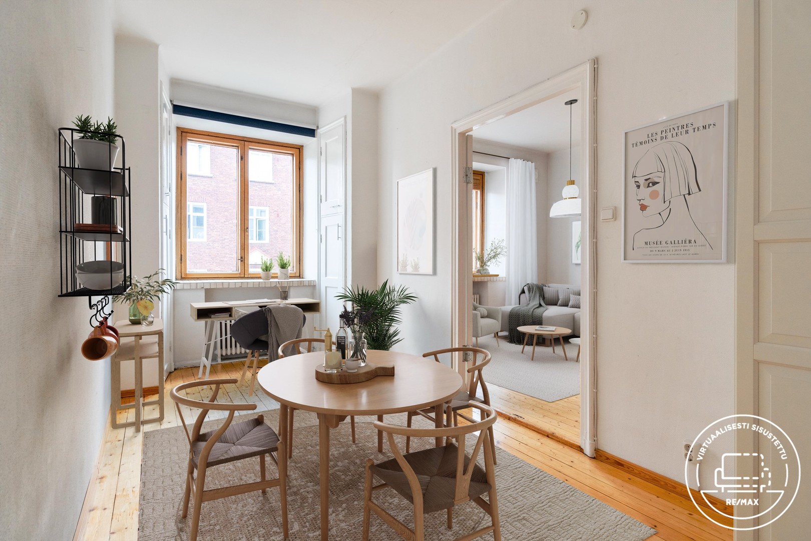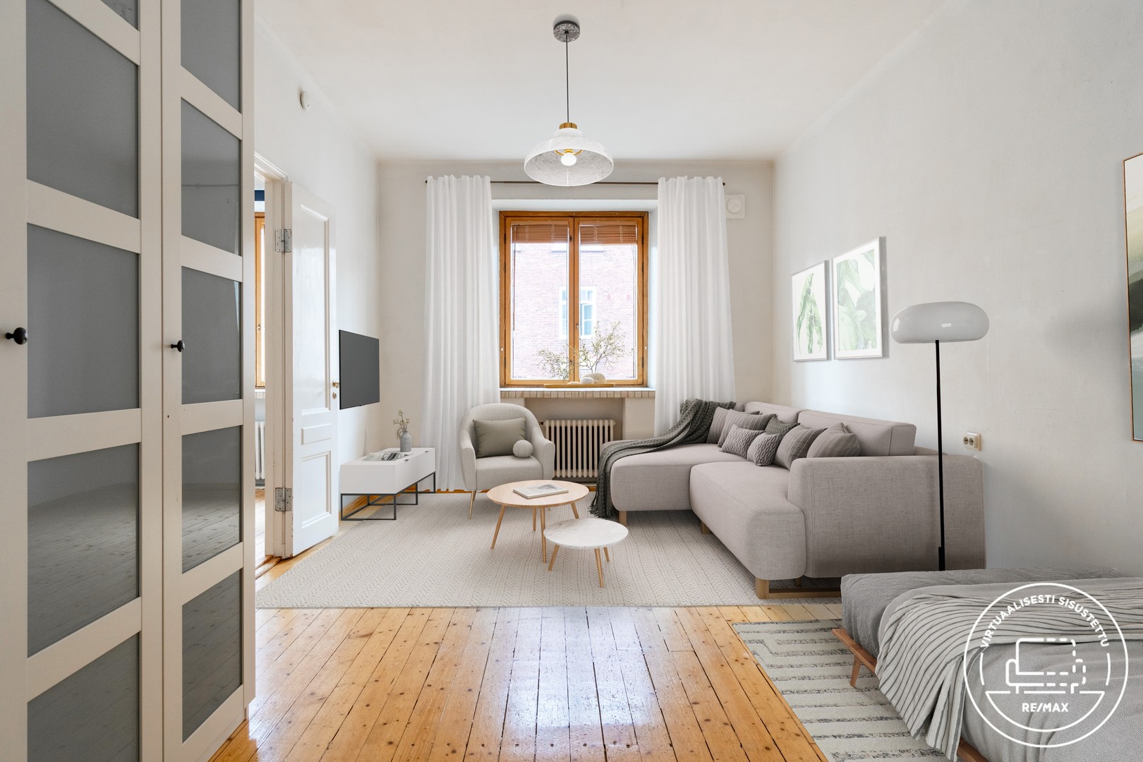 Tämä kaunis huoneisto tarjoaa korkeat huoneet ja runsaasti luonnonvaloa, mikä tekee asumisesta erittäin miellyttävää. Talo on rakennettu vuonna 1928, huoneisto on säilyttänyt viehättävän ilmeensä.