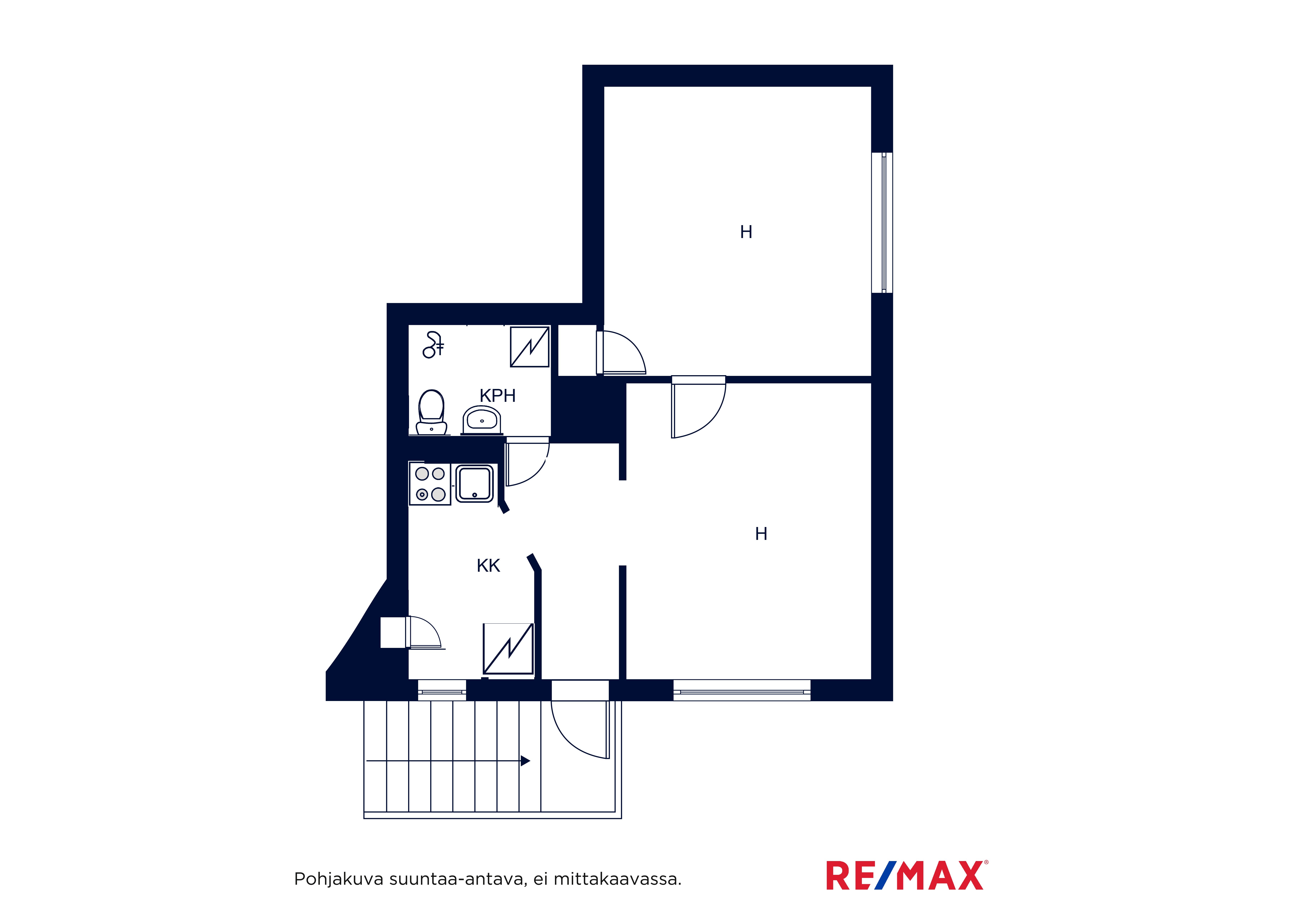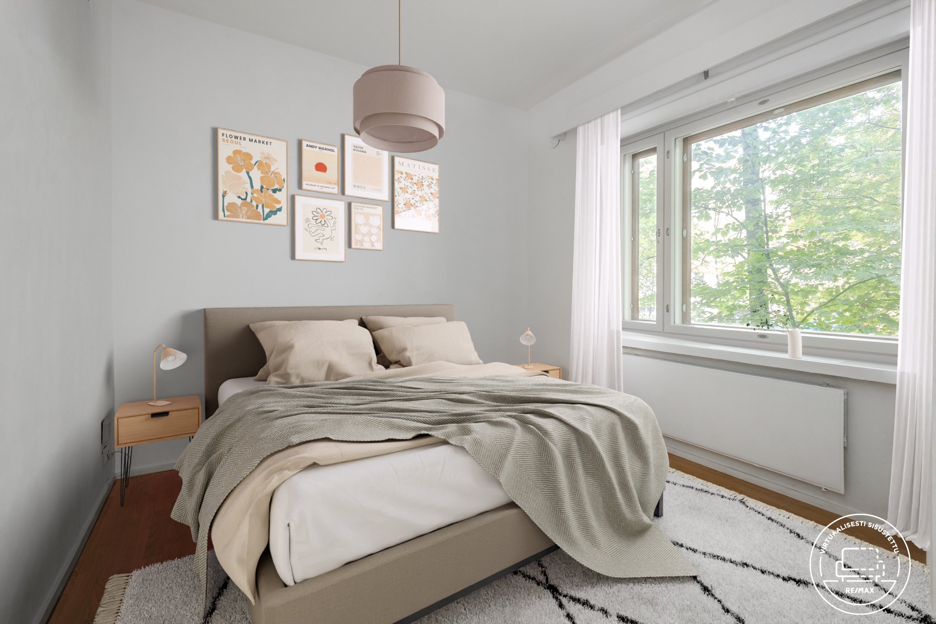 Asunnossa on kaksi tilavaa huonetta, ja molemmissa on isot ikkunat pihanäkymin. Makuuhuoneessa on käytännöllinen vaatehuone. Keittokomerossa on ikkuna ja kiinteä säilytyskaappi. Kylpyhuone on suuri ja siellä on paikka pyykinpesukoneelle.