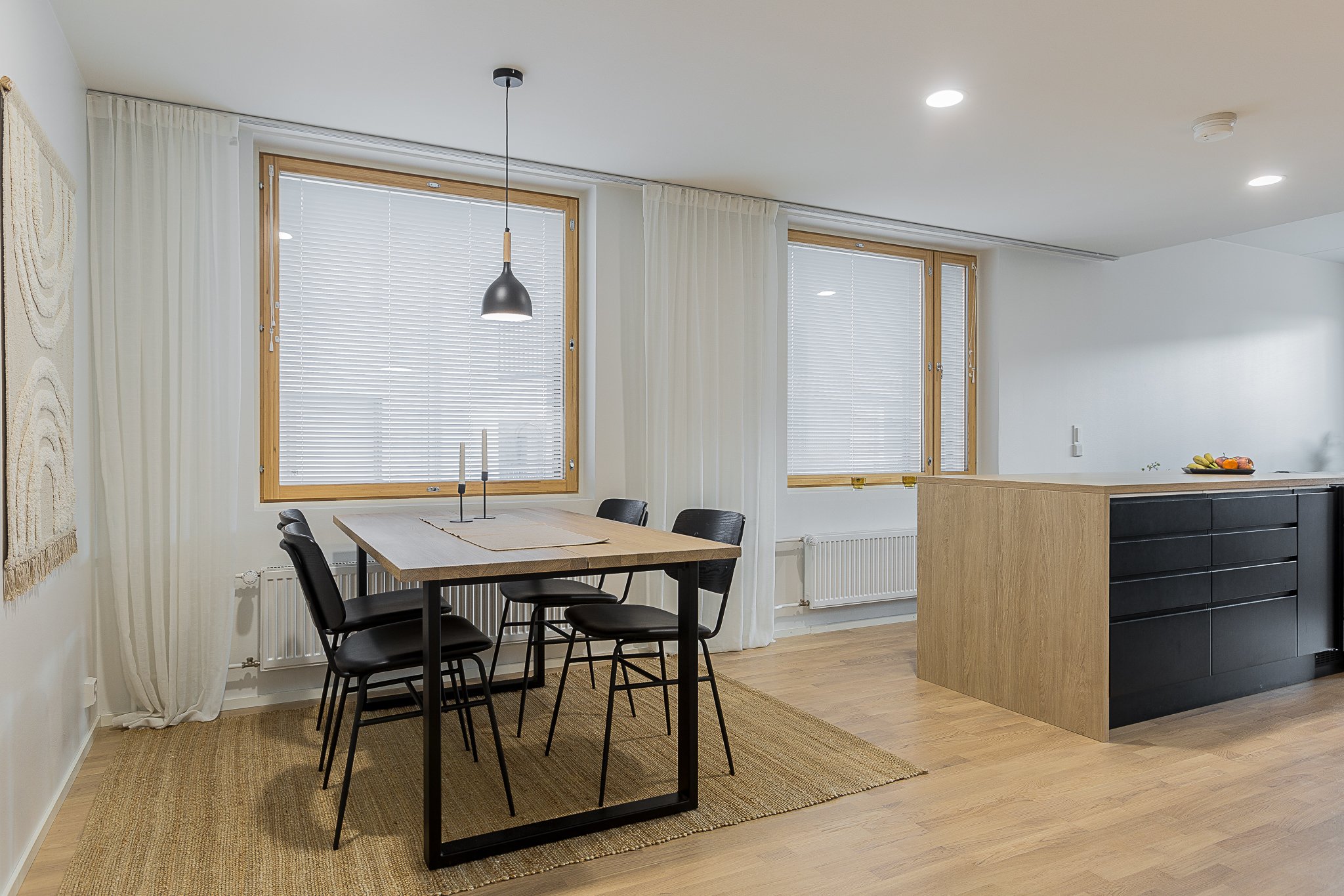 Upean kodin avokeittiö, saareke, ruokailutila ja olohuone muodostavat yhtenäisen ja avaran kokonaisuuden, jossa on helppo viihtyä ja viettää aikaa.