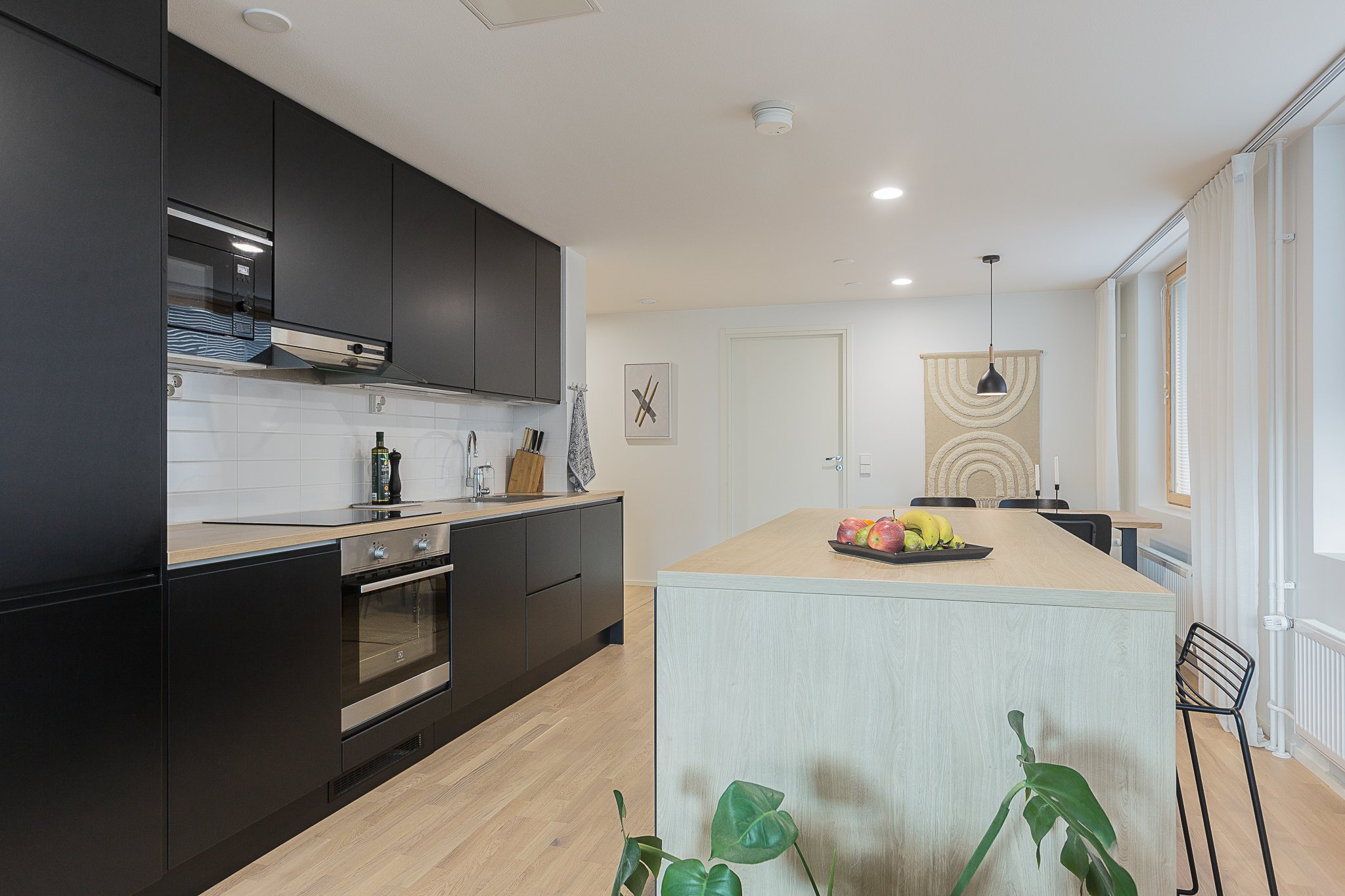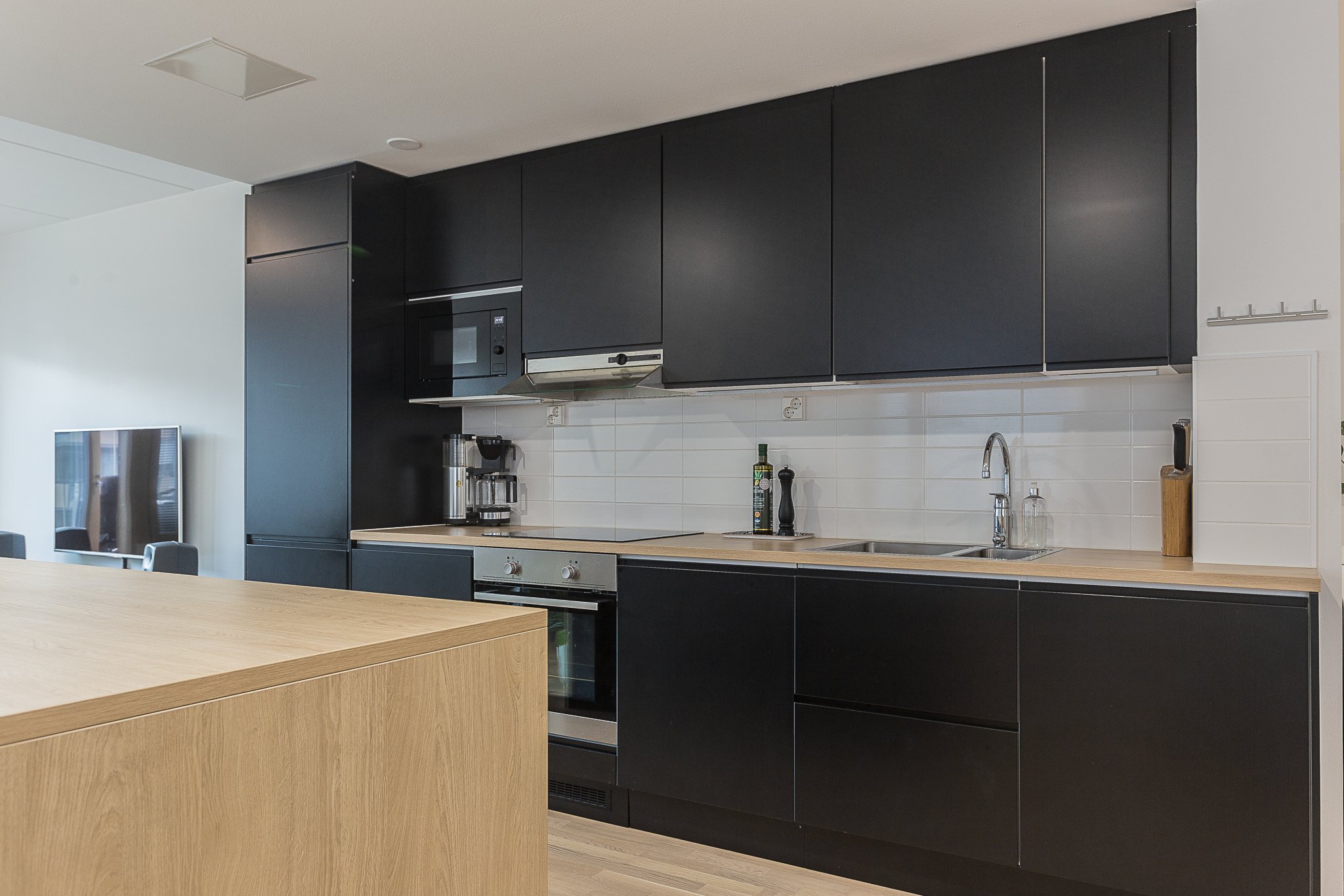 Kaapistot, tasot, integroitu jääkaappi/pakastin, induktio liesitaso, erillisuuni, liesituuletin, integroitu mikro, integroitu astianpesukone, viinikaappi (Temptech). Välitila: Kaakeli.