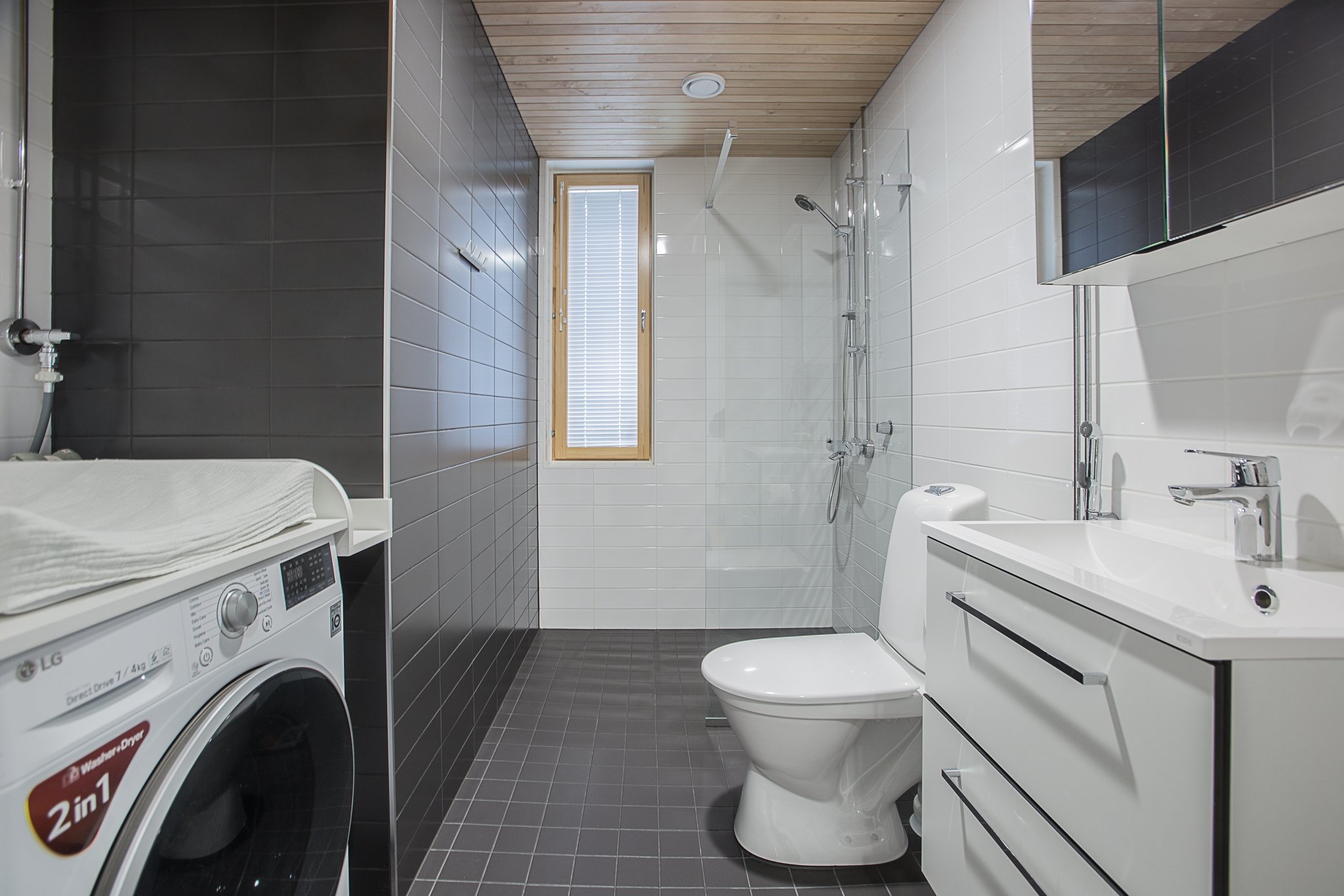 Lattialämmitys, suihku, suihkuseinä, peilikaappi, wc-istuin, allaskaappi, bidee, pesukoneliitäntä.