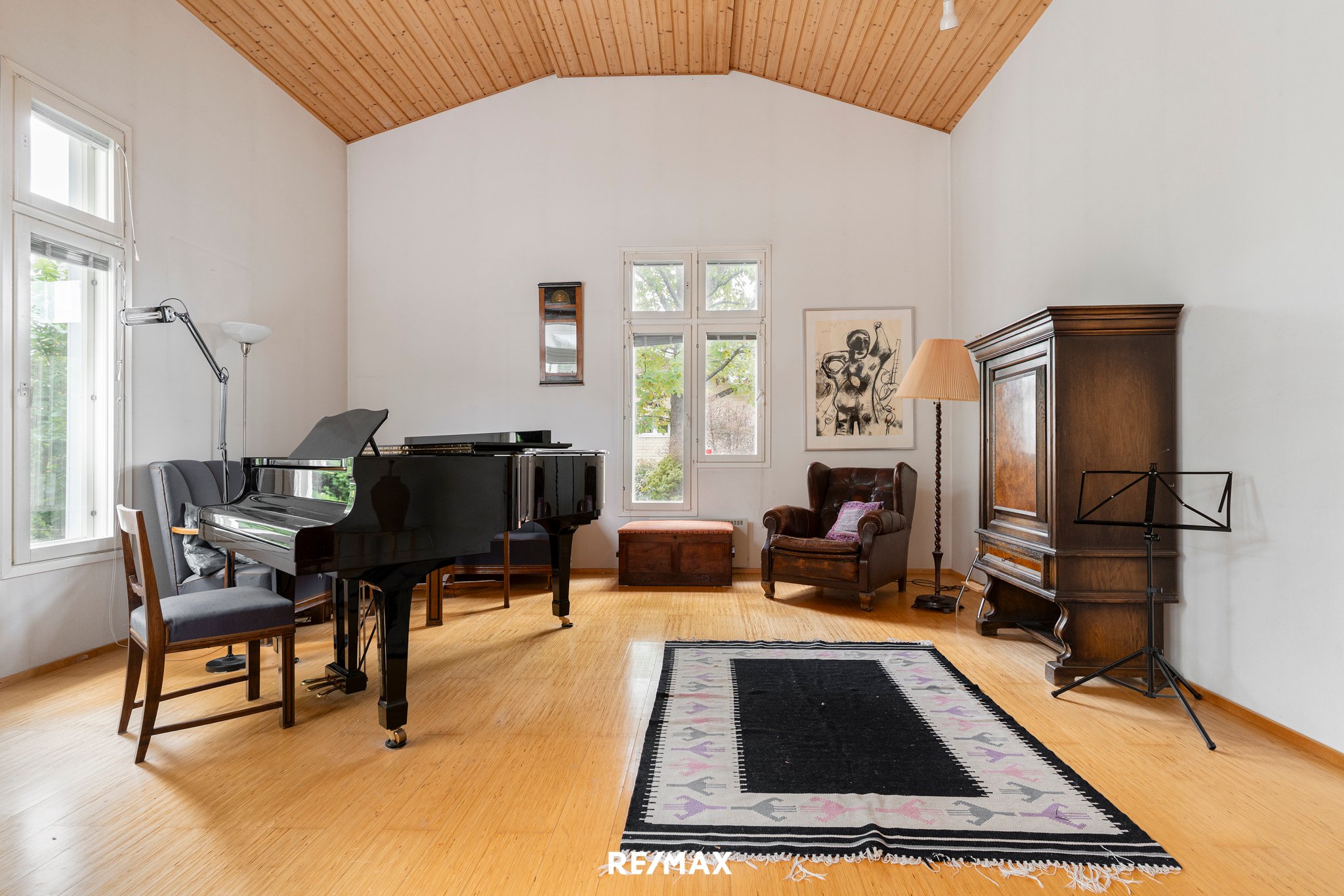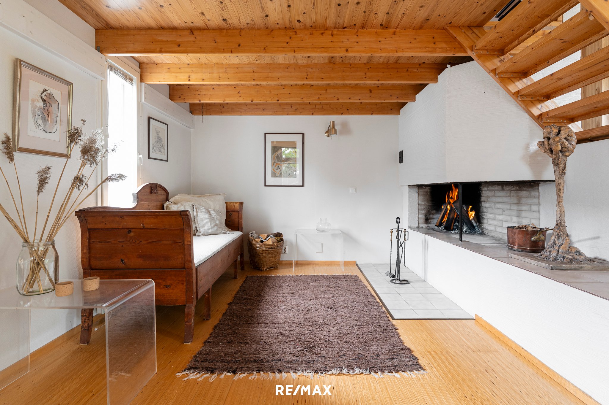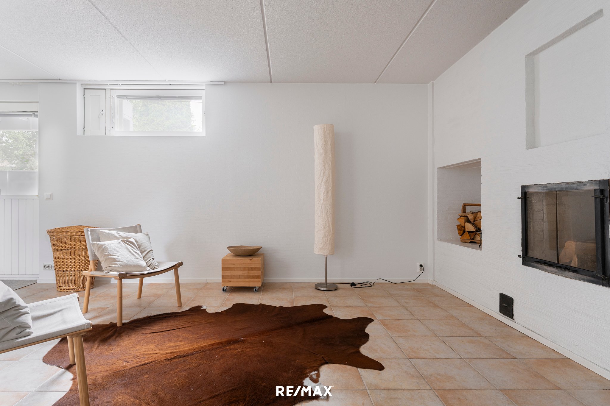 Puoli kerrosta alempana avautuu kodin sydän – upea olohuone, jonka näyttävä huonekorkeus, takka ja suuret ikkunat tuovat valon osaksi sisustusta. Olohuoneesta on käynti suojaisalle ja viihtyisälle piha-alueelle, jossa on tilaa sekä rentoutumiselle että yhdessäololle. Parvi lisää kodin käyttömahdollisuuksia – se sopii täydellisesti työhuoneeksi, kirjastoksi tai rauhalliseksi lukunurkkaukseksi.