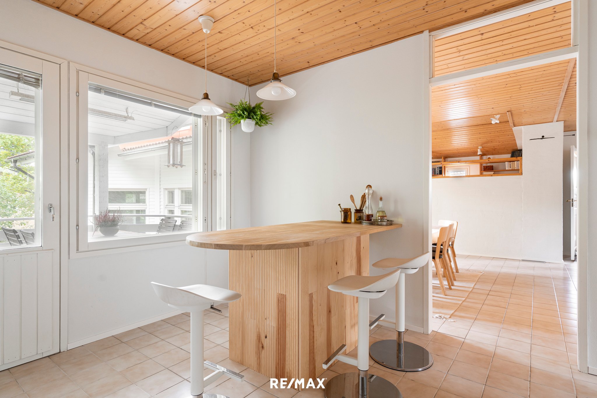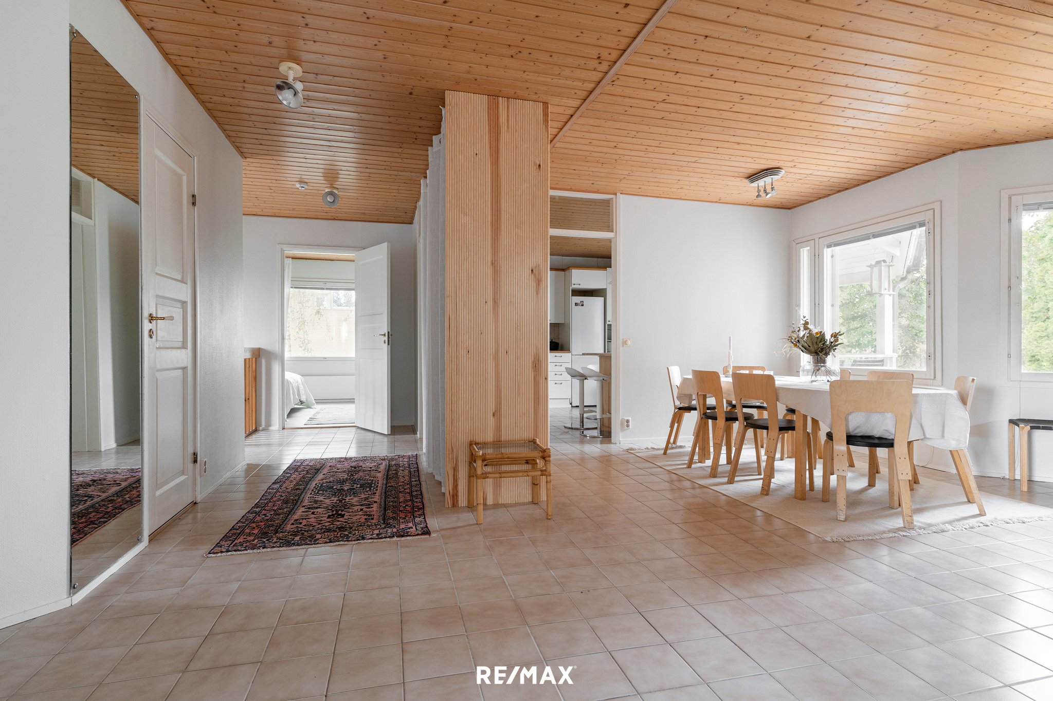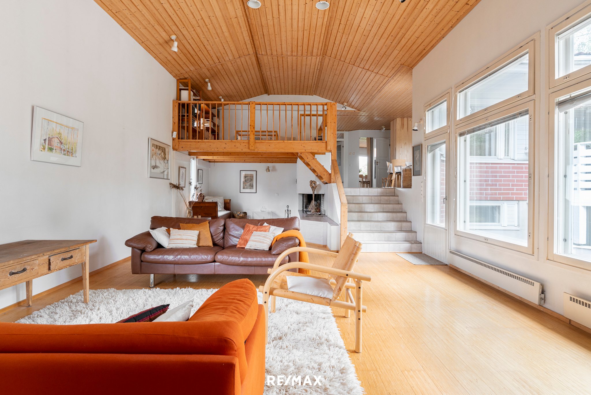 Tämä koti hurmaa ainutlaatuisella arkkitehtuurillaan ja valoisilla, eri tasoihin jakautuvilla tiloillaan. Jo sisään astuessa avautuu tilava ja kutsuva eteinen, josta on yhteys kolmeen makuuhuoneeseen, keittiöön ja erilliseen ruokailutilaan.
