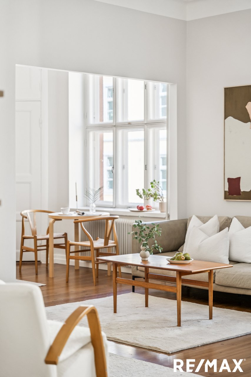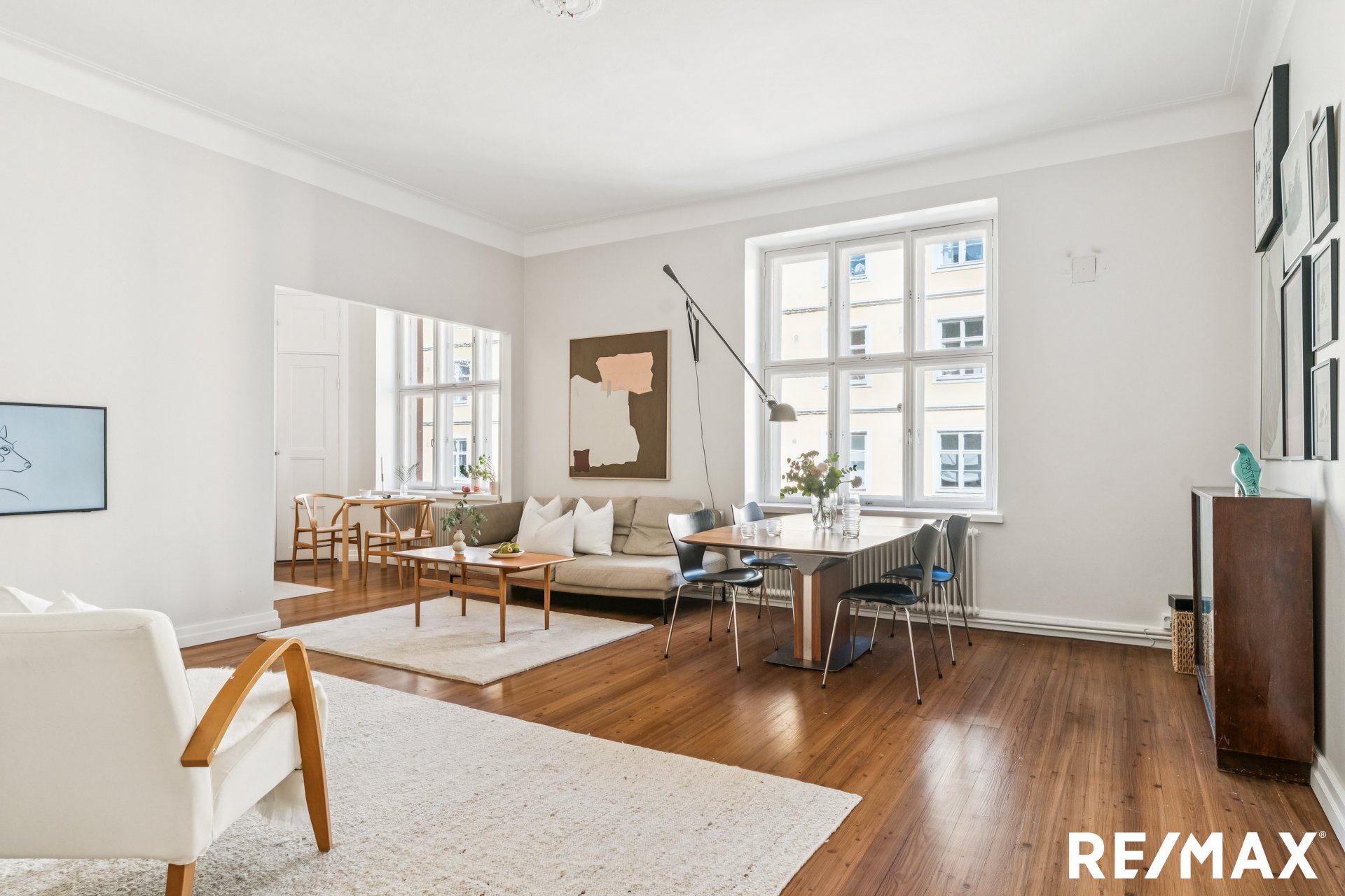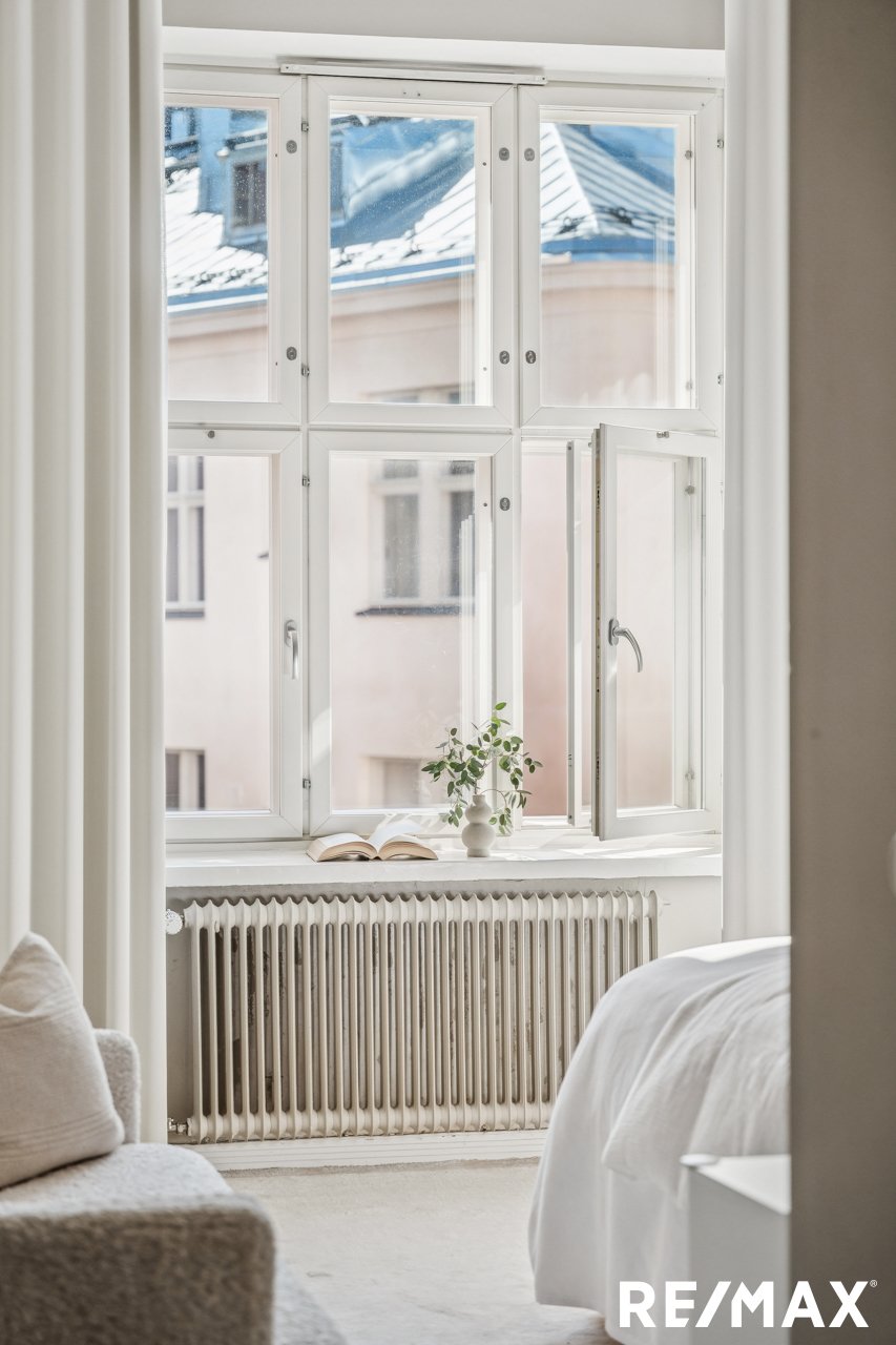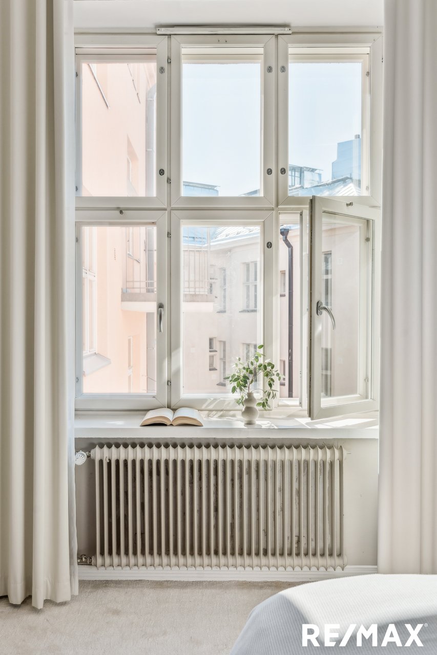 Asunnon korkeat huoneet ja suuret ikkunat tuovat sisään runsaasti luonnonvaloa, luoden avaran ja ilmavan tunnelman.