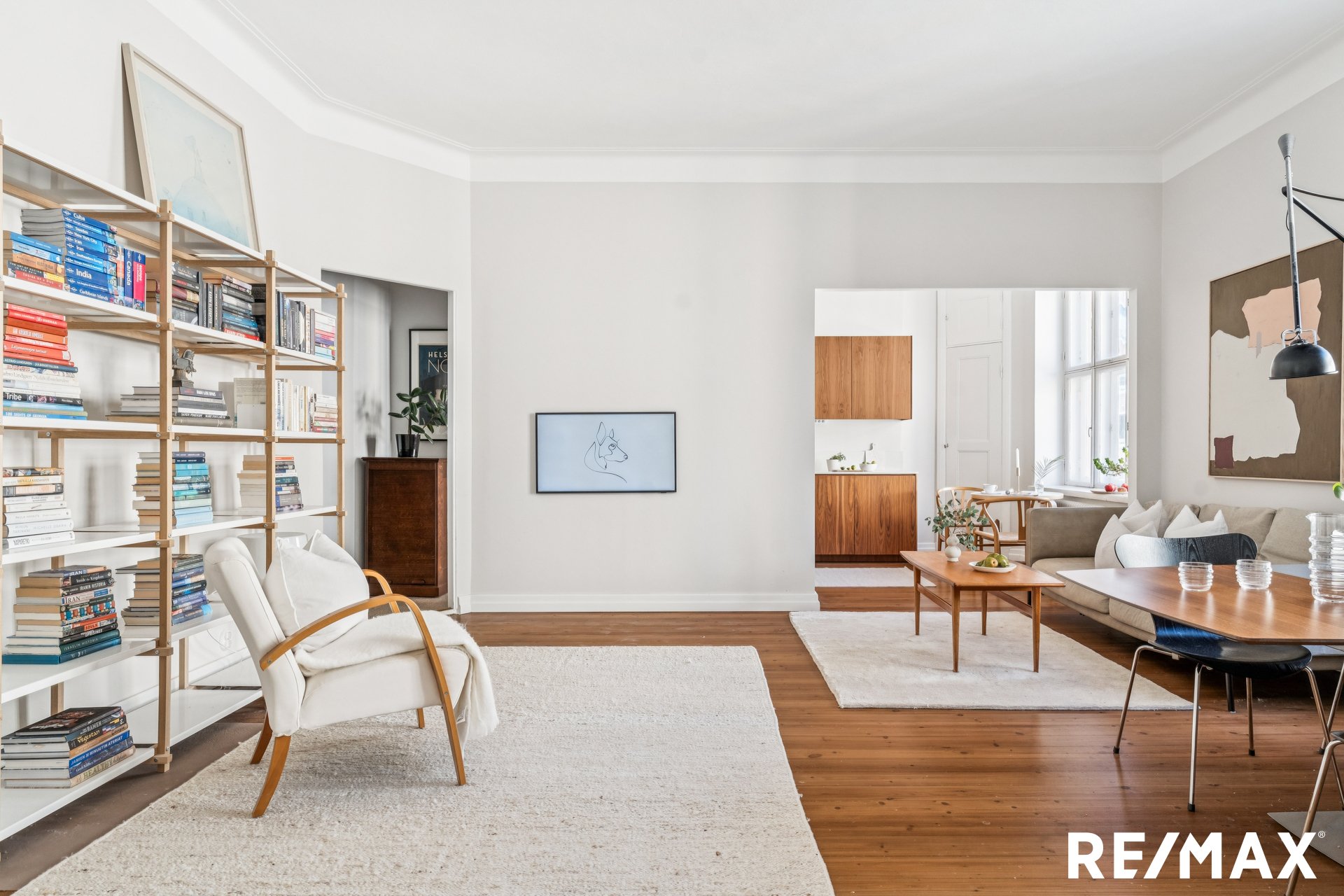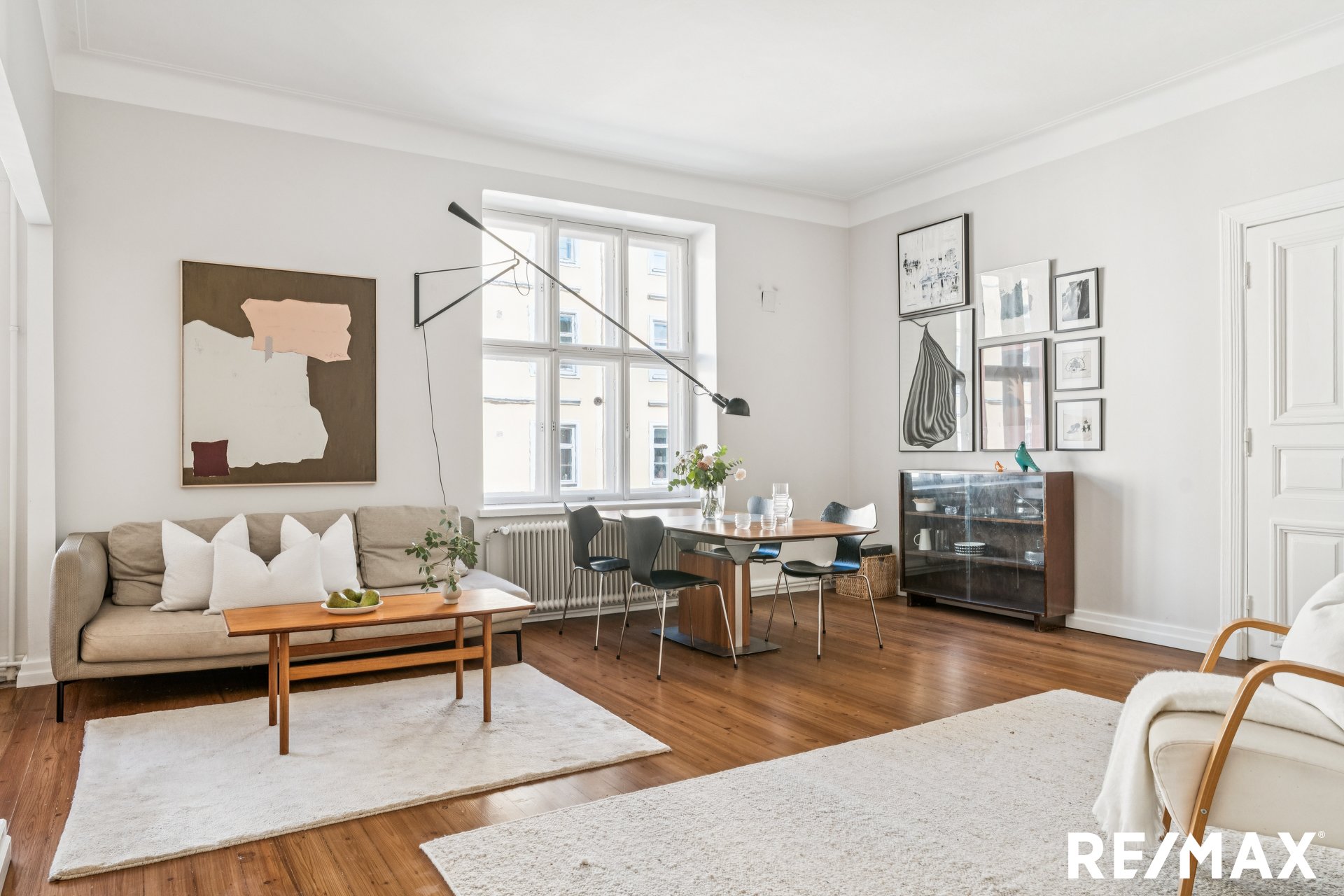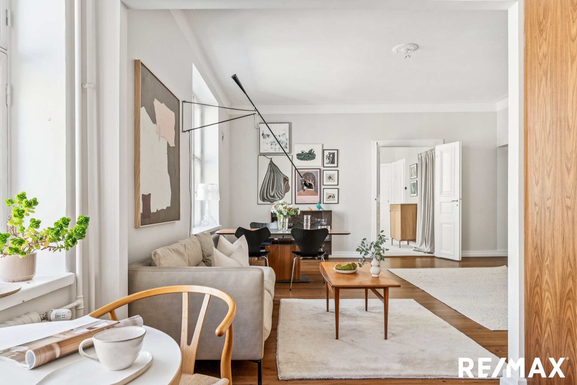 Asunnon korkeat huoneet ja suuret ikkunat tuovat sisään runsaasti luonnonvaloa, luoden avaran ja ilmavan tunnelman.
