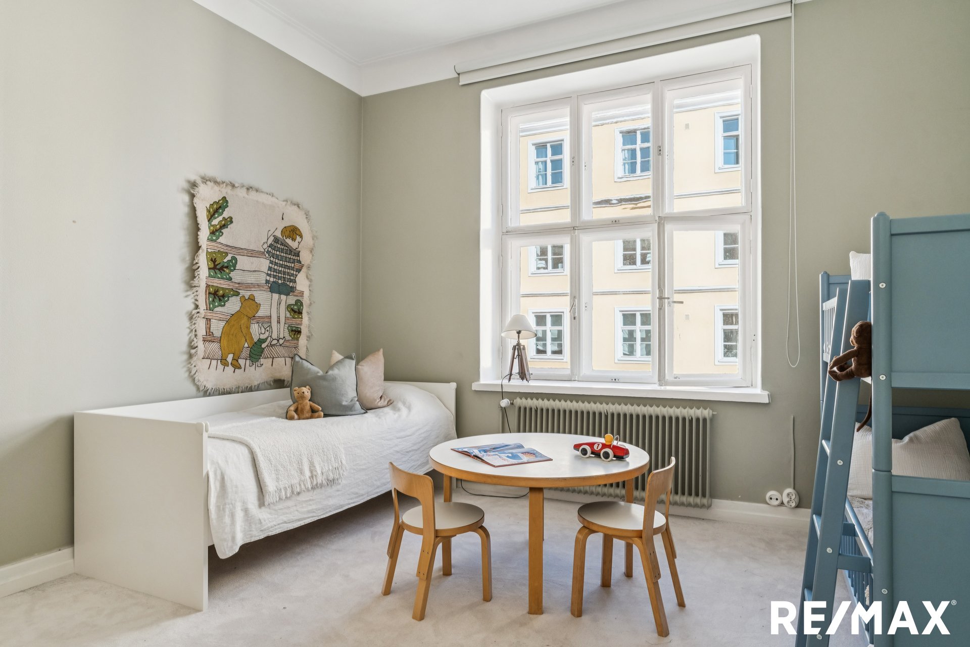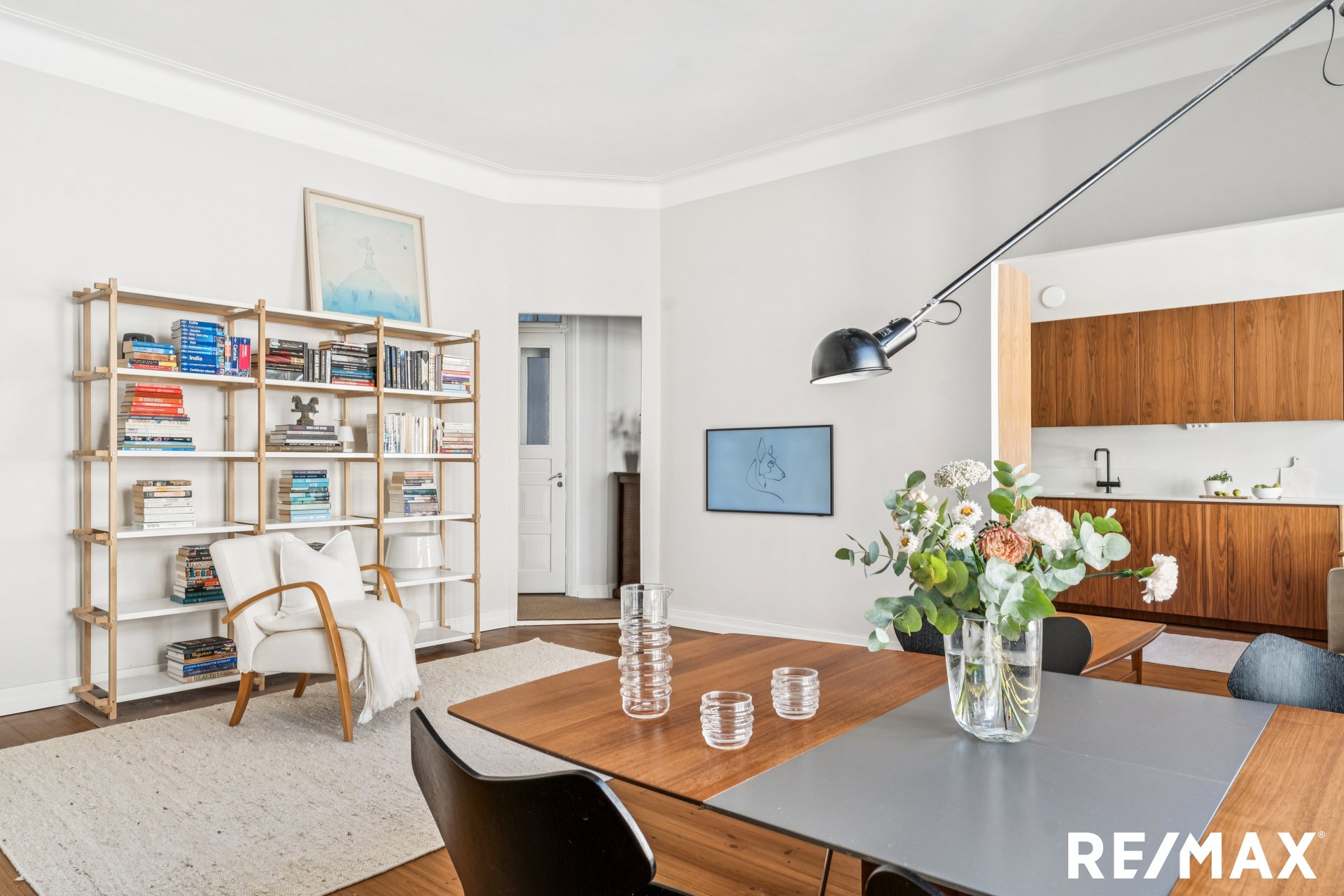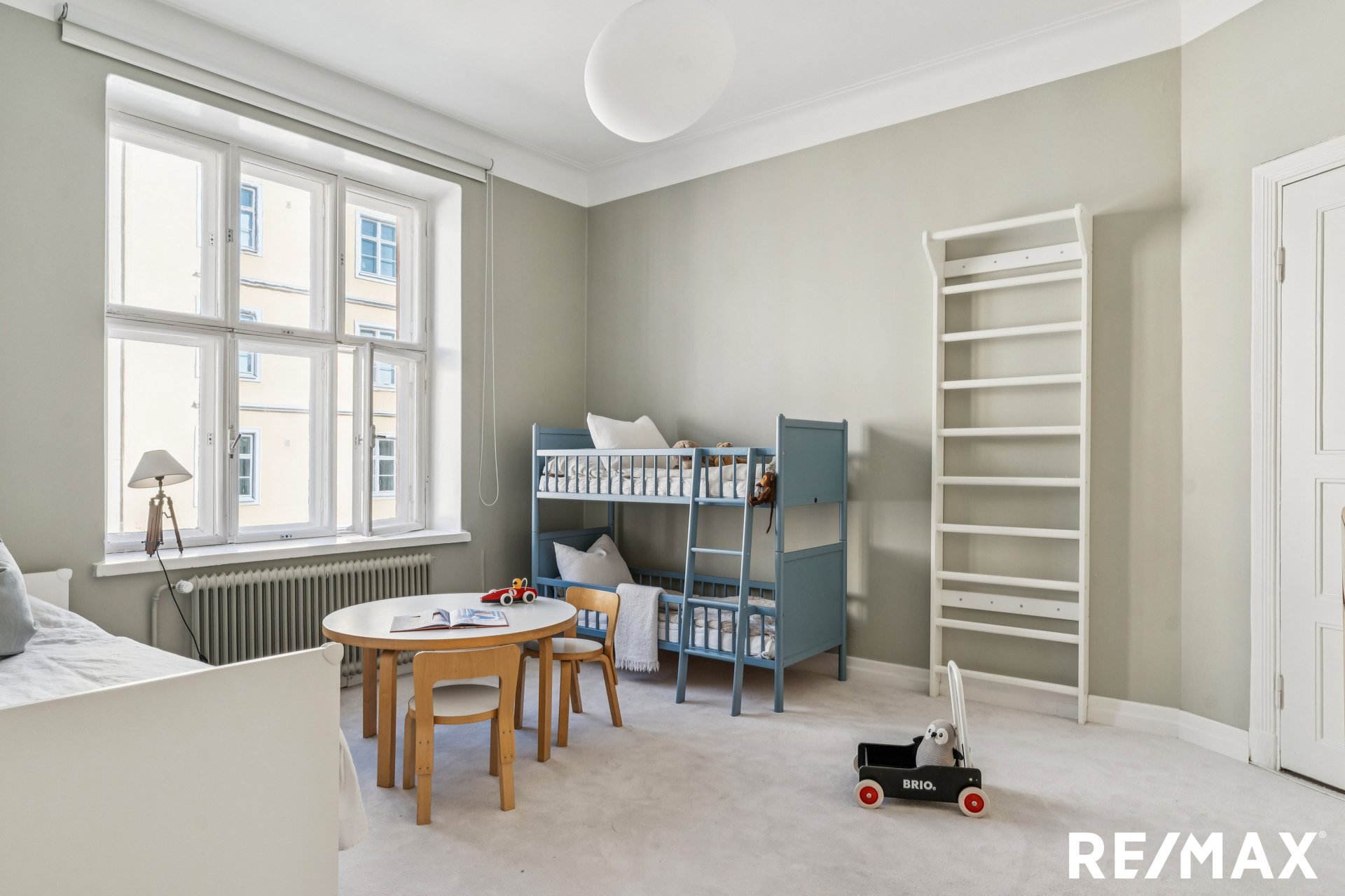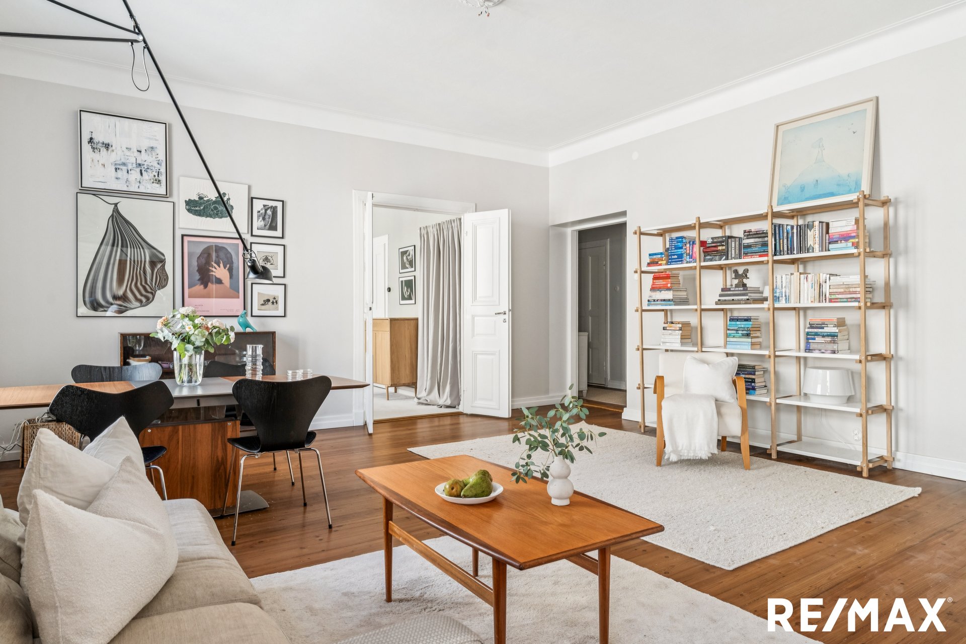 Asunnon korkeat huoneet ja suuret ikkunat tuovat sisään runsaasti luonnonvaloa, luoden avaran ja ilmavan tunnelman.