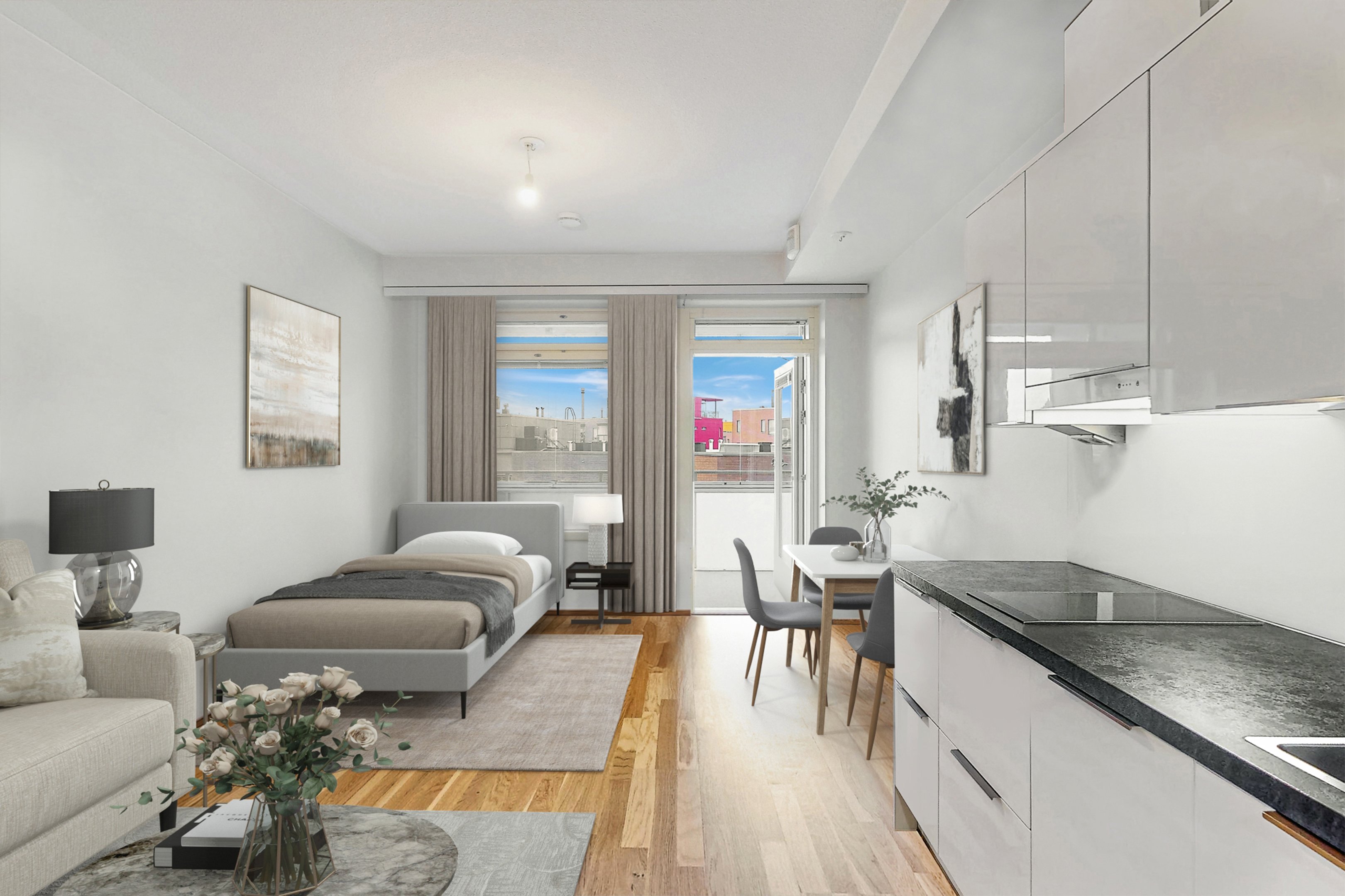 Nyt vuokrattavana valoisa yksiö keskeisellä sijainnilla Vallilan Konepajalta.