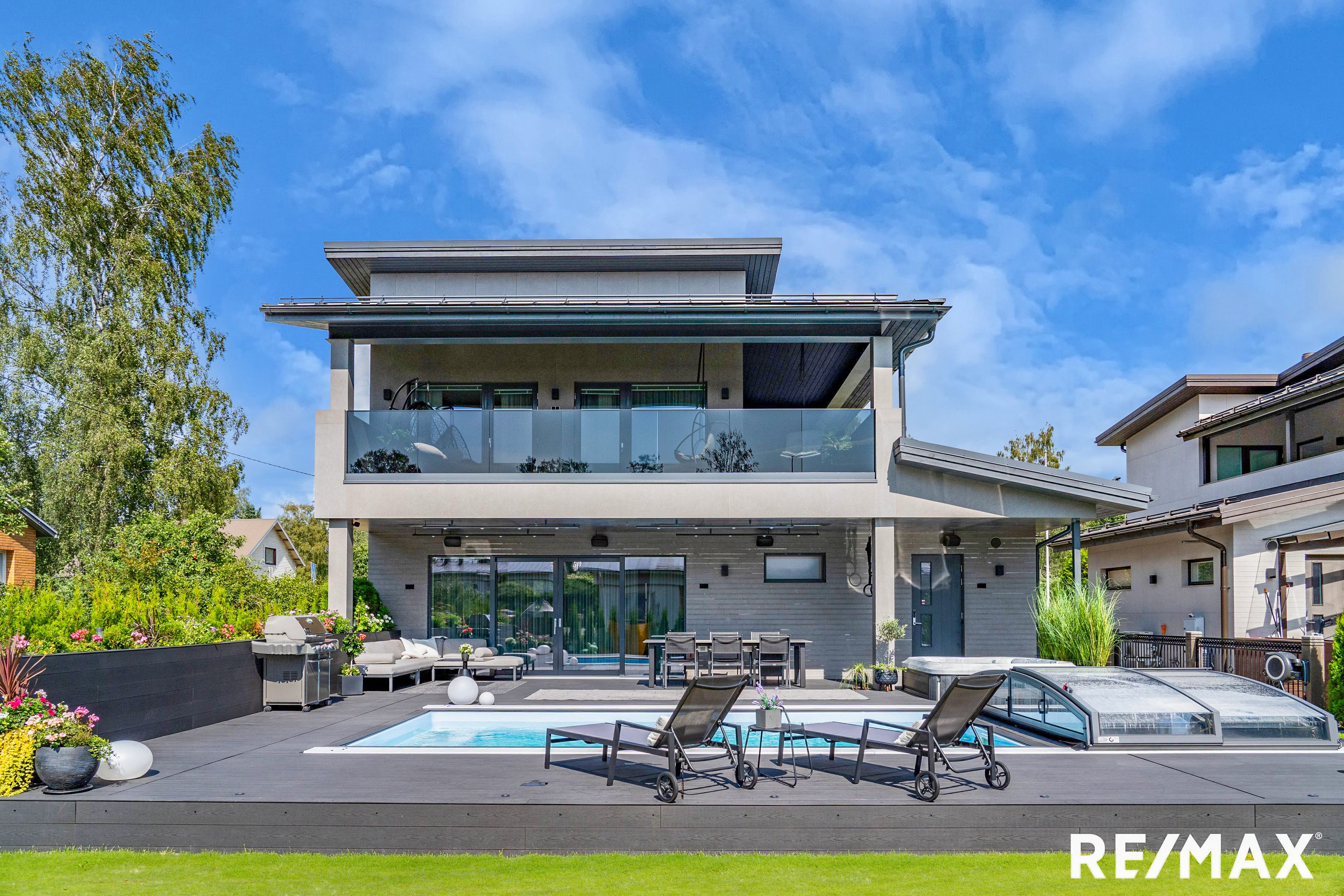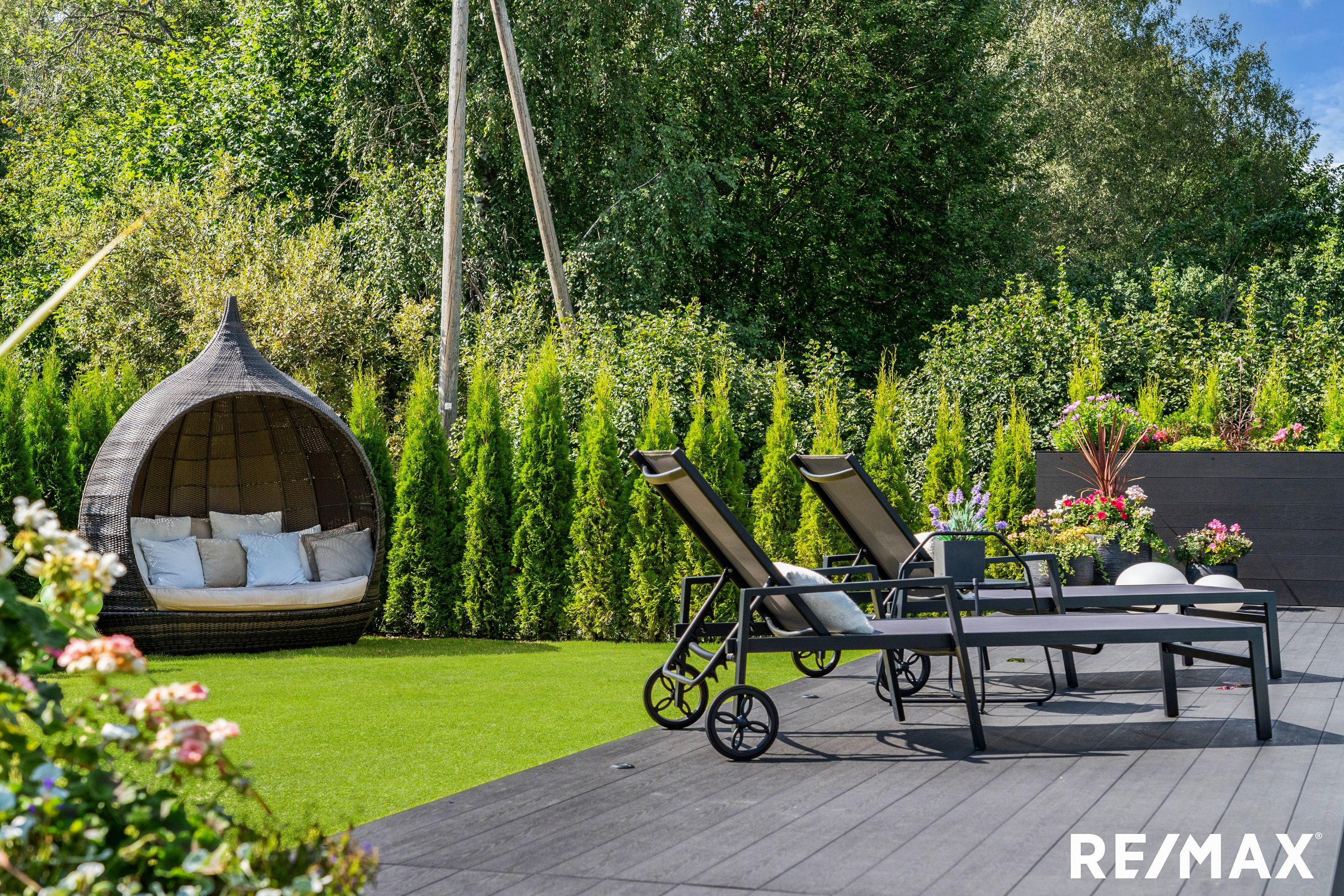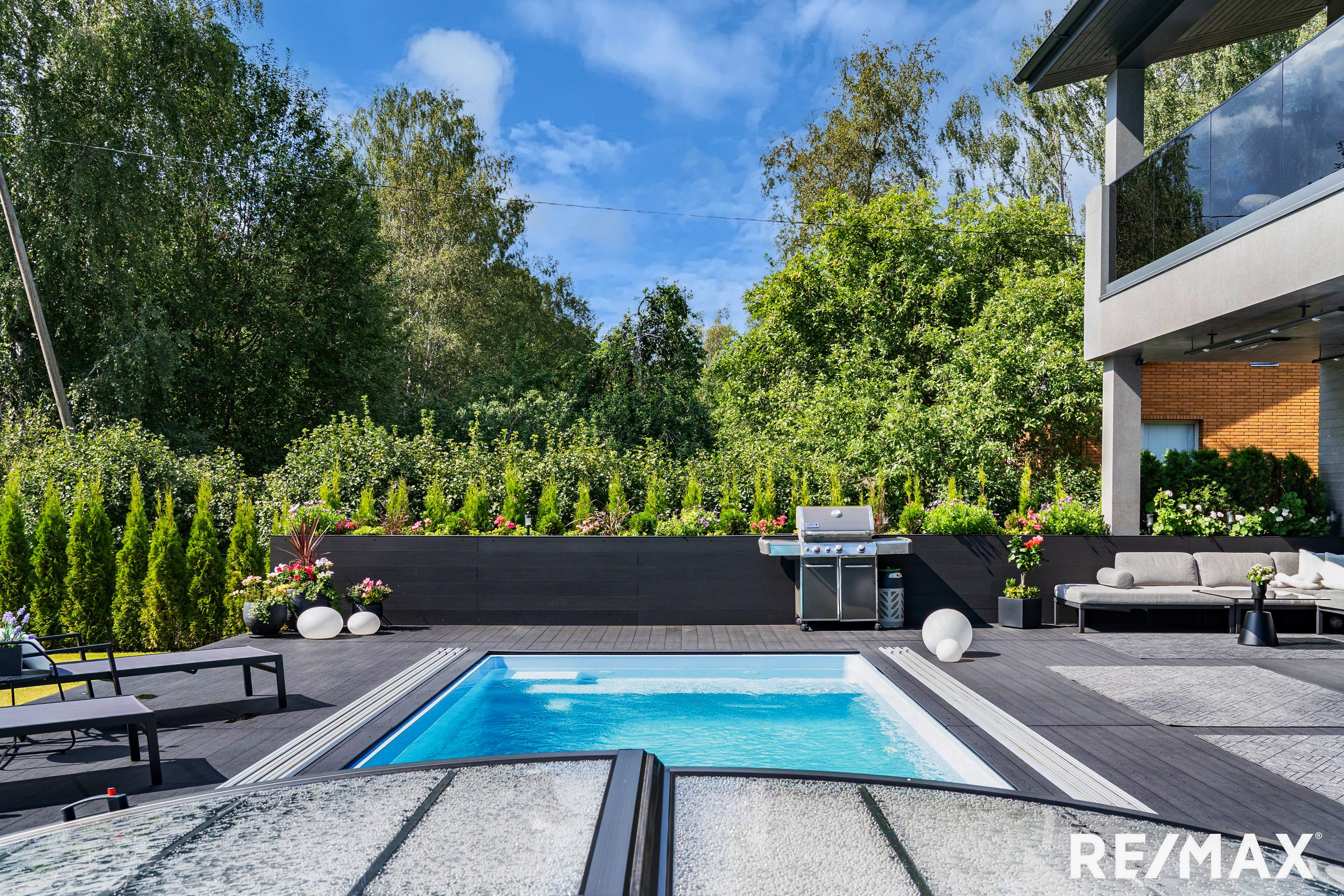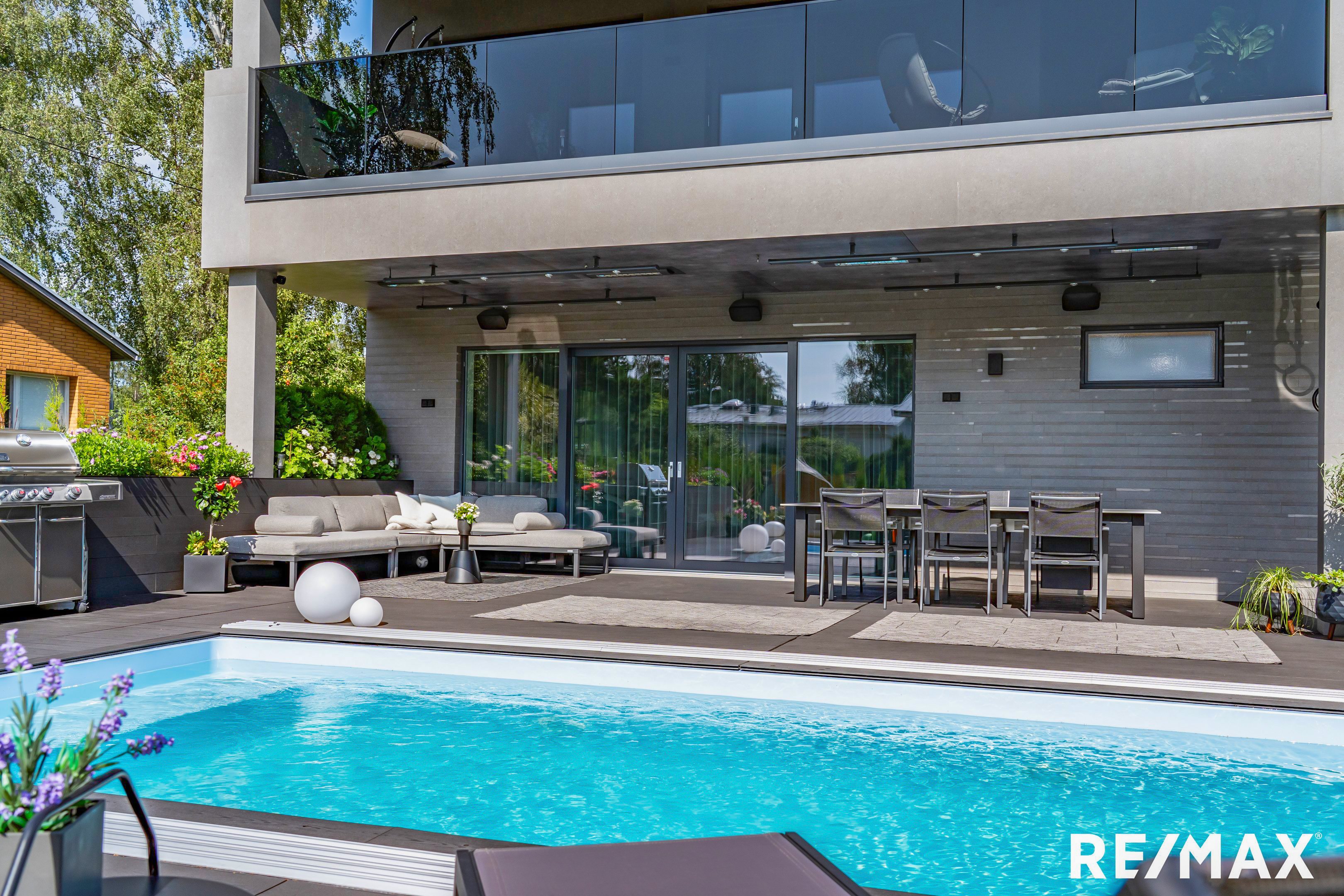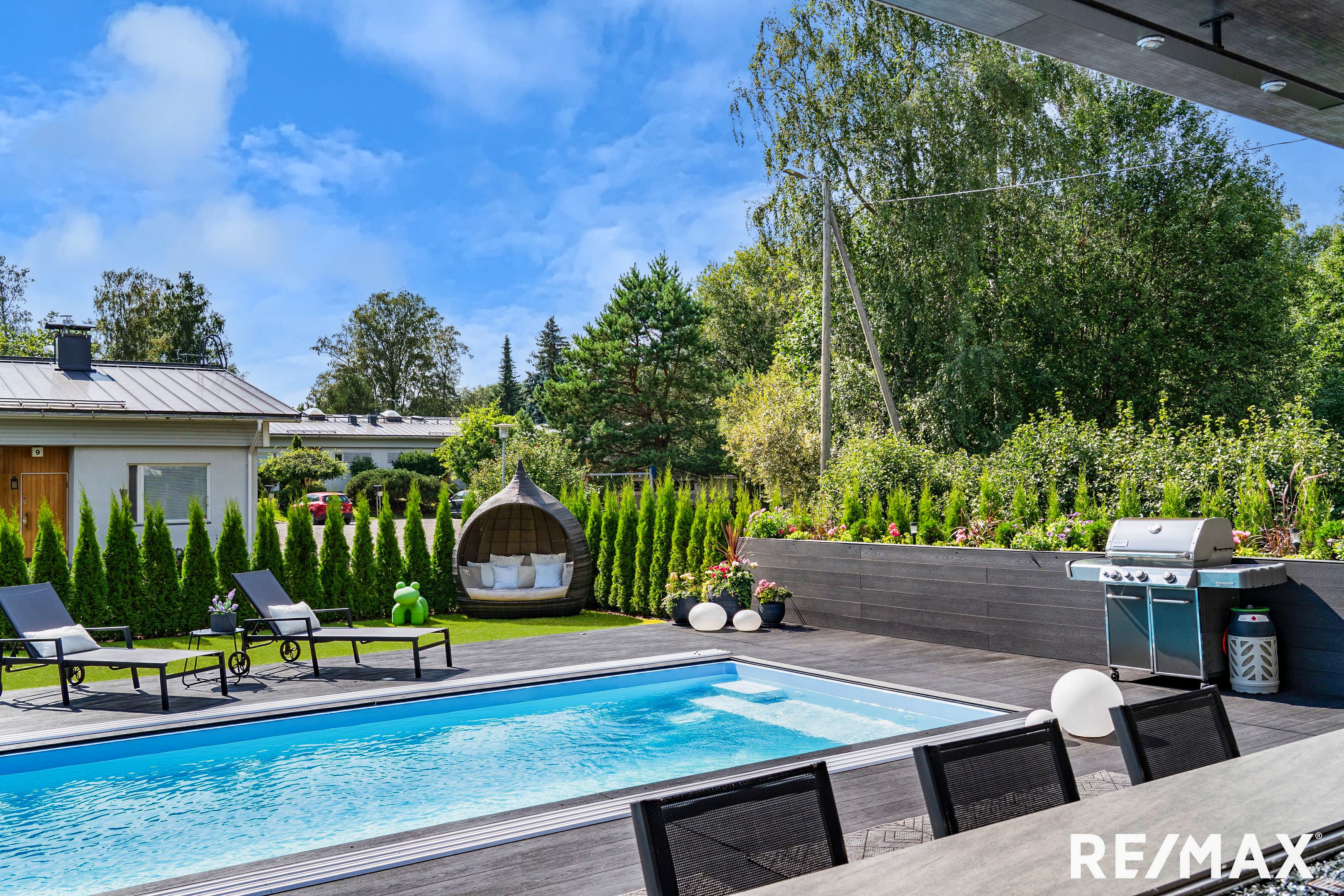 Olohuoneesta on käynti katetulle terassialueelle ja takapihalle. Tilava terassi toimii olohuoneen jatkeena ympäri vuoden, ja siellä voi nauttia kesäpäivistä sekä tunnelmallisista illoista suuremmallakin seurueella. Pihalta löytyy erillinen nurmikkoalue, jatkuvalämmitteinen ulkoporeallas sekä katteella varustettu lämmitettävä vastavirtauima-allas. Tämä koti tarjoaa enemmän kuin osaat kuvitella!