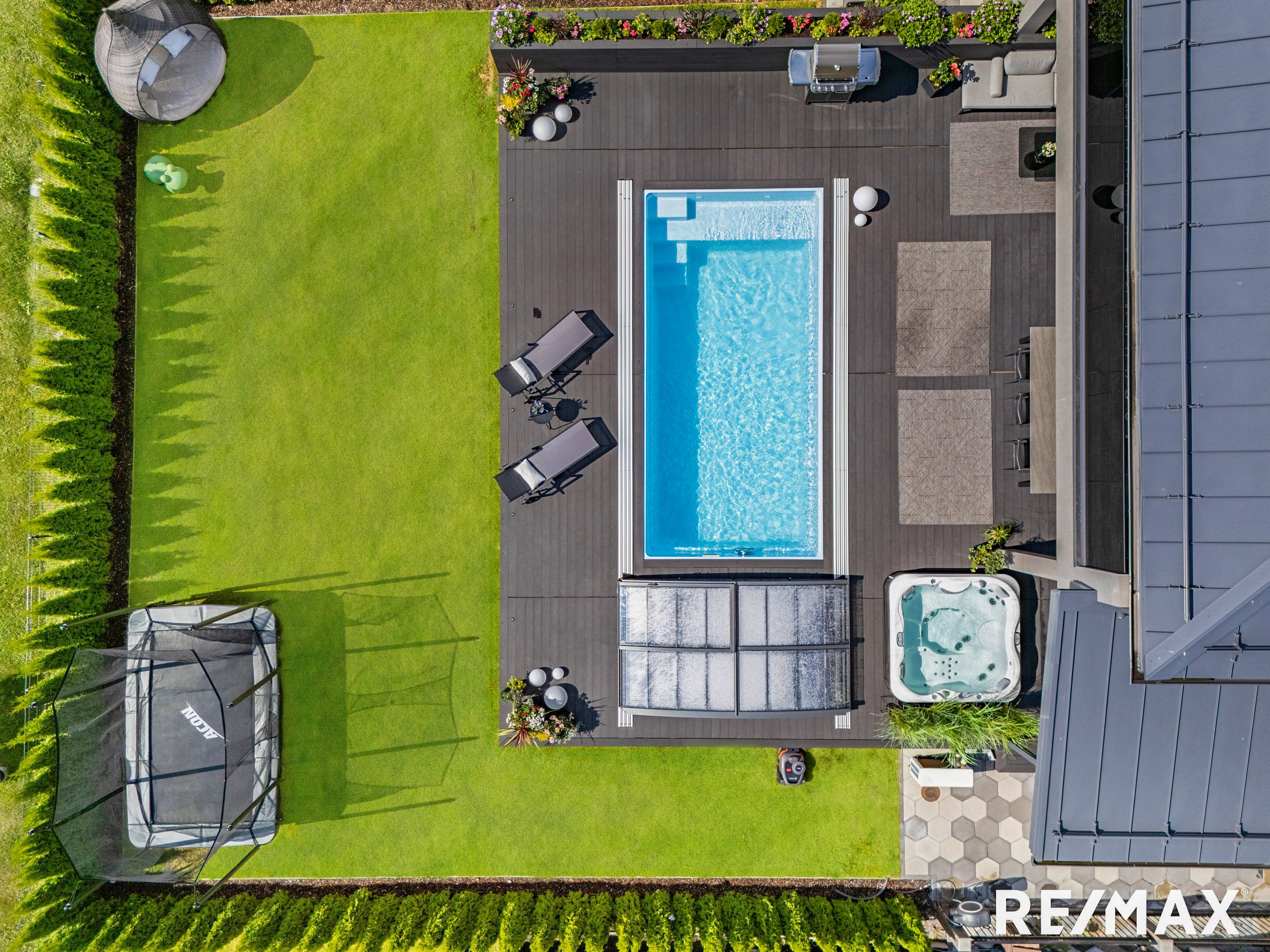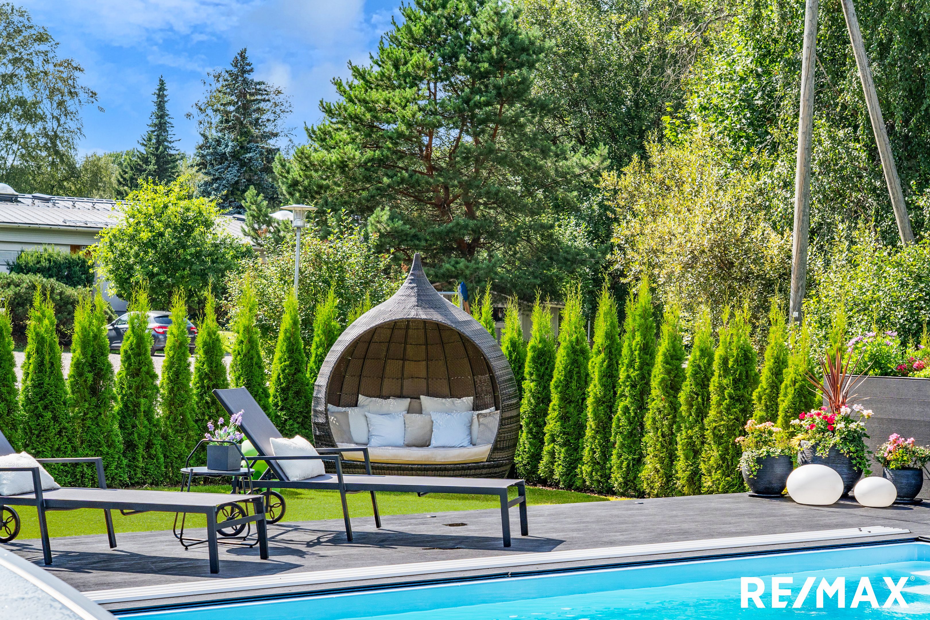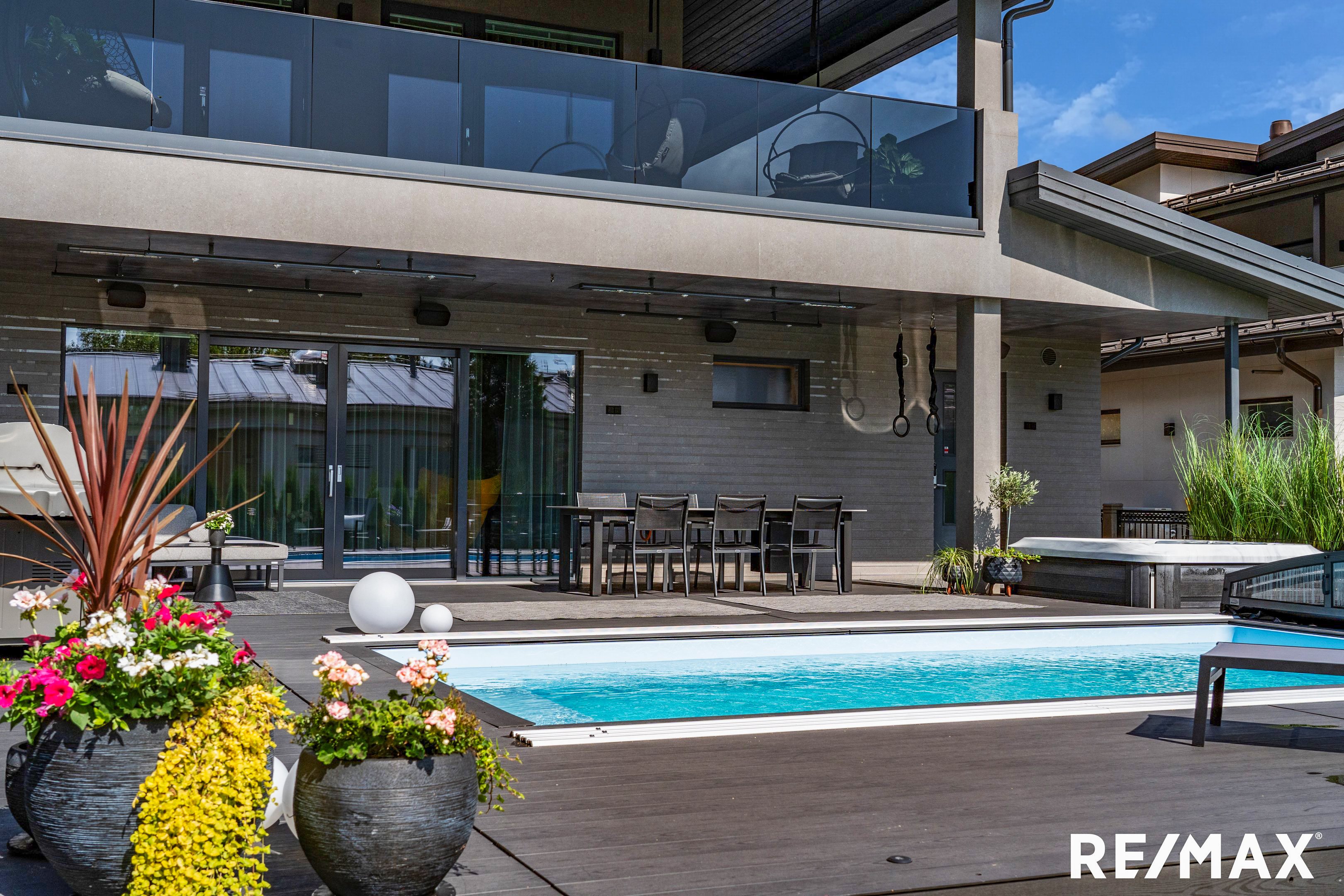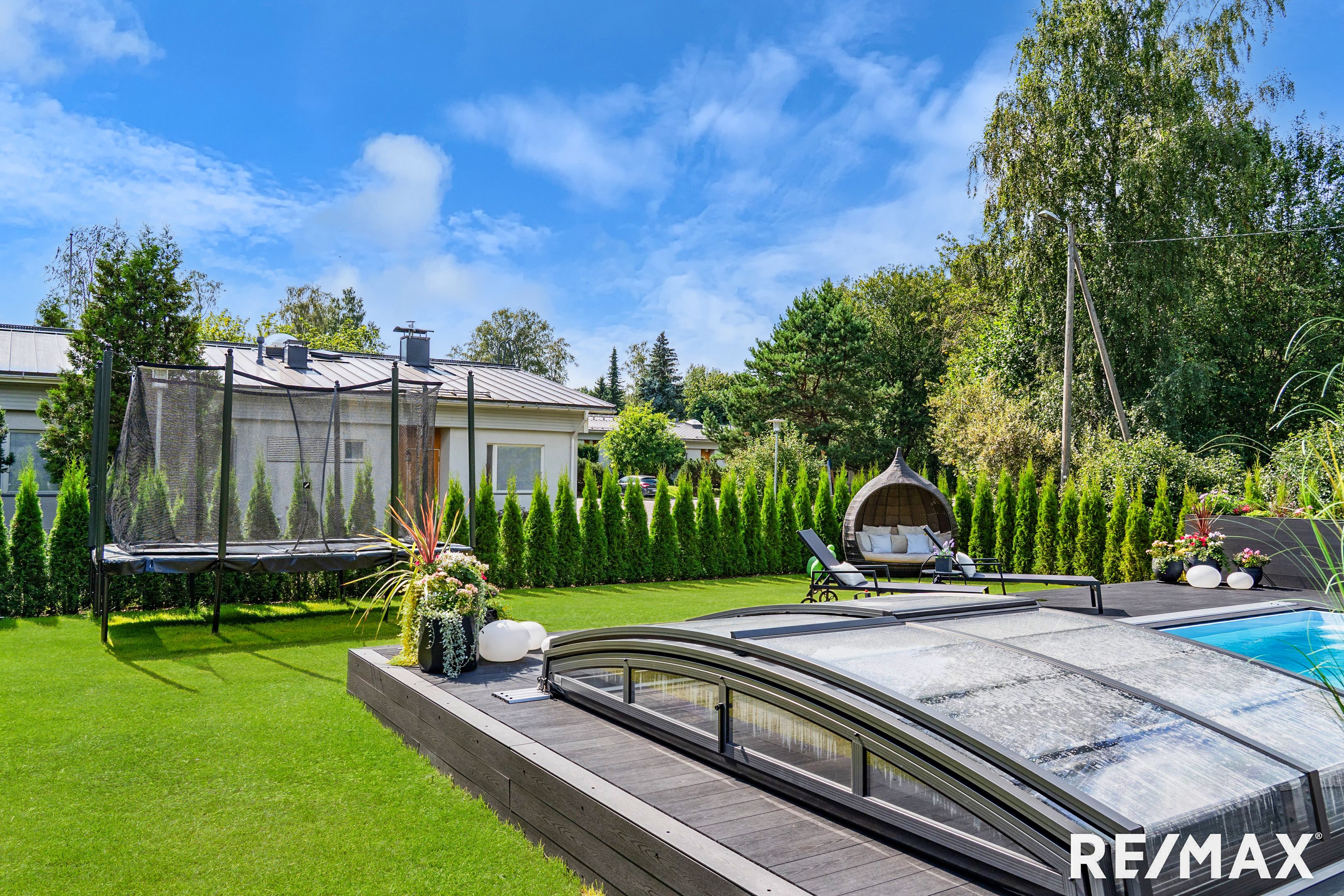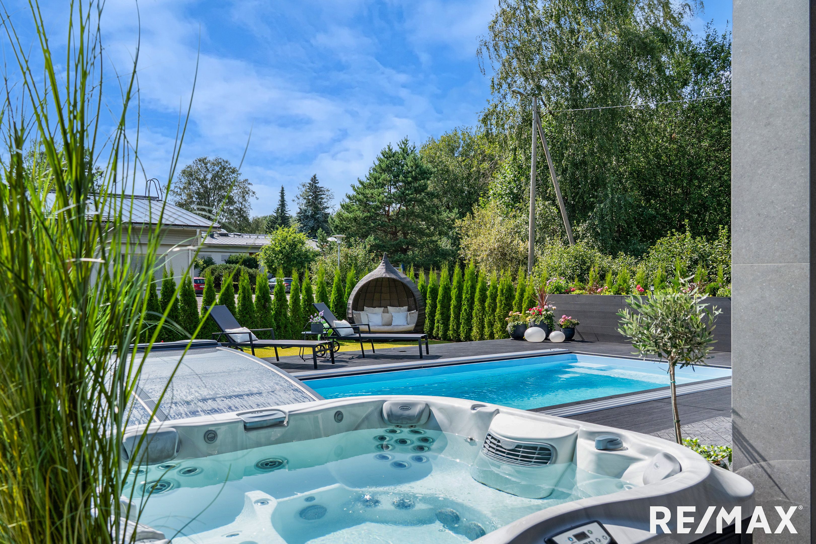 Olohuoneesta on käynti katetulle terassialueelle ja takapihalle. Tilava terassi toimii olohuoneen jatkeena ympäri vuoden, ja siellä voi nauttia kesäpäivistä sekä tunnelmallisista illoista suuremmallakin seurueella. Pihalta löytyy erillinen nurmikkoalue, jatkuvalämmitteinen ulkoporeallas sekä katteella varustettu lämmitettävä vastavirtauima-allas. Tämä koti tarjoaa enemmän kuin osaat kuvitella!